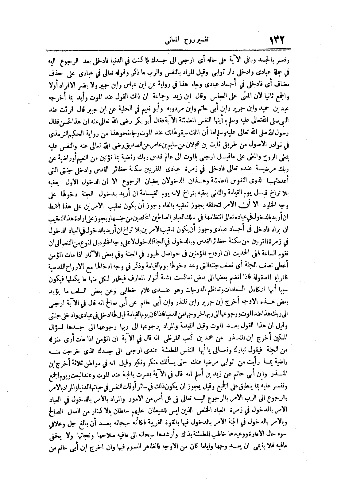 وفسر بالجسد وباقي الآية على حالة أي ارجعي إلى جسدك كما كنت في الدنيا فادخلي بعد الرجوع إليه في جملة عبادي وادخلي دار ثوابي وقيل المراد بالنفس والرب ما ذكر وقوله تعالى في عبادي على حذف مضاف أي فادخلي في أجساد عبادي وجاء هذا في رواية عن ابن عباس وابن جبير ولا يضر الإفراد أولا والجمع ثانيا لأنالمعنى على الجنس وقال ابن زيد وجماعة أن ذلك القول عند الموت وأيد بما أخرجه عبد بن حميد وابن جرير وابن أبي حاتم وابن مردويه وأبو نعيم في الحلية عن ابن جبير قال قرئت عند النبي صلى الله تعالى عليه وسلم يا أيتها النفس المطمئنة الآية فقال أبو بكر رضي الله تعالى عنه إن هذا لحسن فقال رسول الله صلى الله تعالى عليه وسلم أما أن الملك سيقولها لك عند الموت وجاء نحو هذا من رواية الحكيم الترمذي في نوادر الأصول من طريق ثابت بن عجلان عن سليم بن عامر عن الصديق رضي الله تعالى عنه والنفس عليه بمعنى الروح والمعنى على ما قيل ارجعي بالموت إلى عالم قدس ربك راضية بما تؤتين من النعيم أو راضية عن ربك مرضية عنده تعالى فادخلي في زمرة عبادي المقربين سكنة حظائر القدس وادخلي جنتي التي أعددتها لذوي النفوس المطمئنة وهذان الدخولان يعقبان الرجوع إلا أن الدخول الأول يعقبه بلا تراخ قبل يوم القيامة والثاني يعقبه بتراخ لأنه يوم القيامة إن أريد الدخول الجنة دخولها على وجه الخلود إلا أن الأمر لتحققه يجوز تعقيبه بالفاء وجوز أن يكون تعقيب الأمرين على هذا النمط إن أريد بالدخول في عبادة تعالى انتظامها في سلك العباد الصالحين المخلصين من جنسها ويجوز على إرادة هذا التعقيب أن يراد فادخلي في أجساد عبادي وجوز تعقيب الأمرين بلا تراخ أن أريد بالدخول في العباد الدخول في زمرة المقربين من سكنة حظائر القدس وبالدخول في الجنة الدخول لا على وجه الخلود بل لنوع من التنعم إلى أن تقوم الساعة ففي الحديث أن أرواح المؤمنين في حواصل طيور في الجنة وفي بعض الآثار إذا مات المؤمن أعطى نصف الجنة أي نصف جنته التي وعد دخولها يوم القيامة وذكر في وجه إدخالها مع الأرواح القدسية كالمرايا المصقولة فإذا انضم بعضها إلى بعض تعاكست أشعة أنوار المعارف فيظهر لكل منها ما يكملها فيكون سببا أنها لتكامل السعادات وتعاظم الدرجات وهو عندي كلام خطابي وعن بعض السلف ما يؤيد بعض هذه الوجه أخرج ابن جرير وابن المنذر وابن أبي حاتم عن أبي صالح أنه قال في الآية ارجعي إلى ربك هذا عنوا الموتورجوعها إلى ربها خروجها من الدنيا فإذا كان يوم القيامة قيل لها ادخلي في عبادي وادخلي جنتي وقيل أن هذا القول بعد الموت وقبل القيامة والمراد برجوعها إلى ربها رجوعها إلى جسدها لسؤال الملكين أخرج ابن المنذر عن محمد بن كعب القرظي أنه قال في الآية أن المؤمن إذا مات أرى منزله من الجنة فيقول تبارك وتعالى يا أيها النفس المطمئنة عندي ارجعي إلى جسدك الذي خرجت منه راضية بما رأيت من ثوابي مرضيا عنك حتى يسألك منكر ونكير وقيل أنه في مواطن ثلاثة أخرج ابن المنذر وابن أبي حاتم عن زيد بن أسلم أنه قال في الآية بشرت بالجنة عند الموت وعند البعث ويوم الجمع وتفسر عليه بما ينطبق على الجميع وقيل يجوز أن يكون ذلك في سائر أوقات النفس في حياتها الدنيا والمراد بالأمر بالرجوع إلى الرب الأمر بالرجوع إليه تعالى في كل أمر من الأمور والمراد بالأمر بالدخول في العباد الأمر بالدخول في زمرة العباد الخلص الذين ليس للشيطان عليهم سلطان بالإكثار من العمل الصالح وبالأمر بالدخول في الجنة الأمر بالدخول فيها بالقوة القريبة فكأنه سبحانه بعد أن بالغ جل وعلا في سوء حال الإمارة ووعيدها خاطب المطمئنة بذاك وأرشدها سبحانه إلى ما فيه صلاحها ونجاتها ولا يخفى ما فيه فلا ينبغي أن يعد وجها وأيا ما كان من الأوجه فالظاهر العموم فيها وإن أخرج ابن أبي حاتم من