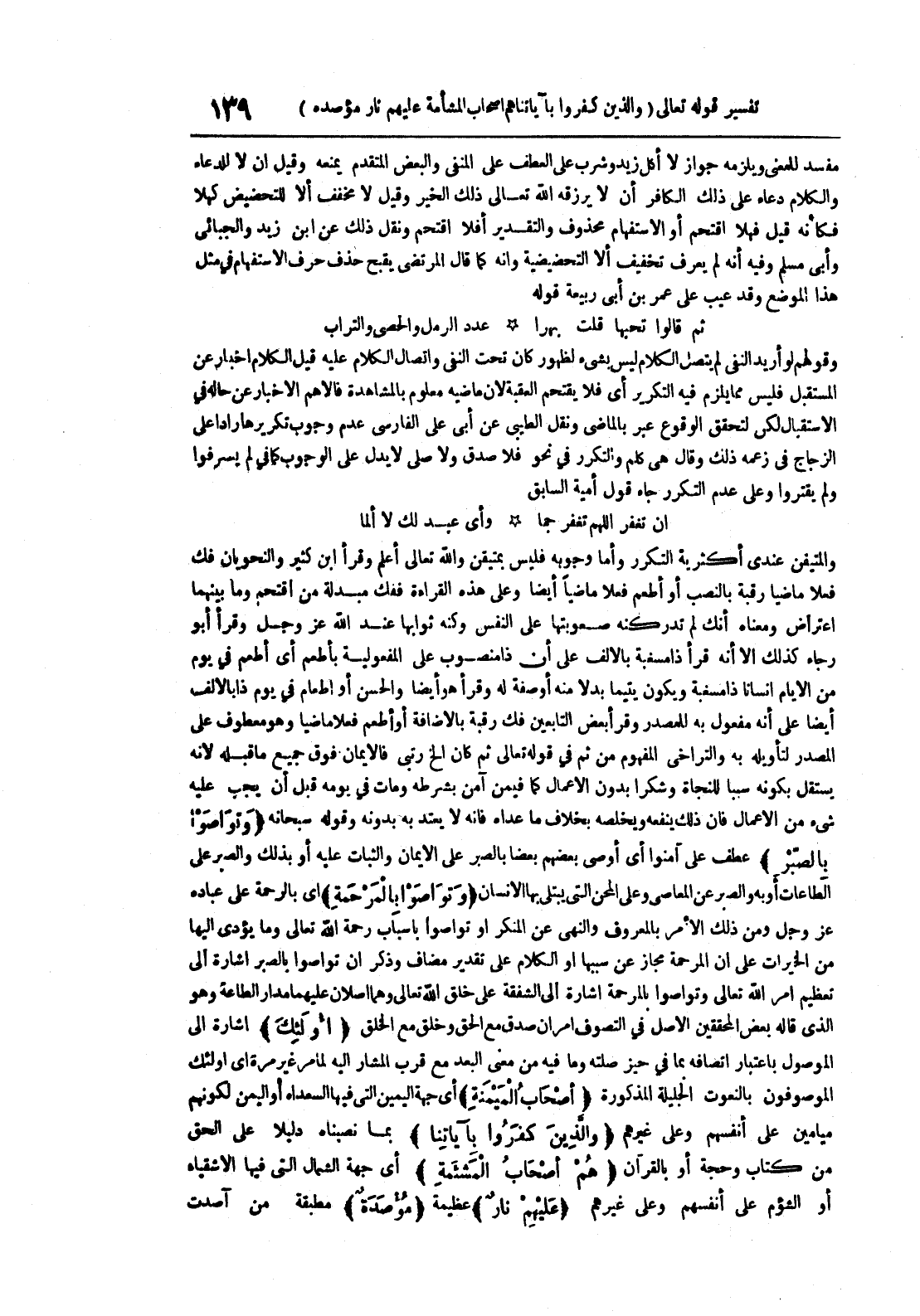 وأي عبد لك لا ألما والمتيقن عندي أكثرية التكرر وأما وجوبه فليس بمتيقن والله تعالى أعلم وقرأ ابن كثير والنحويان فك فعلا ماضيا رقبة بالنصب أو أطعم فعلا ماضيا وعلى هذه القراءة ففك مبدلة من اقتحم وما بينهما اعتراض ومعناه أنك لم تدركنه صعوبتها على النفس وكنه ثوابها عند الله عز و جل وقرأ أبو رجاء كذلك إلا أنه قرأ ذا مسبغة بالألف على أن ذا منصوب على المفعولية بأطعم أي أطعم في يوم من الأيام إنسانا ذا مسبغة يتيما بدلا منه أو صفة له وقرأ هو أيضا والحسن أو إطعام في يوم ذا بالألف أيضا على أنه مفعول به للمصدر وقرأ بعض التابعين فك رقبة بالإضافة أو أطعم فعلا ماضيا وهو معطوف على المصدر لتأويله به والتراخي المفهوم من ثم في قوله تعالى ثم كان الخ رتبي فالإيمان فوق جميع ما قبله لأنه يستقبل بكونه للنجاة وشكرا بدون الأعمال كما فيمن آمن بشرطه ومات في يومه قبل أن يجب عليه شيء من الأعمال فإن ذلك ينفعه ويخلصه بخلاف ما عداه فإنه لا يعتد به بدونه وقوله سبحانه وتواصوا بالصبر عطف على آمنوا أي أوصى بعضهم بعضا بالصبر على الإيمان والثبات عليه أو بذلك والصبر على الطاعات أو به والصبر على المعاصي وعلى المحن التي يبتلى بها الإنسان وتواصوا بالمرحمة أي بالرحمة على عباده عز و جل ومن ذلك الأمر بالمعروف والنهي عن المنكر أو تواصوا بأسباب رحمة الله تعالى وما يؤدي إليها من الخيرات على أن المرحمة مجاز عن سببها أو الكلام على تقدير مضاف وذكر أن تواصوا بالصبر إشارة إلى تعظيم أمر الله تعالى وتواصوا بالمرحمة إشارة إلى الشفقة على خلق الله تعالى وهما أصلان عليهما مدار الطاعة وهو الذي قاله بعض المحققين الأصل في التصوف أمر إن أصدق مع الحق وخلق مع الخلق أولئك إشارة إلى أن الموصول باعتبار اتصافه بما في حيز صلته وما فيه من معنى البعد معقرب المشار إليه لما مر غير مرة أي أولئك الموصوفون بالنعوت الجليلة المذكورة أصحاب الميمنة أي جهة اليمين التي فيها السعداء أو اليمن لكونهم ميامين على أنفسهم وعلى غيرهم والذين كفروا بآياتنا بما نصبناه دليلا على الحق من كتاب وحجة أو بالقرآن هم أصحاب المشئمة أي جهة الشمال التي فيها الأشقياء أو الشؤم على أنفسهم وعلى غيرهم عليهم نار عظيمة مؤصدة مطبقة من أصدت