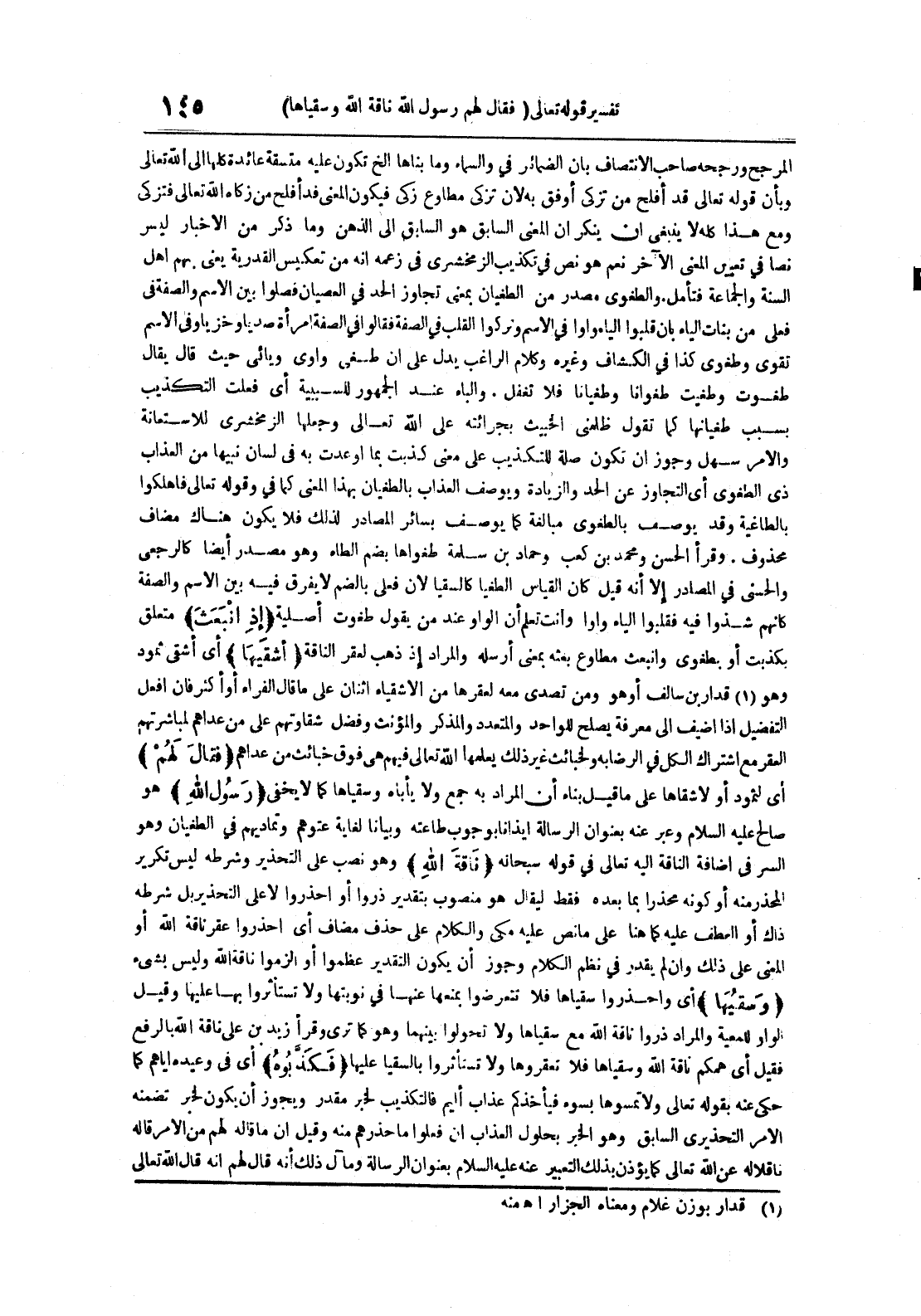 المرجح ورجحه صاحب الانتصاف بأن الضمائر في السماء وما بناها الخ تكون عليه متسقة عائدة كلها إلى الله تعالى وبأن قوله تعالى قد أفلح من تزكى أوفق به لأن تزكي مطاوع زكي فيكون المعنى قد أفلح من زكاه الله تعالى فتزكى ومع هذا كله لا ينبغي أن ينكر أن المعنى هو السابق إلى الذهن وما ذكر من الأخبار ليس نصا في تعيين المعنى الآخر نعم هو نص في تكذيب الومخشري في زعمه أنه من تعكيس القدرية يعني بهم أهل السنة والجماعة فتأمل والطغوى مصدر من الطغيان بمعنى تجاوز الحد في العصيان فصلوا بين الاسم والصفة في فعلى من بنات الياء بأن قلبوا الياء واوا في الأسم وتركوا القلب في الصفة فقالوا في الصفة امرأة صديا وخزياوفي الاسم تقوى وطغوى كذا في الكشاف وغيره وكلام الراغب يدل على أن طغى واوي ويأبى حيث قال يقال طغوت وطغيت طغوانا وطغيانا فلا تغفل والباء عند الجمهور للسببية أي فعلت التكذيب بسبب طغيانها كما تقول ظلمني الخبيث بجرائته على الله تعالى وجعلها الزمخشري للأستعانة والأمر سهل وجوز أن تكون صلة للتكذيب على معنى كذبت بما أوعدت به في لسان نبيها من العذاب ذي الطغوى أي التجاوز عن الحد والزيادة ويوصف العذاب بالطغيان بهذا المعنى كما في قوله تعالى فأهلكوا بالطاغية وقد يوصف بالطغوى مبالغة كما يوصف بسائر المصادر لذلك فلا يكون هناك مضاف محذوف وقرأ الحسن ومحمد بن كعب وحماد بن سلمة طغواها بضم الطاء وهو مصدر أيضا كالرجعي والحسني في المصادر إلا أنه قيل كان القياس الطغيا كالسقيا لأن فعلى بالضم لا يقرق فيه بين الأسم والصفة كأنهم شذوا فيه فقلبوا الياء واوا وأنت تعلم أن الواو عند من يقول طغوت أصلية إذ انبعث متعلق بكذبت أو بطغوى وانبعث مطاوع بعثه بمعنى أرسله والمراد إذ ذهب لعقر الناقه أشقيها أي أشقي تمود وهو قدار بن سالف أو هو ومن تصدى معه لعقرها من الأشقياء اثنان على ما قال الفراء أو أكثر فإن أفعل التفضيل إذا أضيف إلى معرفة يصلح للواحد والمتعدد والمذكر والمؤنث وفضل شقاوتهم على من عداهم لمباشرتهم العقر مع اشتراك الكل في الرضا به ولخبائث غير ذلك يعلمها الله تعالى فيهم هي فوق خبائث من عداهم فقال لهم أي لثمود أو لأشقانا على ما قيل بناء على أن المراد به جمع ولا يأباه وسقياها كما لا يخفى رسول الله هو صالح عليه السلام وعبر عنه بعنوان الرسالة إيذانا بوجوب طاعته وبيانا لغايه عتوهم وتماديهم في الطغيان وهو السر في إضافة الناقة إليه تعالى في قوله سبحانه ناقة الله وهو نصب على التحذير وشرطه ليس المحذر منه أو كونه محذرا بما يعده فقط ليقال هو منصوب بتقدير ذروا أو احذروا لا على التحذير بلى شرطه ذاك أو العطف عليه كما هنا على ما نص عليه مكي والكلام على حذف مضاف أي احذروا عقر ناقة الله أو بالمعنى على ذلك وإن لم يقدر في نظم الكلام وجوز أن يكون التقدير عظموا أو ألزموا ناقة الله وليس بشيء وسقيها أي واحذروا سقياها فلا تتعرضوا بمنعها عنها في نوبتها ولا تستأثروا بها عليها وقيل الواو للمعية والمراد ذروا ناقة الله مع سقياها ولا تحولوا بينهما وهو كما ترى وقرأ زيد بن علي ناقة الله بالرفع فقيل أي همكم ناقة الله وسقياها فلا تعقروها ولا تستأثروا بالسقيا عليها فكذبوه أي في وعيده إياهم كما حكى عنه بقوله تعالى ولا تمسوها بسوء فيأخذكم عذاب أليم فالتكذيب لخبر مقدر ويجوز أن يكون لخبر تضمنه الأمر التحذيري السابق وهو الخبر بحلول العذاب إن فعلوا ما حذرهم منه وقيل إن ما قاله لهم من الأمر قاله ناقلا له عن الله تعالى كما يؤذن بذلك التعبير عنه عليه السلام بعنوان الرسالة ومآل ذلك أنه قال لهم أنه قال الله تعالى
