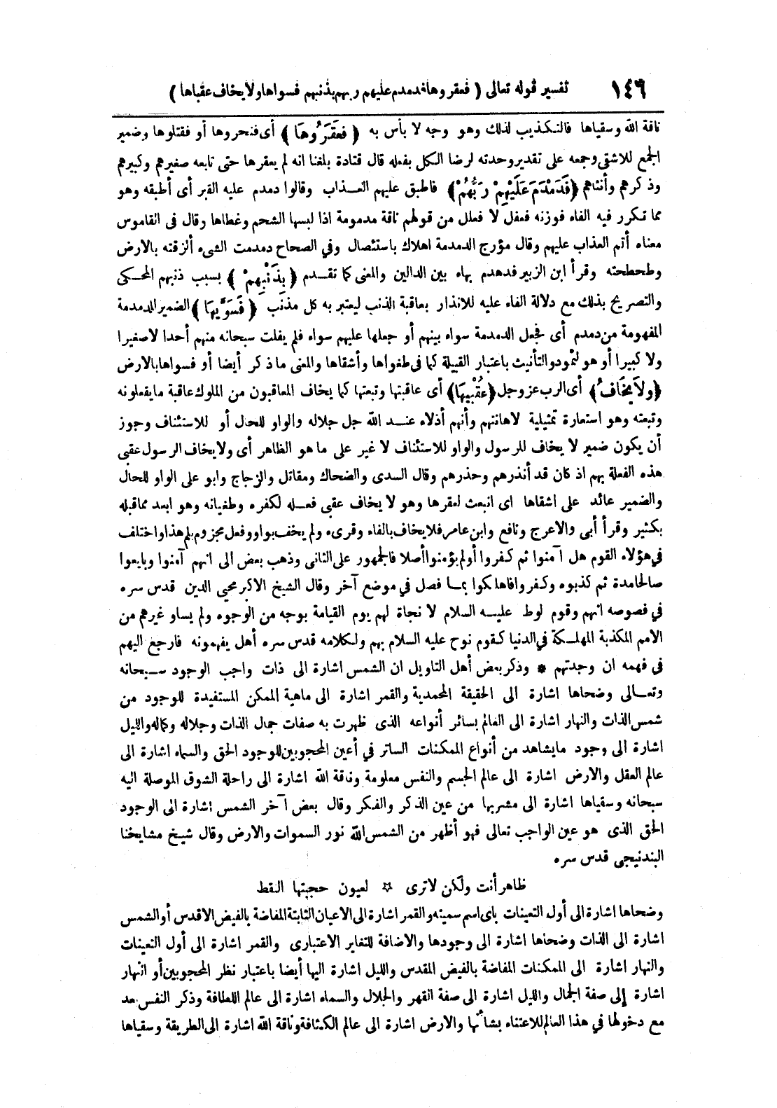 لعيون حجبتها النقط وضحاها إشارة إلى أول التعينات بأي اسم سميته والقمر إشارة إلى الأعيان الثابتة المفاضة بالفيض الأقدس أو الشمس إشارة إلى الذات وضحاها إشارة إلى وجودها والإضافة للتغاير الأعتباري والقمر إشارة إلى أول التعينات والنهار إشارة إلى الممكنات المفاضة بالفيض المقدس والليل إشارة إليها أيضا باعتبار نظر المحجوبين أو النهار إشارة إلى صفة الجمال والليل إشارة إلى صفة القهر والجلال والسماء إشارة إلى عالم اللطافة وذكر النفس بعد دخولها في هذا العالم للأعتناء بشأنها والأرض إشارة إلى عالم الكثافة وناقة الله إشارة إلى الطريقة وسقياها