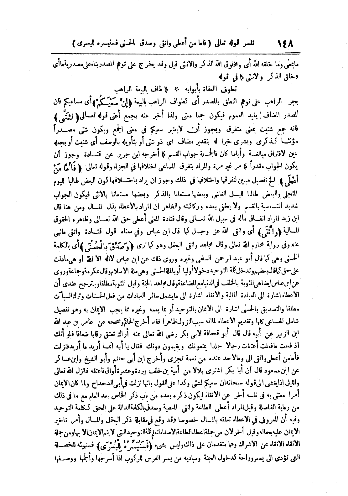 كما طاف بالبيعة الراهب بجر الراهب على توهم النطق بالمصدر أي كطواف الراهب بالبيعة إن سعيكم أي مساعيكم فإن المصدر المضاف يفيد العموم فيكون جمعا معنى ولذا أخبر عنه بجمع أعني قوله تعالى لشتى فإنه جمع شتيت بمعنى متفرق ويجوز أن لا يعتبر سعيكم في معنى الجمع ويكون شتى مصدرا مؤنثا كذكرى وبشرى خبرا له بتقدير مضاف أي ذو شتى أو بتأويله بالوصف أي شتيت أو بجعله عين الأفتراق مبالغة وأيا ما كان فالجملة جواب القسم كما أخرجه ابن جرير عن قتادة وجوز أن يكون الجواب مقدرا كما مر مرة والمراد بتفرق المساعي اختلافها في الجزاء وقوله تعالى فأما من أعطى الخ تفصيل مبين لتفرقها واختلافها في ذلك وجوز أن يراد باختلافها كون البعض طالبا لليوم المتجلي والبعض طالبا لليل الغاشي وبعضها مستعانا بالذكر وبعضها مستعانا بالأنثى فيكون الجواب شديد المناسبة بالقسم ولا يخفى بعده وركاكته والظاهر أن المراد بالإعطاء بذل المال ومن هنا قال ابن زيد المراد إنفاق ماله في سبيل الله تعالى وقال قتادة المعنى أعطى حق الله تعالى وظاهره الحقوق المالية واتقى أي واتقى الله عز و جل كما قال ابن عباس وفي معناه قول قتادة واتقى ما نهى عنه وفي رواية محارم الله تعالى وقال مجاهد واتقى البخل وهو كما ترى وصدق بالحسنى أي بالكلمة الحسنى وهي كما قال أبو عبد الرحمن السلمي وغيره وروي ذلك عن ابن عباس لا إله إلا الله أو هي ما دلت على حق كما قال بعضهم وتدخل كلمة التوحيد دخولا أوليا أو بالملة الحسنى وهي ملة الإسلام وقال عكرمة وجماعة وروي عن ابن عباس أيضا هي المثوبة بالخلف في الدنيا مع المضاعفة وقال مجاهد الجنة وقيل المثوبة مطلقا ويترجح عندي أن الإعطاء إشارة إلى العبادة والأتقاء إشارة إلى ما يشمل سائر العبادات من فعل الحسنات وترك السيآت مطلقا والتصديق بالحسنى إشارة إلى الإيمان بالتوحيد أو بما يعمه وغيره مما يجب الإيمان به وهو تفصيل شامل للمساعي كلها وتقديم الإعطاء لما أنه سبب النزول ظاهرا فقد أخرج الحاكم وصححه عن عامر بن عبد الله ابن الزبير عن أبيه قال قال أبو قحافة لأبي بكر رضي الله تعالى عنه أراك تعتق رقابا ضعافا فلو أنك إذ فعلت ما فعلت أعتقت رجالا جلدا يمنعونك ويقيمون دونك فقال يا أبه إنما أريد ما أريد فنزلت فأما من أعطى واتقى إلى وما لا حد عنده من نعمة تجزى وأخرج ابن أبي حاتم وأبو الشيخ وابن عساكر عن ابن مسعود قال أن أبا بكر اشترى بلالا من أمية بن خلف ببردة وعشرة أواق فأعتقه فأنزل الله تعالى والليل إذا يغشى إلى قوله سبحانه إن سعيكم لشتى وكذا على القول بأنها نزلت في أبي الدحداح ولما كان الإيمان أمرا معتنى به في نفسه أخر عن الأتقاء ليكون ذكره بعده من باب ذكر الخاص بعد العام مع ما في ذلك من رعاية الفاصلة وقيل المراد أعطى الطاعة واتقى المعصية وصدق بالكلمة الدالة على الحق ككلمة التوحيد وفيه أن المعروف في الإعطاء تعلقه بالمال خصوصا وقد وقع في مقابلة ذكر البخل والمال وأمر تأخير الإيمان عليه بحاله وقيل أخر لأن من جملة إعطاء الطاعة الإصغاء لتعلم كلمة التوحيد التي لا يتم الإيمان إلا بها ومن جملة الأتقاء الأتقاء عن الإشراك وهما متقدمان على ذلك وليس بشيء فسنيسره لليسرى فسنهيئه للخصلة التي تؤدي إلى يسر وراحة كدخول الجنة ومباديه من يسر الفرس للركوب إذا أسرجها وألجمها ووصفها
