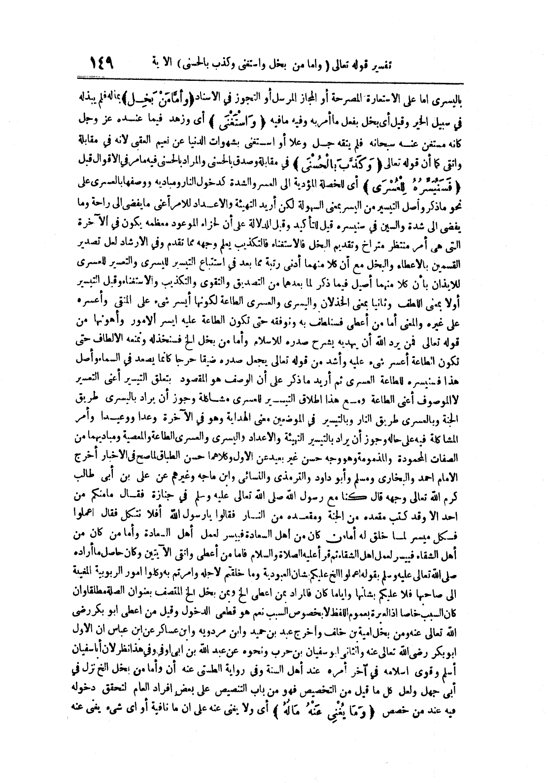 باليسرى إما على الإستعارة المصرحة أو المجاز المرسل أو التجوز في الإسناد وأما من بخل بما له فلم يبذله في سبيل الخير وقيل أي بخل بفعل ما أمر به وفيه ما فيه واستغنى أي وزهد فيما عنده عز و جل كأنه مستغن عنه سبحانه فلم يتقه جل وعلا أو استغنى بشهوات الدنيا عن نعيم العقبى لأنه في مقابلة واتقى كما أن قوله تعالى وكذب بالحسنى في مقابلة وصدق بالحسنى والمراد بالحسنى فيه ما مر في الأقوال قبل فسنيسره للعسرى أي للخصلة المؤدية إلى العسر والشدة كدخول النار ومباديه ووصفها بالعسرى على نحو ما ذكر وأصل التيسير من اليسر بمعنى السهولة لكن أريد التهيئة والإعداد للأمر أعني ما يفضي إلى راحة وما يفضي إلى شدة في سنيسره قيل للتأكيد وقيل للدلالة على أن الجزاء الموعود معظمه يكون في الآخرة التي هي أمر منتظر متراخ وتقديم البخل فالأستغناء فالتكذيب يعلم وجهه مما تقدم وفي الإرشاد لعل تصدير القسمين بالإعطاء والبخل مع أن كلا منهما أدنى رتبة بعد في استتباع التيسير لليسرى والتعسير للعسرى للإيذان بأن كلا منهما أصيلفيما ذكر لما بعدهما من التصديق والتقوى والتكذيب والأستغناء وقيل التيسير أولا بمعنى اللطف وثانيا بمعنى الخذلان واليسرى والعسرى الطاعة لكونها أيسر شيء على المتقي وأعسره على غيره والمعنى أما من أعطى فسنلطف به ونوفقه حتى تكون الطاعة عليه أيسر الأمور وأهونها من قوله تعالى فمن يرد الله أن يهديه يشرح صدره للإسلام وأما من بخل فسندخله ونمنعه الألطاف حتى تكون الطاعة أعسر شيء عليه وأشد من قوله تعالى يجعل صدره ضيقا حرجا كأنما يصعد في السماء وأصل هذا فسنيسره للطاعة العسرى ثم أريد ما ذكر على أن الوصف هو المقصود بتعلق التيسير أعني لا الموصوف أعني الطاعة ومع هذا إطلاق التيسير للعسرى مشاكلة وجوز أن يراد باليسرى طريق الجنة وبالعسرى طريق النار وبالتيسير في الموضعين معنى الهداية وهو في الآخرة وعدا ووعيدا وأمر المشاكلة على حاله وجوز أن يراد بالتيسير التهيئة والأعداد واليسرى والعسرى الطاعة والمعصية ومباديهما منالصفات المحمودة والمذمومة وهو وجه حسن غير بعيد عن الأول وكلاهما حسن الطباق لما صح في الأخبار أخرج الإمام أحمد والبخاري ومسلم وأبوداود والترمذي والنسائي وابن ماجة وغيرهم عن علي بن أبي طالب كرم الله تعالى وجهه قال كنا مع رسول الله صلى الله تعالى عليه وسلم في جنازة فقال ما منكم من أحد إلا وقد كتب مقعده من الجنة ومقعده من النار فقالوا يا رسول الله أفلا نتكل فقال اعملوا فكل ميسر لما خلق له أما من كان من أهل السعادة فييسر لعمل أهل السعادة وأما من كان من أهل الشقاء فييسر لعمل أهل الشقاء ثم قرأ عليه الصلاة و السلام فأما من أعطى واتقى الآيتين وكان حاصل ما أراده صلى الله تعالى عليه وسلم بقوله اعملوا الخ عليكم شأن العبودية وما خلقتم لأجله وأمرتم به وكلوا أمور الربوبية المغيبة إلى صاحبها فلا عليكم بشأنها وأيا ما كان فالمراد بمن أعطى الخ وبمن بخل الخ المتصف بعنوان الصلة مطلقا وإن كان السبب إذا لعبرة بعموم اللفظ لا بخصوص السبب نعم هو قطعي الدخول وقيل من أعطى أبو بكر رضي الله تعالى عنه ومن بخل أمية بن خلف وأخرج عبد بن حميد وابن مردويه وابن عساكر عن ابن عباس أن الأول أبو بكر رضي الله تعالى عنه والثاني أبو سفيان بن حرب ونحوه عن عبد الله بن أبي أوفى وفي هذا نظر لأن أبا سفيان أسلم وقوي إسلامه في آخر أمره عند أهل السنة وفي رواية الطستي عنه أن وأما من بخل الخ نزل في أبي جهل ولعل كل ما قيل من التخصيص فهو من باب التنصيص على بعض أفراد العام لتحقق دخوله فيه عند من خصص وما يغني عنه ماله أي ولا يغني عنه على أن ما نافية أو أي شيء يغني عنه
