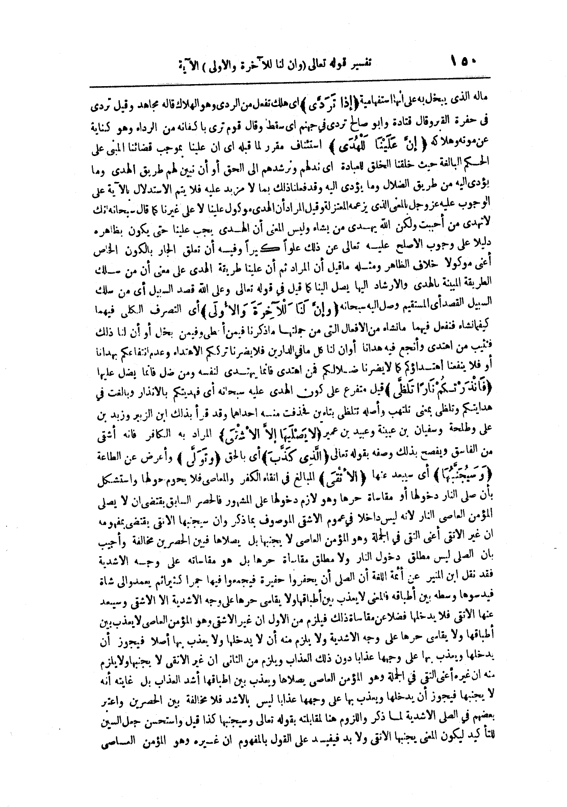 ماله الذي يبخل به على أنها استفهامية إذا تردى أي هلك تفعل من الردى وهو الهلاك قاله مجاهد وقيل تردى في حفرة القبر وقال قتادة وأبو صالح تردى في جهنم أي سقط وقال قوم ترى بأكفانه من الرداء وهو كناية عن موته وهلاكه إن علينا للهدى استئناف مقرر لما قبله أي إن علينا بموجب قضائنا المبني على الحكم البالغة حيث خلقنا الخلق للعبادة أي ندلهم ونرشدهم إلى الحق أو أن نبين لهم طريق الهدى وما يؤدي إليه من طريق الضلال وما يؤدي إليه وقد فعلنا ذلك بما لا مريد عليه فلا يتم الأستدلال بالآية على الوجوب عليه عز و جل بالمعنى الذي يزعمه المعتزلة وقيل المراد أن الهدى موكول علينا لا على غيرنا كما قال سبحانه إنك لا تهدي من أحببت ولكن الله يهدي من يشاء وليس المعنى أن الهدى يجب علينا حتى يكون بظاهره دليلا على وجوب الأصلح عليه تعالى عن ذلك علوا كثيرا وفيه أن تعلق الجار بالكون الخاص أعني موكولا خلاف الظاهر ومثله ما قيل أن المراد أن علينا طريقة الهدى على معنى أن من سلك الطريقة المبينة بالهدى والإرشاد إليها يصل إلينا كما قيل في قوله تعالى وعلى الله قصد السبيل أي من سلك السبيل القصد أي المستقيم وصل إليه سبحانه وإن لنا للآخرة والأولى أي التصرف الكلي فيهما كيفما نشاء فنفعل ما نشاء من الأفعال التي من جملتها ما ذكرنا فيمن أعطى وفيمن بخل أو أن لنا ذلك فنثيب من اهتدى وأنجع فيه هدانا أو أن لنأكل ما في الدارين فلا يضرنا ترككم الأهتداء وعدم انتفاعكم بهدانا أو فلا ينفعنا اهتداؤكم كما لا يضرنا ضلالكم فمن اهتدى فإنما يهتدي لنفسه ومن ضل فإنما يضل عليها فأنذرتكم نارا تلظى قيل متفرع على كون الهدى عليه سبحانه أي فهديتكم بالإنذار وبالغت في هدايتكم وتلظي بمعنى تلتهب وأصله تتلظى بتاءين فحذفت منه أحدهما وقد قرأ بذلك ابن الزبير وزيد بن علي وطلحة وسفيان بن عيينة وعبيد بن عمير لا يصليها إلا الأشقى المراد به الكافر فإنه أشقى من الفاسق ويفصح بذلك وصفه بقوله تعالى الذي كذب أي بالحق وتولى وأعرض عن الطاعة وسيجنبها أي سيبعد عنها الأتقى المبالغ في اتقاء الكفر والمعاصي فلا يحوم حولها واستشكل بأن صلى النار دخولها أو مقاساة حرها وهو لازم دخولها على المشهور فالحصر السابق يقتضي أن لا يصلى المؤمن العاصي النار لأنه ليس داخلا في عموم الأشقى الموصوف بما ذكر وأن سيجنبها الأتقى بمفهومه أن غير الأتقى أعني التقى في الجملة وهو المؤمن العاصي لا يجنبها بل يصلاها فبين الحصرين مخالفة وأجيب بأن الصلي ليس مطلق دخول النار ولا مطلق مقاساة حرها بل هو مقاساته على وجه الأشدية فقد نقل ابن المنير عن أئمة اللغة أن الصلي أن يحفروا حفيرة فيجمعوا فيها جمرا كثيرا ثم يعمدوا إلى شاة فيدسوها وسطه بين أطباقه فالمعنى لا يعذب بين أطباقها ولا يقاسي حرها على وجه الأشدية إلا الأشقى وسيبعد عنها الأتقى فلا يدخلها فضلا عن مقاساة ذلك فيلزم من الأول أن غير الأشقى وهو المؤمن العاصي لا يعذب من أطباقها ولا يقاسي حرها على وجه الأشدية ولا يلزم منه أن لا يدخلها ولا يعذب بها أصلا فيجوز أن يدخلها ويعذب بها على وجهها عذابا دون ذلك العذاب ويلزم من الثاني أن غير الأتقى لا يجنبها ولا يلزم منه أن غيره أعني التقي في الجملة وهو المؤمن العاصي يصلاها ويعذب بين أطباقها أشد العذاب بل غايته أنه لا يجنبها فيجوز أن يدخلها ويعذب بها على وجهها عذابا ليس بالأشد فلا مخالفة بين الحصرين واعتبر بعضهم في الصلي الأشدية لما ذكر واللزوم هنا لمقابلته بقوله تعالى وسيجنبها كذا قيل واستحسن جعل السين للتأكيد ليكون المعنى يجنبها الأتقى ولا بد فيفيد على القول بالمفهوم أن غيره وهو المؤمن العاصي