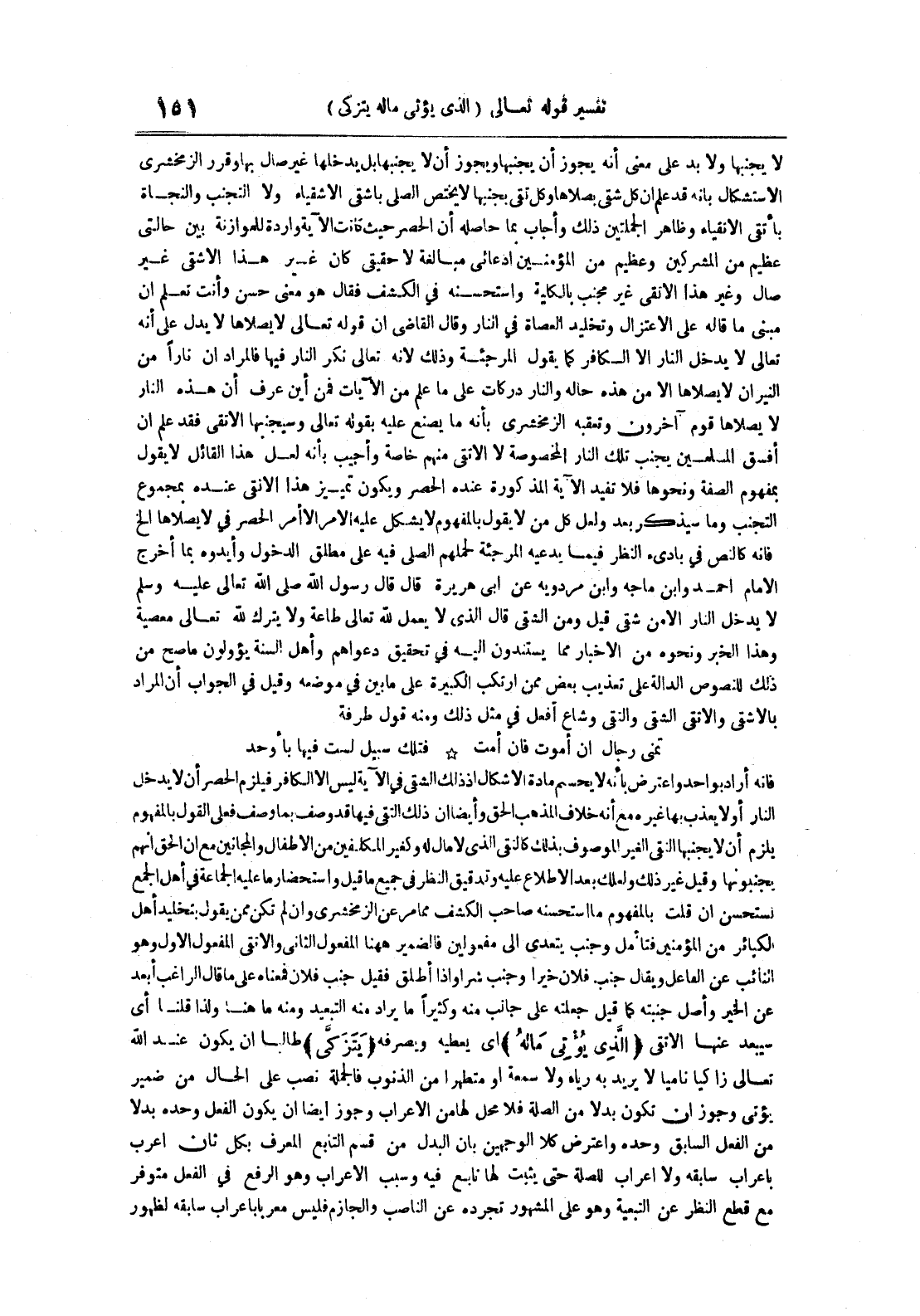 فتلك سبيل لست فيها بأوحد فإنه أراد بواحد واعترض بأنه لا يحسم مادة الإشكال إذ ذلك الشقي في الآية ليس إلا الكافر فيلزم الحصر أن لا يدخل النار أو لا يعذب بها غيره مع أنه خلاف المذهب الحق وأيضا إن ذلك التقي فيها قد وصف بما وصف فعلى القول بالمفهوم يلزم أن لا يجنبها التقي الغير الموصوف بذلك كالتقي الذي لا مال له وكغيره المكلفين من الأطفال والمجانين مع أن الحق أنهم يجتبونها وقيل غير ذلك ولعلك بعد الإطلاع عليه وتدقيق النظر في جميع ما قيل واستحضار ماعليه الجماعة في أهل الجمع تستحسن أن قلت بالمفهوم صاحب الكشف مما مر عن الزمخشري وأن لم تكن منيقول بتخليد أهل الكبائر من المؤمنين فتأمل وجنب يتعدى إلى مفعولين فالضمير ههنا المفعول الثاني والأتقى المفعول الأول وهو النائب عن الفاعل ويقال جنب فلان خيرا وجنب شرا وإذا أطلق فقيل جنب فلان فمعناه على ما قال الراغب أبعد عن الخير وأصل جنبته كما قيل جعلته على جانب منه وكثيرا ما يراد منه التبعيد ومنه ما هنا ولذا قلنا أي سيبعد عنها الأتقى الذي يؤتي ماله أي يعطيه ويصرفه يتزكى طالبا أن يكون عند الله تعالى زاكيا ناميا لا يريد به رياء ولاسمعة أومتطهرا من الذنوب فالجملة نصب على الحال من ضمير يؤتي وجوز أن تكون بدلا من الصلة فلا محل لها من الإعراب وجوز أيضا أن يكون الفعل وحده بدلا من الفعل السابق وحده واعترض كلا الوجهين بأن البدل من قسم التابع المعرف بكل ثان اعرب بإعراب سابقه ولا إعراب للصلة حتى يثبت لها تابع فيه وسبب الإعراب وهو الرفع فيالفعل متوفر مع قطع النظر عن التبعية وهو على المشهور تجرده عن الناصب والجازم فليس معربا بإعراب سابقه لظهور