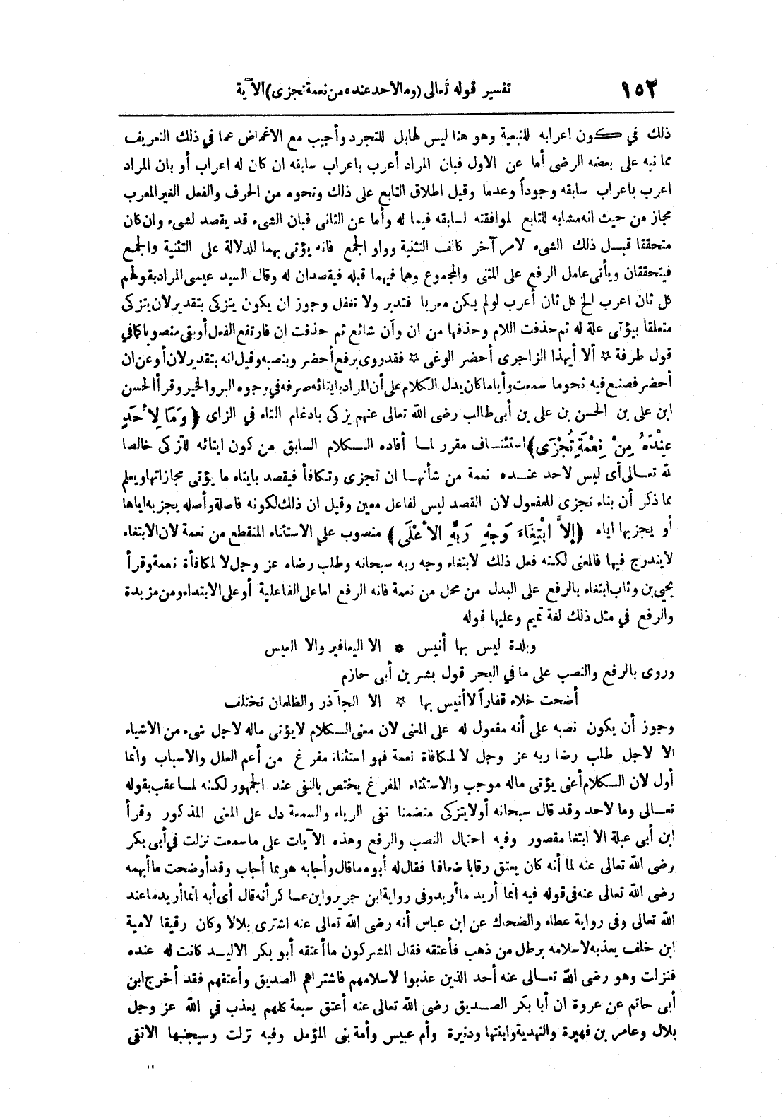 فقد روي برفع أحضر وبنصبه وقيل أنه بتقدير لأن أو عن أن أحضر فصنع فيه نحو ما سمعت وأيا ما كان يدل الكلام على أن المراد بأيتائه صرفه في وجوه البر والخير وقرأ الحسن ابن علي بن الحسن بن علي بن أبي طالب رضي الله تعالى عنهميزكي بإدغام التاء في الزاي وما لأحد عنده من نعمة تجزى استئناف مقرر لما أفاده الكلام السابق من كون إيتائه للتزكي خالصا لله تعالى أي ليس عنده من شأنها أن تجزي وتكافأ فيقصد بإيتاء ما يؤتي مجازاتها ويعلم مما ذكر أن بناء تجزي للمفعول لأن القصد ليس لفاعل معين وقيل إن ذلك لكونه فاصلة وأصله يجز به إياها أو يجزيها إياه إلا ابتغاء وجهربه الأعلى منصوب على الأستثناء المنقطع من نعمة لأن الأبتغاء لا يندرج فيها فالمعنى لكنهفعل ذلك لابتغاء وجه ربه سبحانه ورضاه عز و جل لا لمكافأة نعمة وقرأ يحيى بن وثاب ابتغاء بالرفع على البدل من محل من نعمة فإنه الرفع إما على الفاعلية أو على الأبتداء ومن مزيدة والرفع في مثل ذلك لغة تميم وعليها قوله وبلدة ليس بها أنيس