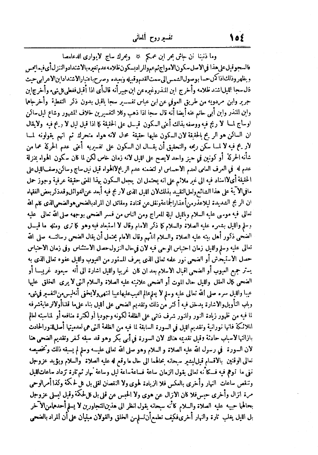 وبحرك ساج لا يواري الدعامصا فالسجو قيل على هذا في الأصل سكون الأمواج ثم عم والمراد بسكون ظلامه عدم تغيره بالأشتداد والتنزل أي فيما يحس ويظهر وذلك إذا كمل حساب وصول الشمس إلى سمت القدم وقبيله وبعيده وصرح باعتبار الأشتداد ابن الأعرابي حيث قال سجا الليل اشتد ظلامه وأخرج ابن المنذر وغيره عن ابن جبير أنه قال أي إذا أقبل فغطى كل شيء وأخرج ابن جرير وابن مردويه من طريق العوفي عن ابن عباس تفسير سجا بدون ذكر التغطية وأخرجاهما وابن المنذر وابن أبي حاتم عنه أيضا أنه قال سجا إذا ذهب وكلا التفسيرين خلاف المشهور وشاع ليل ساكن أو ساج لما لا ريح فيه ووصفه بذلك أعني السكون قيل على الحقيقة كما إذا قيل ليل لاريح فيه ولا يقالأن الساكن هو الريح بالحقيقة لأن السكون عليها حقيقة محال لأنه هواء متحرك ثم أنهم يقولونه لما لا ريح فيه لا لما سكن ريحه والتحقيق أن يقال أن السكون على تفسيريه أعني عدم الحركة عما من شأنه الحركة أو كونين في حيز واحد لا يصح على الليل لأنه زمان خاص لكن لما كان سكون الهواء بمنزلة عدم له في العرف العامي لعدم الإحساس أو لتضمنه عدم الريح لا الهواء قيل ليل ساج وساكن وصف الليل على الحقيقة أي لا إسناد فيه إلى غير ملائم على أنه يحتمل أن يجعل السكون بهذا المعنى حقيقة عرفية وجوز حمل ما في الآية على هذا الشائع ولعل التقييد بذلك لأن الليل الذي لا ريح فيه أبعد عن الغوائل وقد ذكر بعض الفقهاء أن الريح الشديدة ليلا عذر من أعذار الجماعة ونقل عن قتادة ومقاتل أن المراد بالضحى هو الضحى الذي كلم الله تعالى فيه موسى عليه السلام وبالليل ليلة المعراج ومن الناس من فسر الضحى بوجهه ص - والليل بشعره عليه الصلاة و السلام كما ذكر الإمام وقال لا استبعاد فيه وهو كما ترى ومثله ما قيل الضحى ذكور أهل بيته عليه الصلاة و السلام إناثهم وقال الإمام يحتملأن يقال الضحى رسالته صلى الله تعالى عليه وسلم والليل زمان احتباس الوحي فيه لأن في حال النزول حصل الأستئناس وفي زمان الأحتباس حصل الأستيحاش أو الضحى نور علمه تعالى الذي يعرف المستور من الغيوب والليل عفوه تعالى الذي به يستر جميع العيوب أو الضحى إقبال الإسلام بعد أن كان غريبا والليل إشارة إلى أنه سيعود غريبا أو الضحى كمال العقل والليل حال الموت أو الضحى علانيته عليه الصلاة و السلام التي لا يرى الخلق عليها عيبا والليل سره صلى الله تعالى عليه وسلم لا يعلم عالم الغيب عليها عيبا انتهى ولا يخفى أنه ليس من التفسير في شيء وباب التأويل والإشارة يدخل فيه أكثر من ذلك وتقديم الضحى على الليل بناء على ما قلنا أول الرعاية شرفه لما فيه من ظهور زيادة النور وللنور شرف ذاتي على الظلمة لكونه وجوديا أو لكثرة منافعه أو لمناسبته لعالم الملائكة فإنها نورانية وتقديم الليل في السورة السابقة لما فيه من الظلمة التي هي لعدميتها أصل للنور الحادث بإزالتها لأسباب حادثة وقيل تقديمه هناك لأن السورة في أبي بكر وهو قد سبقه كفر وتقديم الضحى هنا لأن السورة في رسول الله صلى الله تعالى عليه وسلم وهو صلى الله تعالى عليه وسلم لم يسبقه ذلك وتخصيصه تعالى الوقتين بالأقسام قيل ليشير سبحانه بحالهما إلى حال ما وقع له عليه الصلاة و السلام ويؤيد عز و جل نفي ما توهم فيه فكأنه تعالى يقول الزمان ساعة فساعة ساعة ليل وساعة نهار ثم تارة تزداد ساعات الليل وتنقص ساعات النهار وأخرى بالعكس فلا الزيادة لهوى ولا النقصان لقلى بل كل لحكمة وكذا أمر الوحي مرة إنزال وأخرى حبس فلا كان الإنزال عن هوى ولا الحبس عن قلى بل كل لحكمة وقيل ليسلي عز و جل بحالهما حبيبه عليه الصلاة و السلام كأنه سبحانه يقول انظر إلى هذين المتجاورين لا يسلم أحدهما من الآخر بل الليل يغلب تارة والنهار أخرى فكيف تطمع أن تسلم من الخلق والقولان مبنيان على أن المراد بالضحى