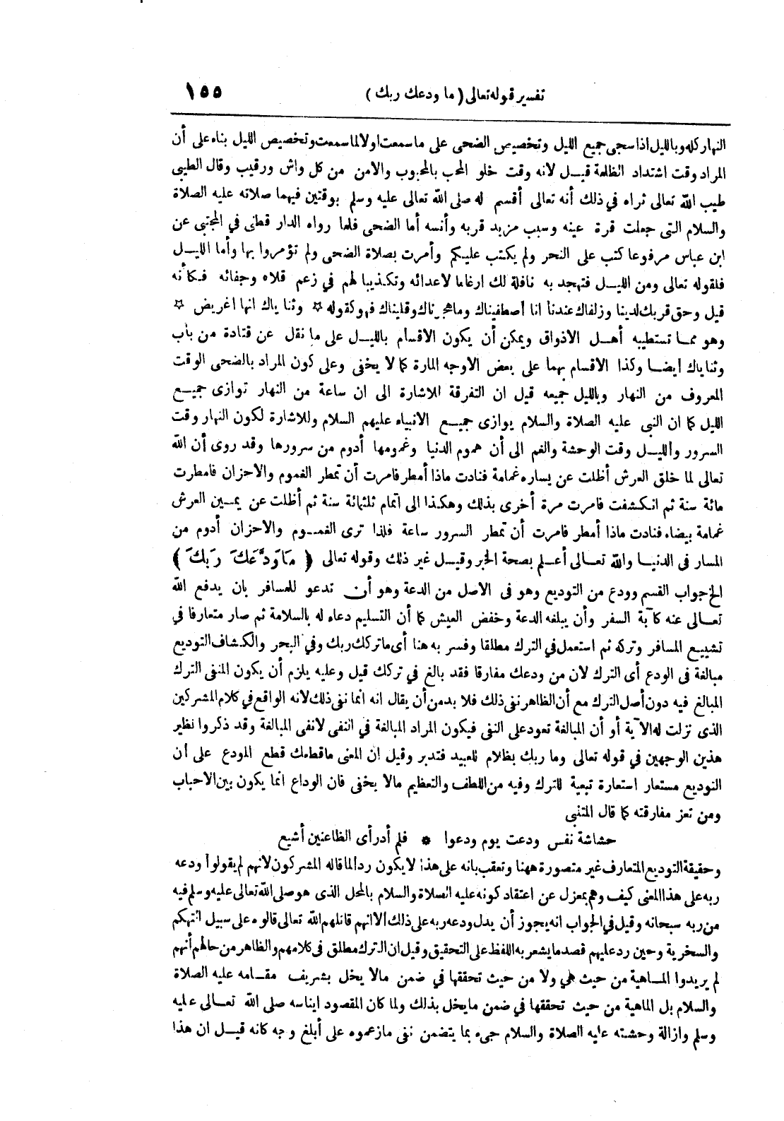 النهار كله وبالليل إذا سجى جميع الليل وتخصيص الضحى على ما سمعت أولا لما سمعت وتخصيص الليل بناء على أن المراد وقت اشتداد الظلمة قيل لأنه وقت خلو المحب بالمحبوب والأمن من كل واش ورقيب وقال الطيبي طيب الله تعالى ثراه في ذلك أنه تعالى أقسم له صلى الله تعالى عليه وسلم بوقتين فيهما صلاته عليه الصلاة و السلام التي جعلت قرة عينه وسبب مزيد قربه وأنسه أماالضحى فلما رواه الدارقطني في المجتبي عن ابن عباس مرفوعا كتب على النحر ولميكتب عليكم وأمرت بصلاة الضحى ولم تؤمروا بها وأما الليل فلقوله تعالى ومن الليل فتهجد به نافلة لك إرغاما لأعدائه وتكذيبا لهم في زعم قلاه وجفائه فكأنه قيل وحق قربك لدينا وزلفاك عندنا إنا اصطفيناك وما هجزناك وقليناك فهو كقوله