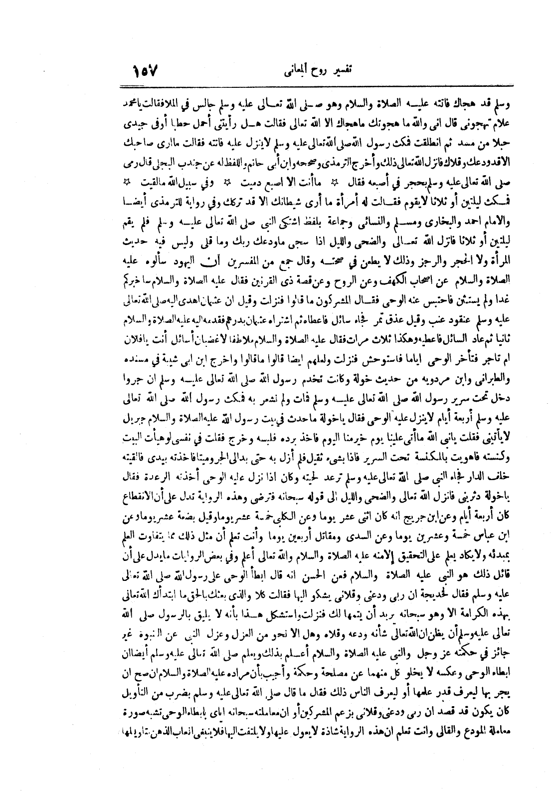 فمكث ليلتين أو ثلاثا لا يقوم فقالت له امرأة ما أرى شيطانك إلا قد تركك وفي رواية للترمذي أيضا والإمام أحمد والبخاري ومسلم والنسائي وجماعة بلفظ اشتكى النبي صلى الله تعالى عليه وسلم فلم يقم ليلتين أو ثلاثا فأنزل الله تعالى والضحى والليل إذا سجى ما ودعك ربك وما قلى وليس فيه حديث المرأة ولا الحجر والزجر وذلك لا يطعن في صحته وقال جمع من المفسرسن أن اليهود سألوه عليه الصلاة و السلام عن أصحاب الكهف وعن الروح وعن قصة ذي القرنين فقال عليه الصلاة و السلام سأخبركم غدا ولم يستثن فاحتبس عنه الوحي فقال المشركون ما قالوا فنزلت وقيل إن عثمان أهدى إليه صلى الله تعالى عليه وسلم عنقود عنب وقيل عذق تمر فجاء سائل فأعطاه ثم اشتراه عثمان بدرهم فقدمه إليه عليه الصلاة و السلام ثانيا ثم عاد السائل فأعطيه وهكذا ثلاث مرات فقال عليه الصلاة و السلام ملاطفا لا غضبان أسائل أنت يا فلان أم تاجر فتأخر الوحي أياما فاستوحش فنزلت ولعلهمأيضا قالوا ما قالوا وأخرج ابن أبي شيبة في مسنده والطبراني وابن مردويه من حديث خولة وكانت تخدم رسول الله صلى الله تعالى عليه وسلم أن جروا تحت سرير رسول الله صلى الله تعالى عليه وسلم فمات ولم نشعر فمكث رسول الله صلى الله تعالى عليه وسلم أربعة أيام ينزل عليه الوحي فقال يا خولة ما حدث في بيت رسول الله عليه الصلاة و السلام جبريل لا يأتيني فقلت يا نبي الله ما أتى علينا يوم خير منا اليوم فأخذ برده فلبسه وخرج فقلت في نفسي لو هيأت البيت وكنسته فأهوي بالمكنسة تحت السرير فإذا بشيء ثقيل فلم أزل به حتى بد إلي الجرو ميتا فأخذته بيدي فألقيته خلف الدار فجاء النبي صلى الله تعالى عليه وسلم ترعد لحيته وكان إذا نزل عليه الوحي أخذته الرعدة فقال يا خولة دثريني فأنزل الله تعالى والضحى والليل إلى قوله سبحانه فترضى وهذه الرواية تدل على أن الأنقطاع كان أربعة أيام وعن ابن جريج أنه كان اثني عشر يوما وعن الكلبي خمسة عشر يوما وقيل بضعة عشر يوما وعن ابن عباس خمسة وعشرين يوما وعن السدي ومقاتل أربعين يوما وأنت تعلم أن مثل ذلك مما يتفاوت العلم بمبدئه ولا يكاد يعلم على التحقيق إلا منه عليه الصلاة و السلام والله تعالى أعلم وفي بعض الروايات ما يدل على أن قائل ذلك هو النبي عليه الصلاة و السلام فعن الحسن أنه قال ابطأ الوحي على رسول الله صلى الله تعالى عليه وسلم فقال لخديجة إن ربي ودعني وقلاني يشكو إليها فقالت كلا والذي بعثك بالحق ما أبتدأك الله تعالى بهذه الكرامة إلا وهو سبحانه يريد أن يتمها لك فنزلت واستشكل هذا بأنه لا يليق بالرسول صلى الله تعالى عليه وسلم أن يظن أن الله تعالى شأنه ودعه وقلاه وهل إلا نحو من العزل وعزل النبي عن النبوة غير جائز في حكمته عز و جل والنبي عليه الصلاة و السلام أعلم بذلك ويعلم صلى الله تعالى عليه وسلم أيضا أن أبطأ الوحي وعكسه لا يخلو كل منهما عن مصلحة وحكمة وأجيب بأن مراده عليه الصلاة و السلام إن صح أن يجربها ليعرف قدر علمها أو ليعرف الناس ذلك فقال ما قال صلى الله تعالى عليه وسلم بضرب من التأويل قد قصد إن ربي ودعني وقلاني بزعم المشركين أو أن معاملته سبحانه إياي بأبطاء الوحي تشبه صورة معاملة المودع والقالي وأنت تعلم أن هذه الرواية شاذة لا يعول عليها ولا يلتفت إليها فلا ينبغي اتعاب الذهن بتأويلها