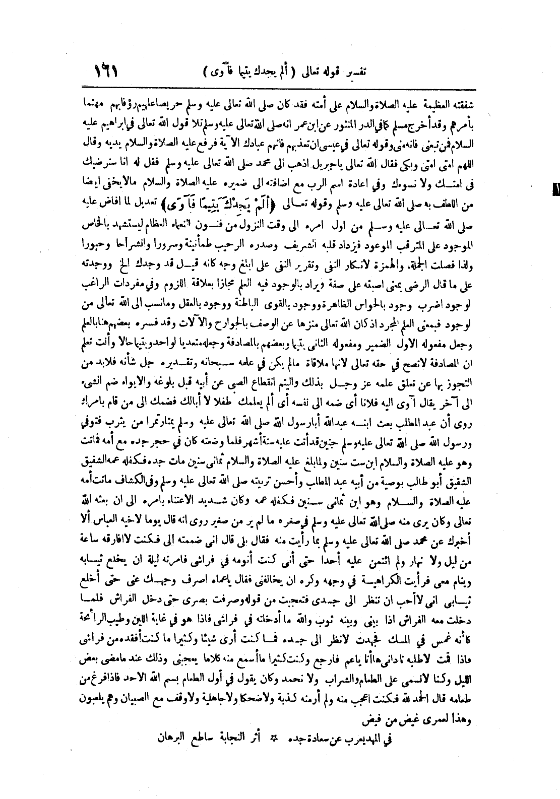 شفقته العظيمة عليه الصلاة و السلام على أمته فقد كان صلى الله تعالى عليه وسلم حريصا عليهم رؤفا بهم مهتما بأمرهم وقد أخرج مسلم كما في الدر المنثور عن ابن عمر أنه صلى الله تعالى عليه وسلم تلا قول الله تعالى في إبراهيم عليه السلام فمن تبعني فإنه مني وقوله تعالى في عيسى أن تعذبهم فإنهم عبادك الآية فرفع عليه الصلاة و السلام يديه وقال اللهم أمتي وبكى فقال الله تعالى يا جبريل اذهب إلى محمد صلى الله تعالى عليه وسلم فقال له إنا سنرضيك في أمتك يخفى ولا نسوءك وفي إعادة اسم الرب مع إضافته إلى ضميره عليه الصلاة و السلام ما لا يخفى أيضا من اللطف به صلى الله تعالى عليه وسلم وقوله تعالى ألم يجدك يتيما فآوى تعديل لما أفاض عليه صلى الله تعالى عليه وسلم من أول أمره إلى وقت النزول من فنون النعماء العظام لستشهد بالخاص الموجود على المترقب الموعود فيزداد قلبه الشريف وصدره الرحيب طمأنينة وسرورا وانشراحا وحبورا ولذا فصلت الجملة والهمزة لأنكار النفي وتقرير على أبلغ وجه كأنه قيل قد وجدك الخ وودته على ما قال الرضي بمعنى أصبته على صفة ويراد بالوجود فيه العلم مجازا بعلاقة اللزوم وفي مفردات الراغب لوجود إضرب وجود بالحواس الظاهرة ووجود بالقوى الباطنة ووجود بالعقل وما نسب إلى الله تعالى من لوجود فبمعنى العلم المجرد إذ كان الله تعالى منزها عن الوصف بالجوارح والآلات وقد فسره بعضهم هنا بالعلم وجعل مفعوله الأول الضمير ومفعوله الثاني يتيما وبعضهم بالمصادقة وجعله متعديا لواحد ويتيما حالا وأنت تعلم أن المصادقة لا تصح في حقه تعالى لأنها ملاقاة ما لم يكن في علمه سبحانه وتقديره جل شأنه فلا بد من التجوز بها عن تعلق علمه عز و جل بذلك واليتم انقطاع الصبي عن أبيه قبل بلوغه والإيواء ضم الشيء إلى آخر يقال آوى إليه فلانا أي ضمه إلى نفسه أي ألم يعلمك طفلا لا أبالك فضمك إلى من قام بأمرك روي أن عبد المطلب بعث ابنه عبد الله أبا رسول الله صلى الله تعالى عليه وسلم يمتار تمرا من يثرب فتوفي ورسول الله صلى الله تعالى عليه وسلم جنين قد أتت عليه ستة أشهر فلما وضعته كان في حجر جده مع أمه فماتت وهو عليه الصلاة و السلام ابن ست سنين ولما بلغ عليه الصلاة و السلام ثماني سنين مات جده فكلفه عمه الشفيق أبو طالب بوصية من أبيه عبد المطلب وأحسن تربيته صلى الله تعالى عليه وسلم وفي الكشاف ماتت أمه عليه الصلاة و السلام وهو ابن ثماني سنين فكلفه عمه وكان شديد الأعتناء بأمره إلى أن بعثه الله تعالى وكان يرى منه صلى الله تعالى عليه وسلم في صغره ما لم ير من صغير أنه قال يوما لأخيه العباس ألا أخبرك عن محمد صلى الله تعالى عليه وسلم بما رأيت منه فقال بلى قال إني ضممته لي فكنت لا أفارقه ساعة من ليل ولا نهار ولم ائتمن عليه أحدا حتى أني كنت أنومه في فراشي فأمرته ليلة أن يخلع ثيابه وينام معي فرأيت الكراهية في وجهه وكره أن يخالفني فقال يا عماه اصرف وجهك عني حتى أخلع ثيابي إني لا أحب أن تنظر إلى جسدي فتعجبت من قوله وصرفت بصري حتى دخل الفراش فلما دخلت معه الفراش إذا بيني وبينه ثوب والله ما أدخلته في فراشي فإذا هو في غاية اللين وطيب الرائحة كأنه غمس في المسك فجهدت لأنظر إلى جسده فما كنت أرى شيئا وكثيرا ما كنت أفقده من فراشي فإذا قمت لأطلبه ناداني ها أنا يا عم فراجع وكنت كثيرا ما أسمع منه كلاما يعجبني وذلك عندما مضى بعض الليل وكنا لا نسمي على الطعام والشراب ولا نحمد وكان يقول في أول الطعام بسم الله الأحد فإذا فرغ من طعامه قال الحمد لله فكنت أعجب منه ولم أر منه كذبة ولا ضحكا ولا جاهلية ولا وقف من الصبيان وهم يلعبون وهذا لعمري غيض من فيض في المهد يعرب عن سعادة جده