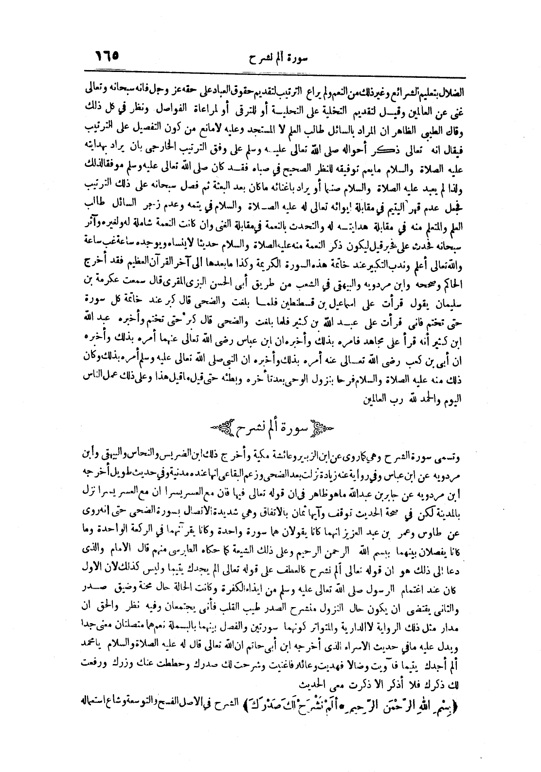 وتسمى سورة الشرح وهي كما روي عن ابن الزبير وعائشة مكية وأخرج ذلك ابن الضريس والنحاس والبيهقي وابن مردويه عن ابن عباس في رواية عنه زيادة نزلت بعد الضحى وزعم البقاعي أنها عنده مدنية حديث طويل أخرجه ابن مردويه عن جابر بن عبد الله ما هو ظاهر في أن قوله تعالى فيها فإن مع العسر يسرا إن مع العسر يسر نزل بالمدينة لكن في صحة الحديث توقف وآيها ثمان بالإتفاق وهي شديدة الإتصال بسورة الضحى حتى أنه روي عن طاوس وعمر بن عبد العزيز أنهما كانا يقولان هما سورة واحدة وكانا يقرآنهما في الركعة الواحدة وما كانا يفصلان بينهما ببسم الله الرحمن الرحيم وعلى ذلك الشيعة كما حكاه الطبرسي منهم قال الإمام والذي دعا إلى ذلك هو أن قوله تعالى ألم نشرح كالعطف على قوله تعالى ألم يجدك يتيما وليس كذلك لأن الأول كان عند اغتنام الرسول صلى الله تعالى عليه وسلم من إيذاءه الكفرة وكانت الحالة حال محنة وضيق صدر والثاني يقتضي أن يكون حال النزول منشرح الصدر طيب القلب فأني يجتمعان وفيه نظر والحق أن مدار مثل ذلك الرواية لا الدارية والمتواتر كونهما سورتين والفصل بينهما بالبسملة نعم هما متصلتان معنى جدا ويدل عليه ما في الإسراء الذي أخرجه ابن أبي حاتم أن الله تعالى قال له عليه الصلاة و السلام يا محمد ألم أجدك يتيما فآويت وضالا فهديت وعائلا فأغنيت وشرحت لك صدرك وحططت عنك وزرك ورفعت لك ذكرك فلا أذكر إلا ذكرت معي الحديث بسم الله الرحمن الرحيم