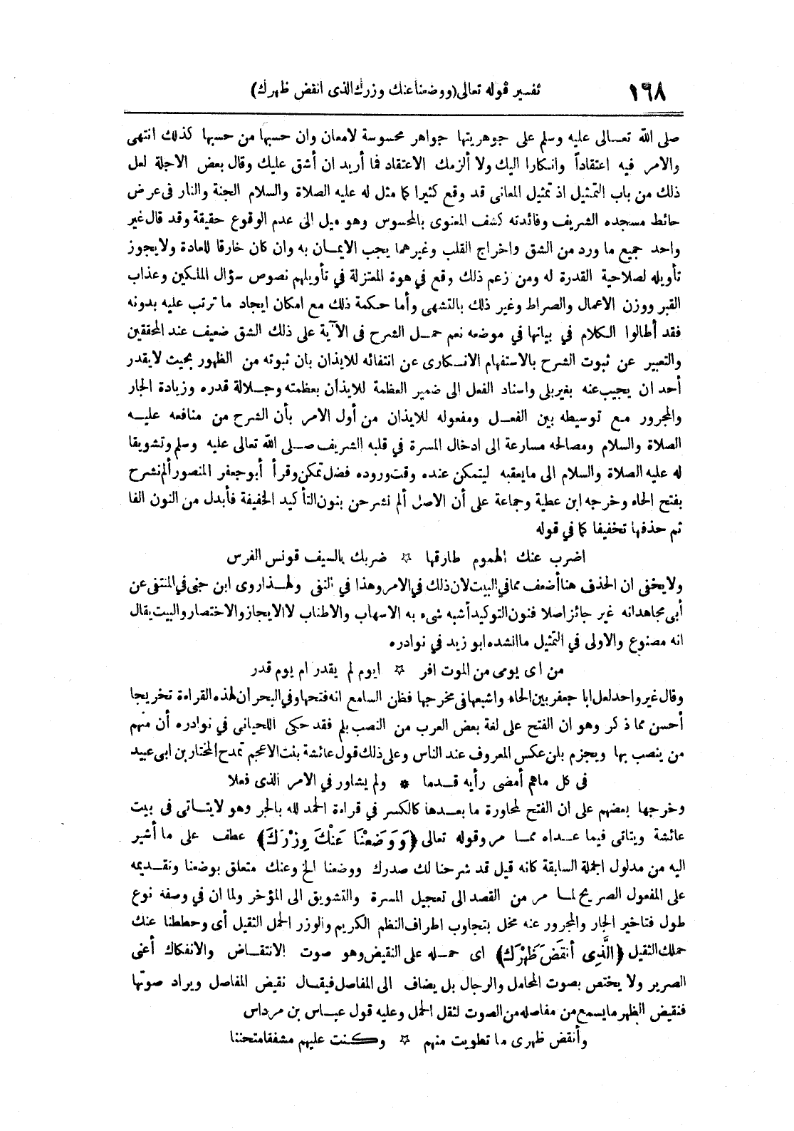 ولم يشاور في الأمر الذي فعلا وخرجها بعضهم على أن الفتح لمحاورة ما بعدها كالكسر في قراءة الحمد لله بالجر وهو لا يتأتى في بيت عائشة ويتأتى فيما عداه مما مر وقوله تعالى ووضعنا عنك وزرك عطف على ما أشير إليه من مدلول الجملة السابقة كأنه قيل قد شرحنا لك صدرك ووضعنا الخ وعنك متعلق بوضعنا وتقديمه على المفعول الصريح لما مر من القصد إلى تعجيل المسرة والتشويق إلى المؤخر ولما أن في وصفه نوع طول فتأخير الجار والمجرور عنه مخل بتجاوب أطراف النظم الكريم والوزر الحمل الثقيل أي وحططنا عنك حملك الثقيل الذي انقض ظهرك أي حمله على النقيض وهو صوت الأنتقاض والأنفكاك أعني الصرير ولا يختص بصوت المحامل والرجال بل يضاف إلى المفاصل فيقال نقيض المفاصل ويراد صوتها فنقيض الظهر ما يسمع من مفاصله من الصوت لثقل الحمل وعليه قول عباس بن مرداس وأنقض ظهري ما تطويت منهم