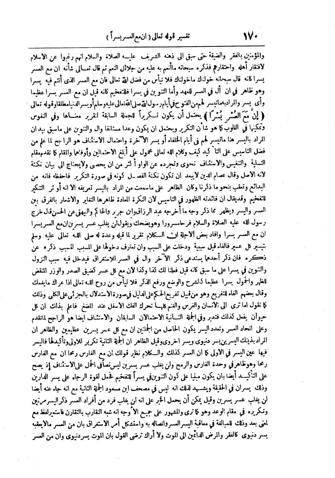 والمؤمنين بالفقر والضيقة حتى سبق إلى ذهنه الشريف عليه الصلاة و السلام أنهم رغبوا عن الإسلام لافتقار أهله واحتقارهم فذكره سبحانه ما أنعم به عليه من جلائل النعم ثم قال تعالى شأنه أن مع العسر يسرا كأنه قال سبحانه خولناك ما خولناك فلا تيأس من فضل الله تعالى فإن مع العسر الذي أنتم فيه يسرا وهو ظاهر في أن أل في العسر للعهد وأما التنوين في يسرا فللتفخيم كأنه قيل أن مع العسر يسرا عظيما وأي يسر والمراد به ما تيسر لهم من الفتوح في أيام رسول الله صلى الله تعالى عليه وسلم أو يسر الدنيا مطلقا وقوله تعالى إن مع العسر يسرا يحتمل أن يكون تكريرا للجملة السابقة لتقرير معناها وفي النفوس وتمكينها في القلوب كما هو شأن التكرير ويحتمل أن يكون وعدا مستأنفا وأل التنوين على ما سبق بيد أن المراد باليسر هنا ما تيسر لهم في أيام الخلفاء أو يسر الآخرة واحتمال الأستئناف هو الراجح لما علم من فضل التأسيس على التأكيد كيف وكلام الله تعالى محمول على أبلغ الأحتمالين وأوفاهما والمقام كما تقدم مقام التسلية والتنفيس والأستئناف نحوي وتجرده على الواو أكثر من أن يحصى ولا يحتاج إلى بيان نكتة لأنه الأصل وقال عصام الدين لا يبعد أن تكون نكتة الفصل كونه في صورة التكرير فاحفظه فإنه من البدائع وتعقب بنحو ما ذكرنا وكان الظاهر على ما سمعت من المراد باليسر تعريفه إلا أنه أوثر التنكير للتفخيم وقد يقال أن فائدته الظهر في التأسيس لأن النكرة المعادة ظاهرها التغاير والإشعار بالفرق بين العسر واليسر ويظهر مما ذكر وجه ما أخرجه عبد الرزاق وابن جرير والحاكم والبيهقي عن الحسن قال خرج رسول الله عليه الصلاة و السلام فرحا مسرورا وهو يضحك ويقول لن يغلب عسر يسرين مع أن مع العسر يسرا إن مع العسر يسرا وأفاد بعض الأجلة أن الكلام تقرير لما قبله وعدة له صلى الله تعالى عليه وسلم بتيسير كل عسير فالفاء قيل سببية ودخلت على المسبب وإن تعارف دخولها على المسبب لتسبب ذكره عن ذكره فإن ذكر أحدهما يستدعي ذكر الآخر وأل في العسر للأستغراق فيدخل فيه سبب النزول والتنوين في يسرا على ما سبق كأنه قيل فعلنا لك كذا وكذا لأن مع كل عسر كضيق الصدر والوزر المنقض للظهر والخمول يسرا عظيما كالشرح والوضع ورفع الذكر فلا تيأس من روح الله تعالى إذا عراك ما يغمك وقال بعضهم الفاء للتفريع وهو من قبيل تفريع الحكم على الدليل في صورة الأستدلال بالجزئي على الكلي وذلك كما تقول أما ترى إلى الإنسان والفرس والغنم كلها تحرك الفك الأسفل عند المضغ فاعلم بذلك أن كل حيوان يفعل كذلك فتدبر وفي الجملة الثانية الأحتمالان السابقان والأستئناف أيضا هو الراجح لما تقدم وعلى اتحاد العسر وتعدد اليسر يكون الحاصل من الجملتين أن مع كل عسر يسرين عظيمين والظاهر أن المراد بذينك اليسرين يسر دنيوي ويسر أخروي وقيل الظاهر أن الجملة الثانية تكرير للأولى وتأكيد لها فاليسر فيها عين اليسر في الأولى كما أن العسر كذلك والكلام نظير قولك أن مع الفارس رمحا أن مع الفارس رمحا وهو ظاهر في وحدة الفارس والرمح ولن يغلب عسر يسرين ليس نصا في الحمل على الأستئناف إذ يصح على التأكيد أيضا بأن يكون مبنيا على كون التنوين في يسرا للتفخيم فحمل لقوة الرجاء على يسر الدارين وذلك يسران في الحقيقة ويشهد لذلك أنه ليس في مصحف ابن مسعود الجملة الثانية مع أنه جاء عنه أيضا لن يغلب عسر يسرين وقيل يمكن أن يحمل الخبر على أنه لن يغلب فرد من أفراد العسر ذكر اليسر مرتين وتكريره في مقام الوعد وهو كما ترى والمشهور على جميع الأوجه أنه شبه التقارب بالتقارن فاستعير لفظ مع لمعنى بعد وذلك للمبالغة في معاقبة اليسر العسر وإنصاله به واستشكل أمر الأستغراق بأن من العسر ما لا يعقبه يسر دنيوي كالفقر والمرض الدائمين إلى الموت ولا أراك ترضى القول بأن الموت يسر دنيوي وأن من العسر