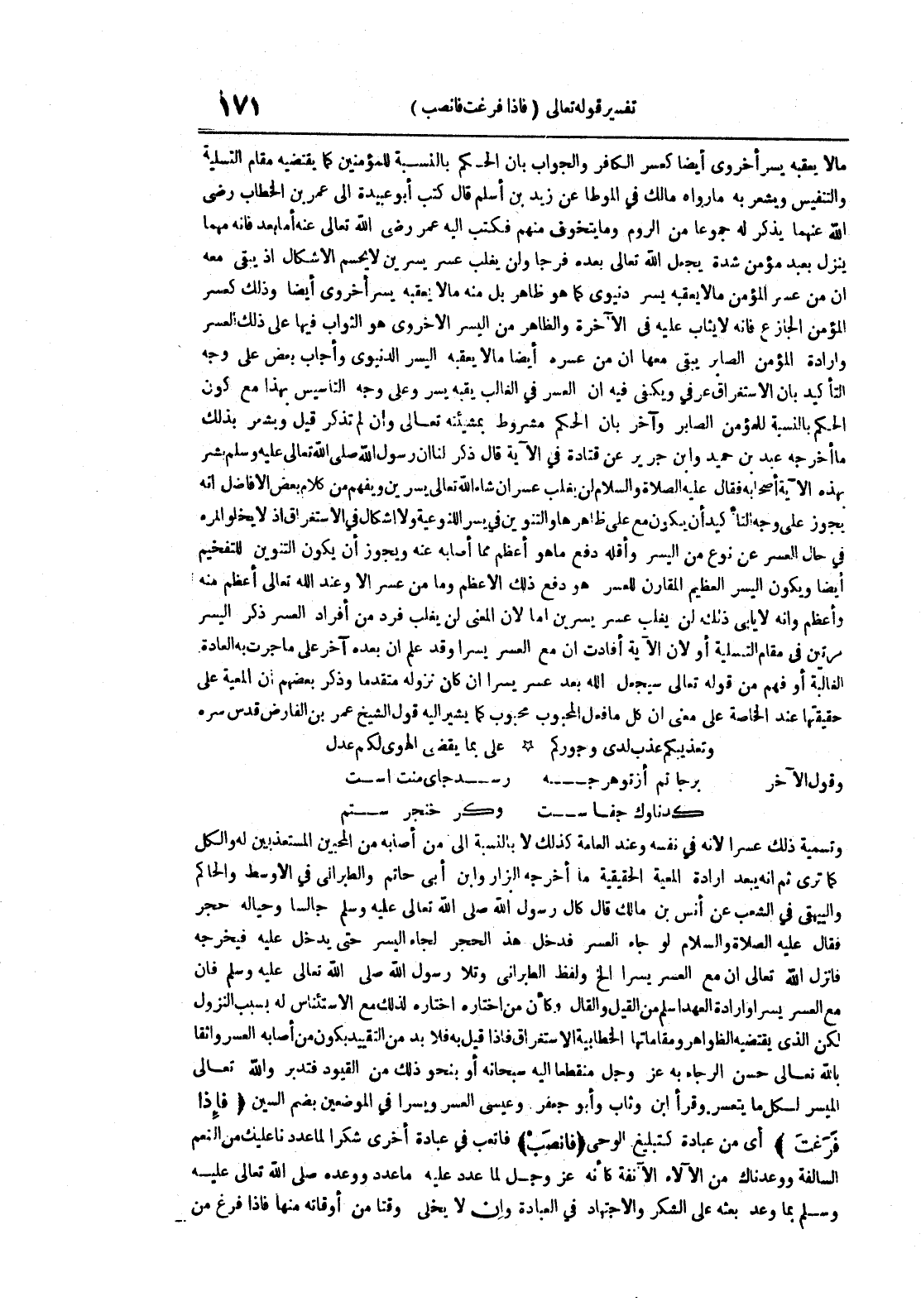 وكر خنجر ستم وتسمية ذلك عسرا لأنه في نفسه وعند العامة كذلك لا بالنسبة إلى من أصحابه من المحبين المستعذبين له والكل كما ترى ثم إنه يبعد إرادة المعية الحقيقية ما أخرجه البزار وابن أبي حاتم والطبراني في الأوسط والحاكم والبيهقي في الشعب عن أنس بن مالك قال كان رسول الله صلى الله تعالى عليه وسلم جالسا وحياله حجر فقال عليه الصلاة و السلام لو جاء العسر فدخل هذا الحجر لجاء اليسر حتى يدخل عليه فيخرجه فأنزل الله تعالى إن مع العسر يسرا الخ ولفظ الطبراني وتلا رسول الله صلى الله تعالى عليه وسلم فإن مع العسر يسرا وإرادة العهد أسلم من القيل والقال وكأن من اختاره اختاره لذلك مع الأستئناس له بسبب النزول لكن الذي يقتضيه الظواهر ومقاماتها الخطابية الأستغراق فإذا قيل به فلا بد من التقييد بكون من أصابه العسر واثقا بالله تعالى حسن الرجاء به عز و جل منقطعا إليه سبحانه أو بنحو ذلك من القيود فتدبر والله تعالى الميسر لكل ما يتعسر وقرأ ابن وثاب وأبو جعفر وعيسى العسر يسرا في الموضعين بضم السين فإذا فرغت أي من عبادة كتبليغ الوحي فانصب فاتعب في عبادة أخرى شكرا لما عددنا عليك من النعم السالفة ووعدناك من الآلاء الآنفة كأنه عز و جل لما عدد عليه ما عدد ووعده صلى الله تعالى عليه وسلم بما وعد بعثه على الشكر والأجتهاد في العبادة وإن لا يخلي وقتا من أوقاته منها فإذا فرغ من