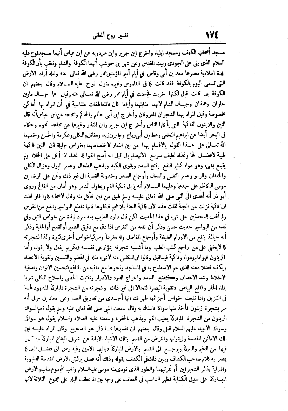مسجد أصحاب الكهف ومسجد إيلياء وأخرج ابن جرير وابن مردويه عن ابن عباس أنهما مسجد نوح عليه السلام الذي بني على الجودي وبيت المقدس وعن شهر بن حوشب أنهما الكوفة والشام وتعقب بأن الكوفة بلدة إسلامية مصرها سعد بن أبي وقاص في أيام أمير المؤمنين عمر رضي الله تعالى عنه ولعله أراد الأرض التي تسمى اليوم بالكوفة فقد كانت كما في القاموس وغيره منزل نوح عليه السلام وقال بعضهم أن الكوفة بلد كانت قبل لكنها خربت فجددت في أيام عمر رضي الله تعالى عنه وقيل هما جبال ما بين حلوان وهمذان وجبال الشام لأنهما منابتهما وأياما كان فالمتعاطفات متناسبة في أن المراد بها أماكن مخصوصة وقيل المراد بهما الشجران المعروفان وأخر ابن أبي حاتم والحاكم وصححه عن أبن عباس أنه قال التين والزيتون الفاكهة التي يأكلها الناس وأخرج ابن جرير وابن المنذر وغيرهما عن مجاهد نحوه وحكاه في البحر أيضا عن إبراهيم النخعي وعطاء بن أبي رباح وجابر بن زيد ومقاتل والكلبي وعكرمة والحسن وخصهما الله تعالى على هذا القول بالإقسام بهما من بين الثمار لاختصاصهما بخواص جليلة فإن التين فاكهة طيبة لا فضل لها وغذاء سريع الأنهضام بل قيل أنه أصح الفواكه غذاء إذا أكل على الخلاء ولم يتبع بشيء وهو دواء كثير النفع يفتح السدد ويقوي الكبد ويذهب الطحال وعسر البول وهزال الكلي والخفقان والربو وعسر النفس والسعال وأوجاع الصدر وخشونة القصبة إلى غير ذلك وعن علي الرضا بن موسى الكاظم على جدهما وعليهما السلام أنه يزيل نكهة الفم ويطول الشعر وهو أمان من الفالج وروي أبو ذر أنه أهدى إلى النبي صلى الله تعالى عليه وسلم طبق من تين فأكل منه وقال لأصحابه كلوا فلو قلت إن فاكهة نزلت من الجنة لقلت هذه لأن فاكهة الجنة بلا عجم فكلوها فإنها تقطع البواسير وتنفع من النقرس ولم أقف للمحدثين على شيء في هذا الحديث لكن قال داود الطبيب بعد سرد نبذة من خواص التين وفي نفعه من البواسير حديث حسن وذكر أن نفعه من النقرس إذا دق دقيق الشعير أو القمح أو الحلبة وذكر أنه حينئذ من الأورام الغليظة وأوجاع المفاصل وله مفردا ومركبا خواص أخرى كثيرة وكذا لشجرته كما لا يخفى على من راجع كتب الطب وما أشبه شجرته بمؤثر على نفسه وبكريم يفعل ولا يقول وأما الزيتون فهو دام ودواء وفاكهة فيما قيل وقالوا إن المكلس منه لا شيء مثله في الهضم والتسمين وتقوية الأعضاء ويكفيه فضلا دهنه الذي عم الأصطباح به في المساجد ونحوها مع ما فيه من المنافع كتحسين الألوان وتصفية الأخلاط وشد الأعصاب وكفتح السدد وإخراج الدود والأدرار وتفتيت الحصى وإصلاح الكلى شربا بالماء وكقلع البياض وتقوية البصر اكتحالا إلى غير ذلك وشجرته من الشجرة المباركة المشهود لها في التنزيل وإذا تتبعت خواص أجزائها ظهر لك أنها أجدى من تفاريق العصا وعن معاذ بن جبل أنه مر بشجرة زيتون فأخذ منها سواكا فاستاك به وقال سمعت النبي صلى الله تعالى عليه وسلم يقول نعم السواك الزيتون من الشجرة المباركة يطيب الفم ويذهب بالحفرة وسمعته عليه الصلاة و السلام يقول هو سواكي وسواك الأنبياء عليهم السلام وقال بعضهم إن تفسيرهما بما ذكر هو الصحيح وكأن المراد عليه تين تلك الأماكن المقدسة وزيتونها والغرض من القسم بتلك الأبانة عن شرف البقاع المباركة وما ظهر فيها من الخير والبركة ويرجع إلى القسم بالأرض المباركة وبالبلد الأمين وفيه رمز إلى فضل البلد كما يشعر به كلام صاحب الكشاف وبين ذلك في الكشف بقوله وذلك أنه فصل بركتي الأرض المقدسة الدنيوية والدينية بذكر الشجرتين أو تمرتيهما والطور الذي نودي منه موسى عليه السلام وناب المجموع مناب والأرض المباركة على سبيل الكناية فظهر التناسب في العطف على وجه بين إذ عطف البلد على مجموع الثلاثة لأنها