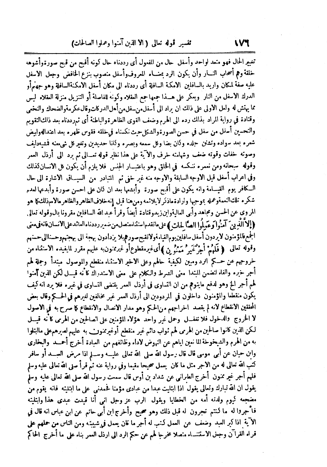 تغيير الحال فهو متعد لواحدة وأسفل حال من المفعول أي رددناه حال كونه أقبح من قبح صورة وأشوهه خلقة وهم أصحاب النار وأن يكون الرد بمعناه المعروف وأسفل منصوب بنزع الخافض وجعل الأسفل عليه صفة لمكان وأريد بالسافلين الأمكنة السافلة أي رددناه إلى مكان أسفل الأمكة السالفة وهو جهنم أو الدرك الأسفل من النار ويعكر على هذا جمعها جمع العقلاء وكونه للفاصلة أو التنزيل منزلة العقلاء ليس مما يهتش له ولعل الأولى على ذلك أن يراد إلى أسفل من سفل من أهل الدركات وقال عكرمة والضحاك والنخعي وقتادة في رواية المراد بذلك رده إلى الهرم وضعف القوى الظاهرة والباطنة أي ثم رددناه بعد ذلك التقويم والتحسين أسفل من سفل في حسن الصورة والشكل حيث نكسناه في خلقه فقوس ظهره بعد اعتداله وابيض شعره بعد سواده وتشنن جلده وكان بضا وكل سمعه وبصره وكانا حديدين وتغير كل شيء منه فمشيه دليف وصوته خفات وقوته ضعف وشهامته خرف والآية على هذا نظير قوله تعالى ثم يرد إلى أرذل العمر وقوله سبحانه ومن نعمره ننكسه في الخلق وهو باعتبار الجنس فلا يلزم أن يكون كل الإنسان كذلك وفي إعراب أسفل قيل الأوجه السابقة منه غير خفي ثم المتبادر من السياق الإشارة إلى حال الكافر يوم القيامة وأنه يكون على أقبح صورة وأبشعها بعد أن كان على أحسن صورة وأبدعها لعدم شكره تلك النعمة وعمله بموجبها وإرادة ما ذكر لا يلائمه ومن هنا قيل إنه خلاف الظاهر والظاهر ما لاءم ذلك كما هو المروي عن الحسن ومجاهد وأبي العالية وابن زيد وقتادة أيضا وقرأ عبد الله السالفين مقرونا بأل وقوله تعالى إلا الذين آمنوا وعملوا الصالحات على ما تقدم استثناء متصل من ضمير رددناه العائد على الإنسان فإنه في معنى الجمع فالمؤمنون لا يردون أسفل سافلين يوم القيامة ولا تقبح صورهم بل يزدادون بهجة إلى بهجتهم وحسنا إلى حسنهم وقوله تعالى فلهم أجر غير ممنون أي غير مقطوع أو غير ممنون به عليهم مقرر لما يفيده الأستثناء من خروجهم عن حكم الرد ومبين لكيفية حالهم وعلى الأخير الأستثناء منقطع والموصول مبتدأ وجملة لهم أجر خبره والفاء لتضمن المبتدأ معنى الشرط والكلام على معنى الأستدراك كأنه قيل لكن الذين آمنوا لهم أجر الخ وهو لدفع ما يتوهم من أن التساوي في أرذل العمر يقتضي التساوي في غيره فلا يرد أنه كيف يكون منقطعا والمؤمنون داخلون في المردودين إلى أرذل العمر غير مخالفين لغيرهم في الحكم وقال بعض المحققين الأنقطاع لأنه لم يقصد إخراجهم من الحكم وهو مدار الأتصال والأنقطاع كما صرح به في الأصول لا الخروج وادلخول فلا تغفل وحمل غير واحد هؤلاء المؤمنين على الصالحين من الهرمي كأنه قيل لكن الذين كانوا صالحين من الهرمي لهم ثواب دائم غير منقطع أو غير ممنون به عليهم لصبرهم على ما بتلوا به من الهرم والشيخوخة المانعين إياهم عن النهوض لاداء وظائفهم من العبادة أخرج أحمد والبخاري وابن حبان عن أبي موسى قال قال رسول الله صلى الله تعالى عليه وسلم إذا مرض العبد أو سافر كتب الله تعالى له من الأجر مثل ما كان يعمل صحيحا مقيماوفي رواية عنه ثم قرأ صلى الله تعالى عليه وسلم فلهم أجر غير ممنون أخرج الطبراني عن شداد بن أوس قال سمعت رسول الله صلى الله تعالى عليه وسلم يقول إن الله تبارك وتعالى يقول إذا ابتليت عبدا من عبادي مؤمنا فحمدني على ما أبتليه فإنه يقوم من مضجعه كيوم ولدته أمه من الخطايا ويقول الرب عز و جل إني أنا قيدت عبدي هذا وابتليته فأجروا له ما كنتم تجرون له قبل ذلك وهو صحيح وأخرج ابن أبي حاتم عن ابن عباس أنه قال في الآية إذا كبر العبد وضعف عن العمل كتب له أجر ما كان يعمل في شبيبته ومن الناس من حملهم على قراء القرآن وجعل الأستثناء متصلا مخرجا لهم عن حكم الرد إلى أرذل العمر بناء على ما أخرج الحاكم