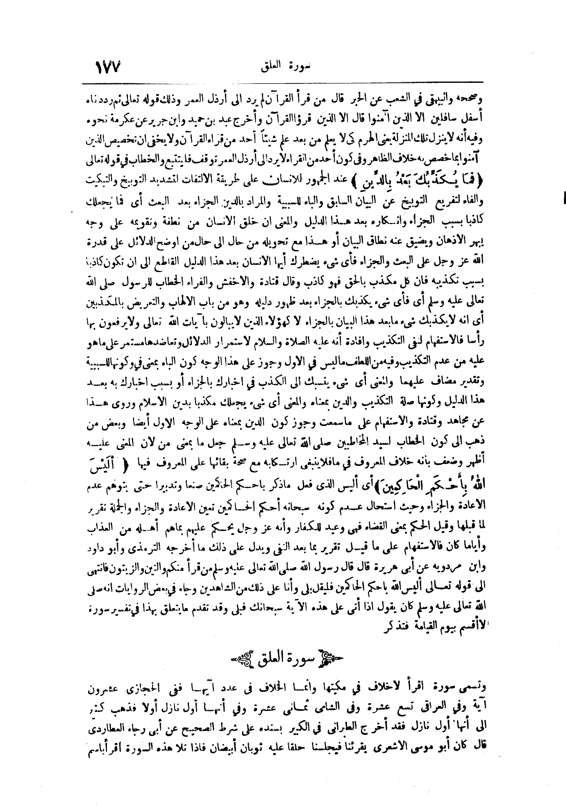 وتسمى سورة اقرأ لا خلاف في مكيتها وإنما الخلاف في عدد آيها ففي الحجازي عشرون آية وفي العراقي تسع عشرة وفي الشامي ثماني عشرة وفي أنها أول نازل أولا فذهب كثير إلى أنها أول نازل فقد أخرج الطبراني في الكبير بسنده على شرط الصحيح عن أبي رجاء العطاردي قال كان أبو موسى الأشعر يقرئنا فيجلسنا حقا عليه ثوبان أبيضان فإذا تلا هذه السورة اقرأ باسم