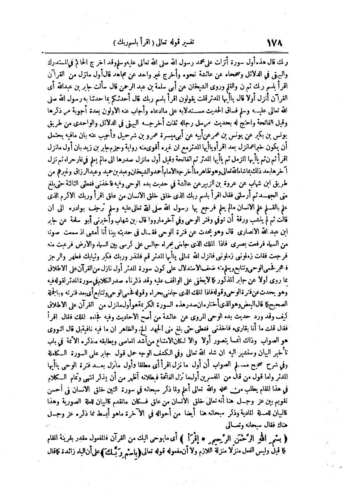 ربك قال هذه أول سورة أنزلت على محمد رسول الله صلى الله تعالى عليه وسلم وقد أخرج الحاكم في المستدرك والبيهقي في الدلائل وصححاه عن عائشة نحوه وأخرج غير واحد عن مجاهد قال أول ما نزل من القرآن اقرأ باسم ربك ثم ن والقلم وروي الشيخان عن أبي سلمة بن عبد الرحمن قال سألت جابر بن عبد الله أي القرآن أنزل أولا قال يا أيها المدثر قلت يقولون اقرأ باسم ربك قال أحدثكم بما حدثنا به رسول الله صلى الله تعالى عليه وسلم فساق الحديث مستدلا به على ما ادعاه وأجاب عنه الأولون بعدة أجوبة مر ذكرها وقيل الفاتحة واحتج له بحديث مرسل رجاله ثقات أخرجه البيهقي في الدلائل والواحدي من طريق يونس بن بكير عن يونس بن عمر عن أبيه عن أبي ميسرة عمرو بن شرحبيل وأجيب عنه بأن ما فيه يحتمل أن يكون خبرا عما نزل بعد اقرأ ويا أيها المدثر مع أن غيره أقوى منه رواية وجزم جابر بن زيد بأن أول ما نزل اقرأ ثم ن ثم يا أيها المزمل ثم يا أيها المدثر ثم الفاتحة وقيل أول ما نزل صدرها إلى ما لم يعلم في غار حراء ثم نزل آخرها بعد ذلك بما شاء الله تعالى وهو ظاهر ما أخرجه الإمام أحمد والشيخان وعبد بن حميد وعبد الرزاق وغيرهم من طريق ابن شهاب عن عروة بن الزبير عن عائشة في حديث بدء الوحي وفيه فأخذني فغطني الثالثة حتى بلغ مني الجهد ثم أرسلني فقال اقرأ باسم ربك الذي خلق خلق الإنسان من علق اقرأ وربك الأكرم الذي علم بالقلم علم الإنسان ما لم يعلم فرجع بها رسول الله صلى الله تعالى عليه وسلم ترجف بوادره إلى أن قالت ثم لم ينشب ورفة أن توفي وفتر الوحي وفي آخرها ما رووا قال بن شهاب وأخبرني أبو سلمة عن جابر ابن عبد الله الأنصاري قال وهو يحدث عن فترة الوحي فقال في حديثه بينا أنا أمشي إذ سمعت صوتا من السماء فرفعت بصري فإذا الملك الذي جاءني بحراء جالس على كرسي بين السماء والأرض فرعبت منه فرجعت فقلت زملوني فأنزل الله تعالى يا أيها المدثر قم فأنذر وربك فكبر وثيابك فطهر والرجز فاهجر فمحى الوحي وتتابع ويعلم منه ضعف الأستدلال على كون سورة المدثر أول نازل من القرآن على الإطلاق بما روي أولا عن جابر كما لا يخفى على الواقف عليه وقد ذكرناه صدر الكلام في سورة المدثر لقوله فيه وهو يحدث عن فترة الوحي وقوله فإذا الملك الذي جاءني بحراء وقوله فمحي الوحي وتتابع أي بعد فترته وبالجملة الصحيح كما قال البعض وهو الذي اختاره إن صدر هذه السورة الكريمة هو أول ما أنزل من القرآن على الإطلاق كيف وقد ورد حديث بدء الوحي المروي عن عائشة من أصح الأحاديث وفيه فجاءه الملك فقال اقرأ فقال قلت ما أنا بقاريء فأخذني فغطني حتى بلغ مني الجهد الخ والظاهر أن ما فيه نافية بل قال النووي هو الصواب وذلك إنما يتصور أولا وإلا لكان الأمتناع من أشد المعاصي ويطابقه ما ذكره الأئمة في باب تأخير البيان وسنشير إليه إن شاء الله تعالى وفي الكشف الوجه حمل قول جابر على السورة الكاملة وفي شرح صحيح مسلم الصواب أن أول ما نزل اقرأ أي مطلقا وأول ما نزل بعد فترة الوحي يا أيها المدثر وأما قول من قال من المفسرين أول ما نزل الفاتحة فبطلانه أظهر من أن يذكر انتهى وتمام الكلام في هذا المقام يطلب من محله والله تعالى أعلم ولما ذكر سبحانه في سورة التين خلق الإنسان في أحسن تقويم بين عز و جل هنا أنه تعالى خلق الإنسان من علق فكان ما تقدم كالبيان للعلة الصورية وهذا كالبيان للعلة المادية وذكر سبحانه هنا أيضا من أحواله في الآخرة ما هو أبسط مما ذكره عز و جل هناك فقال سبحانه وتعالى بسم الله الرحمن الرحيم