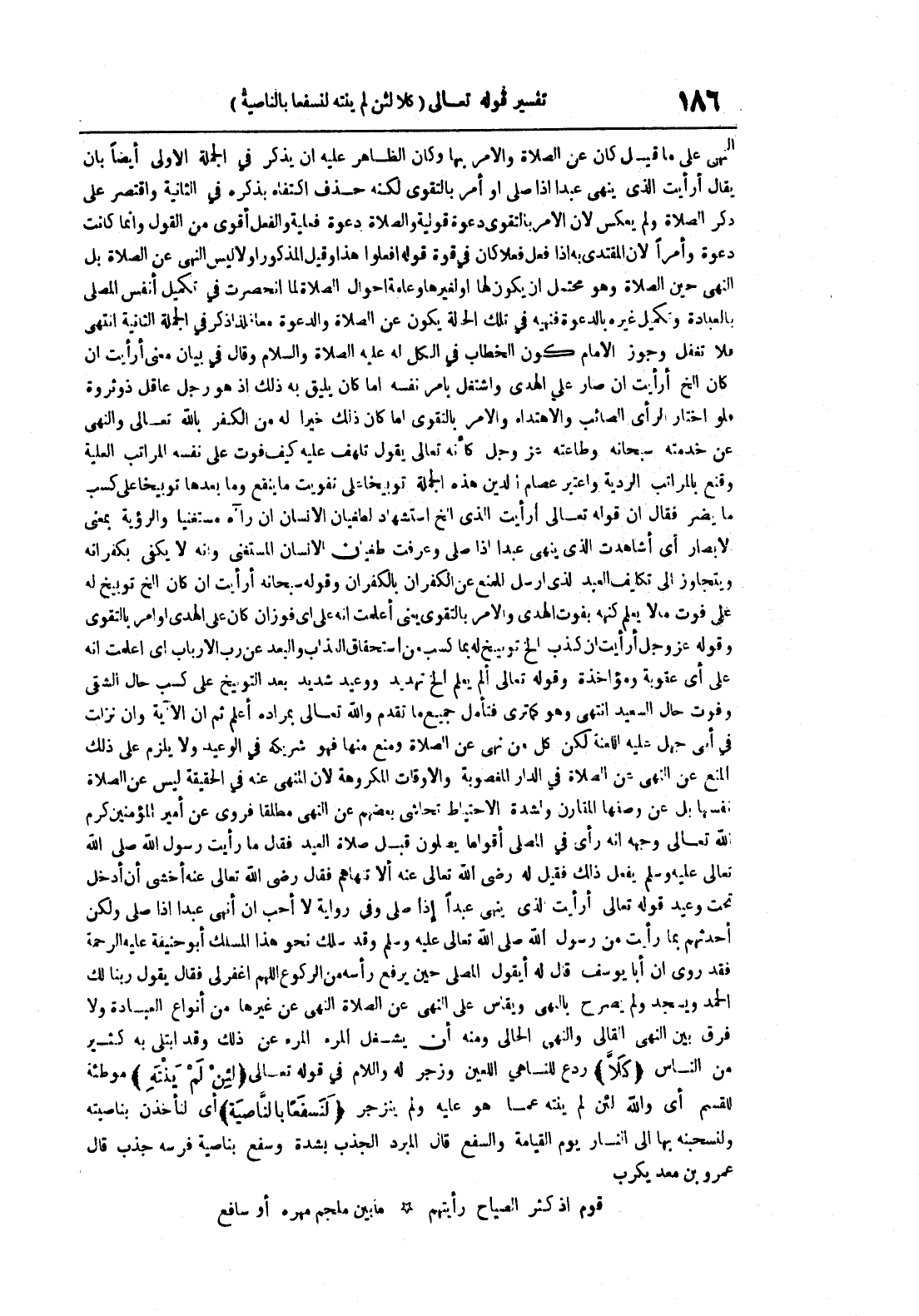 النهي على ما قيل كان عن الصلاة والأمر بها وكان الظاهر عليه أن يذكر في الجملة الأولى أيضا بأن يقال أرأيت الذي ينهى عبدا إذا صلى أو أمر بالتقوى لكنه حذف اكتفاء بذكره في الثانية واقتصر على ذكر الصلاة ولم يعكس لأن الأمر بالتقوى دعوة قولية والصلاة دعوة فعلية والفعل أقوى من القول وإنما كانت دعوة وأمرا لأن المقتدي به إذا فعل فعلا كان في قوة قوله افعلوا هذا وقيل المذكور أولا ليس النهي عن الصلاة بل النهي حين الصلاة وهو محتمل أن يكون لها أو لغيرها وعامة أحوال الصلاة لما انحصرت في تكميل أنفس المصلي بالعبادة وتكميل غيره بالدعوة فنهيه في تلك الحالة يكون عن الصلاة والدعوة معا فلذا ذكر في الجملة الثانية انتهى فلا تغفل وجوز الإمام كون الخطاب في الكل له عليه الصلاة و السلام وقال في بيان معنى أرأيت إن كان الخ أرأيت إن صار على الهدى واشتغل بأمر نفسه أما كان يليق به ذلك إذ هو رجل عاقل ذو ثروة فلو اختار الرأي الصائب والأهتداء والأمر بالتقوى أما كان ذلك خيرا له من الكفر بالله تعالى والنهي عن خدمته سبحانه عز و جل كأنه تعالى يقول تلهف عليه كيف فوت على نفسه المراتب العلية وقنع بالمراتب الردية واعتبر عصام الدين هذه الجملة توبيخا على تفويت ما ينفع وما بعدها توبيخا على كسب ما يضر فقال إن قوله تعالى أرأيت الذي الخ استشهاد لطغيان الإنسان إن رآه مستغنيا والرؤية بمعنى لأبصار أي أشاهدت الذي ينهى عبدا إذا صلى وعرفت طغيان الإنسان المستغني وأنه لا يكفي بكفرانه ويتجاوز إلى تكليف العبد الذي أرسل للمنع عن الكفران بالكفران وقوله سبحانه أرأيت إن كان الخ توبيخ له على فوت ما لا يعلم كنهه بفوت الهدى والأمر بالتقوى يعني أعلمت أنه على أي فوزان كان على الهدى أو أمر بالتقوى وقوله عز و جل أرأيت إن كذب الخ توبيخ له بما كسب من استحقاق العذاب والبعد عن رب الأرباب أي أعلمت أنه على عقوبة ومؤاخذة وقوله تعالى ألم يعلم الخ تهديد ووعيد شديد بعد التوبيخ على كسب حال الشقي وفوت حال السعيد انتهى وهو كما ترى فتأمل جميع ما تقدم والله تعالى بمراده أعلم ثم إن الآية وإن نزلت في أبي جهل عليه اللعنة لكن كل من نهى عن الصلاة ومنع منها فهو شريكه في الوعيد ولا يلزم على ذلك المنع عن النهي عن الصلاة في الدار المغضوبة والأوقات المكروهة لأن المنهي عنه في الحقيقة ليس عن الصلاة نفسها بل عن وصفها المقارن وأشد الأحتياط تحاشي بعضهم عن النهي مطلقا فروي عن أمير المؤمنين كرم الله تعالى وجهه أنه رأى في المصلى أقواما المكروهة لأن المنهي مطلقا فروي عن أمير المؤمنين كرم الله تعالى وجهه أنه رأى في المصلى أقواما يصلون قبل صلاة العيد فقال ما رأيت رسول الله صلى الله تعالى عليه وسلم يفعل ذلك فقيل له رضي الله تعالى عنه ألا تنهاهم فقال رضي الله تعالى عنه أخشى أن أدخل تحت وعيد قوله تعالى أرأيت الذي ينهى عبدا إذا صلى وفي رواية لا أحب أن أنهى عبدا إذا صلى ولكن أحدثهم بما رأيت من رسول الله صلى الله تعالى عليه وسلم وقد سلك نحو هذا المسلك أبو حنيفة عليه الرحمة فقد روي أن أبا يوسف قال له أيقول المصلي حين يرفع رأسه من الركوع اللهم اغفر لي فقال يقول ربنا لك الحمد ويسجد ولم يصرح بالنهي ويقاس على النهي عن الصلاة النهي عن غيرها من أنواع العبادة ولا فرق بين النهي القالي والنهي الحالي ومنه أن يشغل المرء عن ذلك وقد ابتلي به كثير من الناس كلا ردع للناهي اللعين وزجر له واللام في قوله تعالى لئن لم ينته موطئة للقسم أي والله لئن لم ينته عما هو عليه ولم ينزجر لنسفعا بالناصية أي لنأخذن بناصيته ولنسحبنه بها إلى النار يوم القيامة والسفع قال المبرد الجذب بشدة وسفع بناصية فرسه جذب قال عمرو بن معد يكرب قوم إذ كثر الصياح رأيتهم