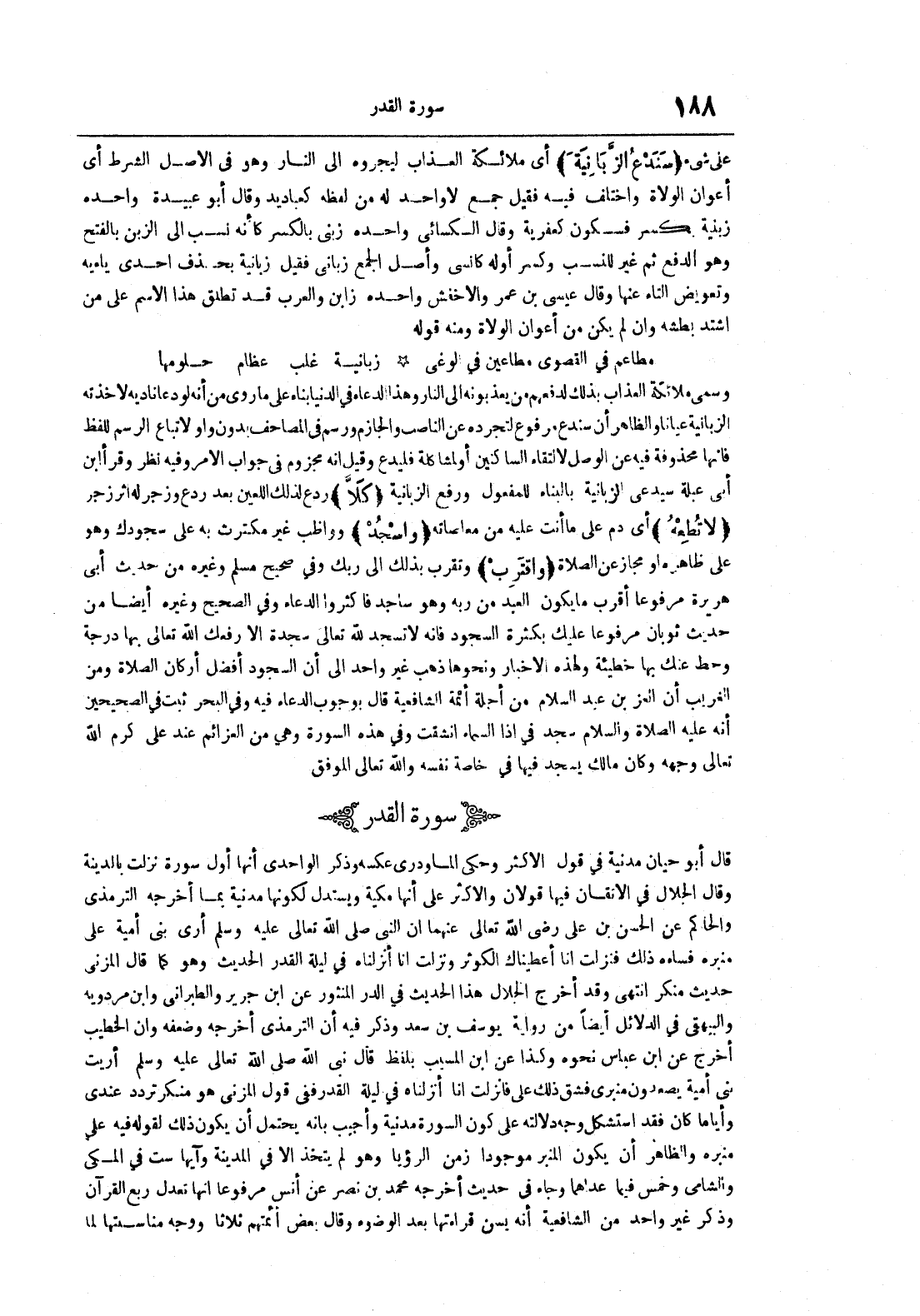 على شيء سندع الزبانية أي ملائكة العذاب ليجروه إلى النار وهو في الأصل الشرط أي أعوان الولاة واختلف فيه فقيل جمع لا واحد له من لفظه كعباديد وقال أبو عبيدة زبنية بكسر فسكون كعفرية وقال الكسائي واحده زبني بالكسر كأنه نسب إلى الزبن بالفتح وهو الدفع ثم غير للنسب وكسر أوله كأنسي وأصل الجمع زباني فقيل زبانية بحذف إحدى ياءيه وتعويض التاء عنها وقال عيسى بن عمر والأخفش واحده وابن والعرب قد تطلق هذا الأسم على من اشتد بطشه وإن لم يكن من أعوان الولاة ومنه قوله مطاعم في القصوى مطاعين في الوغى