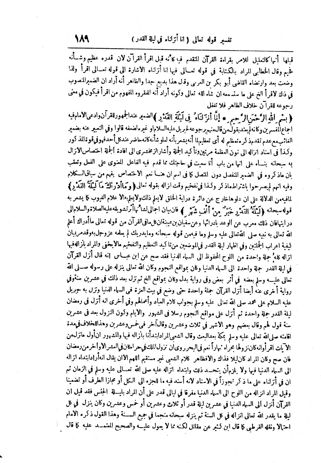 قبلها أنها كالتعليل للأمر بقراءة القرآن المتقدم فيه كأنه قيل اقرأ القرآن لأن قدره عظيم وشأنه فخيم وقال الخطابي المراد بالكتابة في قوله تعالى فيها أنا أنزلناه إلى قوله تعالى ولذا وضعت بعد وارتضاه القاضي أبو بكر بن العربي وقال هذا بديع جدا والظاهر أنه أراد أن الضمير المنصوب في ذاك لأقرأ الخ على ما ستسمعه أن شاء الله تعالى أراد أنه للمقروء من قرأ فيكون في معنى رجوعه للقرآن خلاف الظاهر فلا تغفل بسم الله الرحمن الرحيم