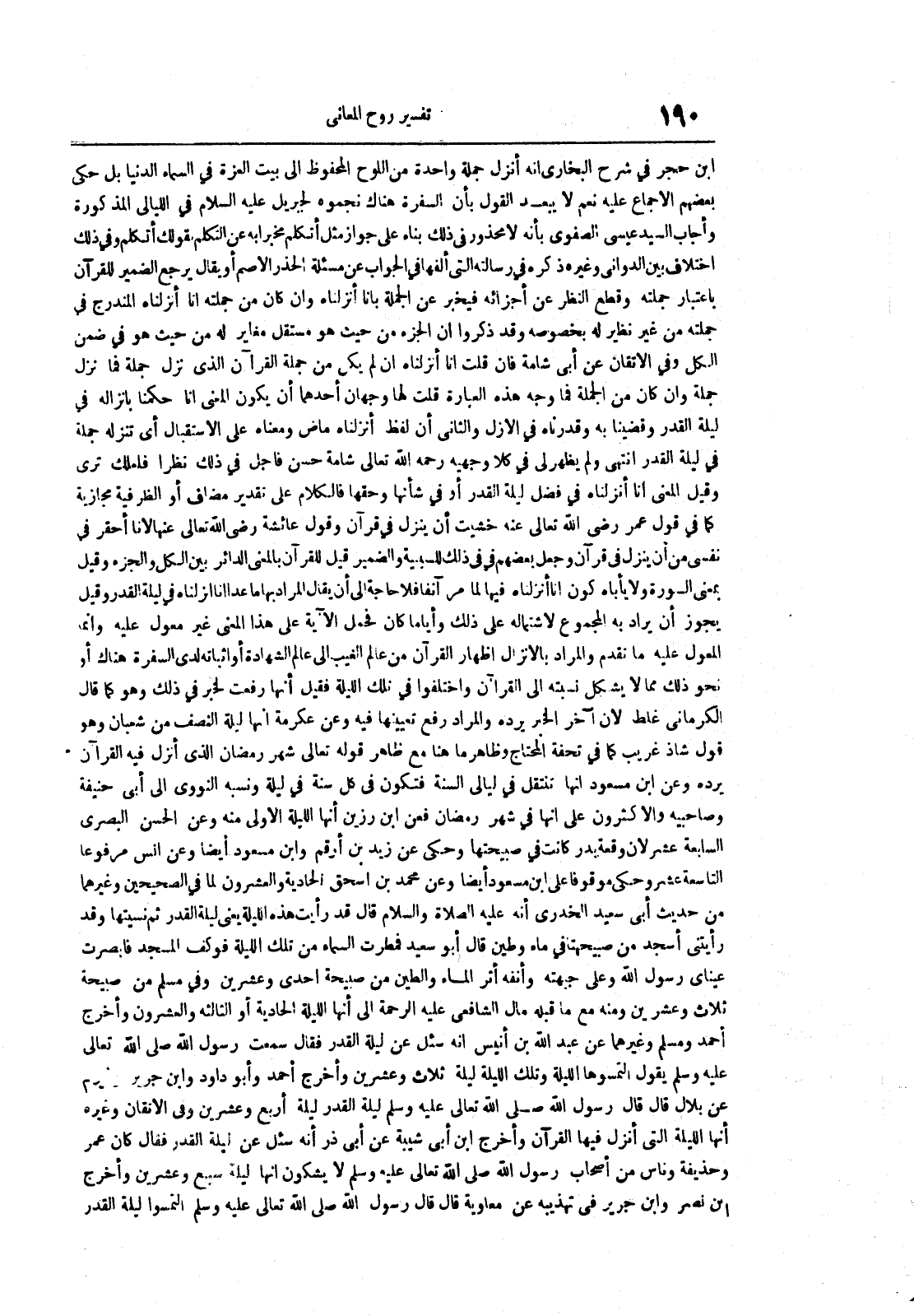 ابن حجر في شرح البخاري أنه أنزل جملة واحدة من اللوح المحفوظ إلى بيت العزة في السماء الدنيا بل حكى بعضهم الإجماع عليه نعم لا يبعد القول بأن السفرة هناك نجموه لجبريل عليه السلام في الليالي المذكورة وأجاب السيد عيسى الصفوي بأنه محذور في ذلك بناء على جواز مثل أتكلم مخبرا به عن التكلم بقولك أتكلم وفي ذلك اختلاف بين الدواني وغيره ذكره في رسالته التي ألفها في الجواب عن مسئلة الحذر الأصم أو يقال يرجع الضمير للقرآن باعتبار جملته وقطع النظر عن أجزائه فيخبر عن الجملة بأنا أنزلناه وأن كان من جملته أنا أنزلناه وإن كان من جملته أنا أنزلناه المندرج في جملته من غير نظير له بخصوصه وقد ذكروا أن الجزء من حيث من هو مستقل مغاير له من حيث هو في ضمن الكل وفي الإتقان عن أبي شامة فإن قلت أنا أنزلناه أن لم يكن من جملة القرآن الذي نزل جملة فما نزل جملة وإن كان من الجملة فما وجه هذه العبارة قلت لها وجهان أحدهما أن يكون المعنى أنا حكمنا بإنزاله في ليلة القدر وقضينا به وقدرناه في الأزل والثاني أن لفظ أنزلناه ماض ومعناه على الأستقبال أي تنزله جملة في ليلة القدر انتهى ولم يظهر لي في كلا وجهيه رحمه الله تعالى شامة حسن فأجل في ذلك نظرا فلعلك ترى وقيل المعنى أنا أنزلناه في فضل ليلة القدر أو في شأنها وحقها فالكلام على تقدير مضاف أو الظرفية مجازية كما في قول عمر رضي الله تعالى عنه خشيت أن ينزل في قرآن وقول عائشة رضي الله تعالى عنها لا أنا أحقر في نفسي من أن ينزل في قرآن وجعل بعضهم في ذلك للسببية والضمير قيل للقرآن بالمعنى الدائر بين الكل والجزء وقيل بمعنى السورة ولا يأباه كون أنا أنزلناه فيها لما مر آنفا فلا حاجة إلى أن يقال المراد بها ما عدا أنا أنزلناه في ليلة القدر وقيل يجوز أن يراد به المجموع لاشتماله على ذلك وأيا ما كان فحمل الآية على هذا المعنى غير معول عليه وإنما المعول عليه ما تقدم والمراد بالإنزال إظهار القرآن من عالم الغيب إلى عالم الشهادة أو إثباته لدى السفرة هناك أو نحو ذلك مما لا يشكل نسبته إلى القرآن واختلفوا في تلك الليلة فقيل أنها لخبر في ذلك وهو كما قال الكرماني غلط لأن آخر الخبز يرده والمراد برفع تعيينها فيه وعن عكرمة أنها ليلة النصف من شعبان وهو قول شاذ غريب كما في تحفة المحتاج وظاهر ما هنا مع ظاهر قوله تعالى شهر رمضان أنزل فيه القرآن يرده وعن ابن مسعود أنها تنتقل في ليالي السنة فتكون في كل سنة في ليلة ونسبه النووي إلى أبي حنيفة وصاحبيه والأكثرون على أنها في شهر رمضان فعن ابن رزين أنها الليلة الأولى منه وعن الحسن البصري السابعة عشر لأن وقعة بدر كانت في صبيحتها وحكى عن زيد بن أرقم وابن مسعود أيضا وعن أنس مرفوعا التاسعة وحكى مرفوعا على ابن مسعود أيضا وعن محمد بن إسحاق الحادية العشرون لما في الصحيحين وغيرهما من حديث ابن سعيد الخدري أنه عليه الصلاة و السلام قال قد رأيت هذه الليلة يعني ليلة القدر ثم نسيتها وقد رأيتني أسجد من صبيحتها في ماء وطين قال أبو سعيد فمطرت السماء من تلك الليلة فوكف المسجد فأبصرت عيناي رسول الله وعلى جبهته وأنفه أثر الماء الطين من صبيحة إحدى وعشرين وفي مسلم من صبيحة ثلاث وعشرين ومنه مع ما قبله مال الشافعي عليه الرحمة إلى أنها الليلة الحادية أو الثالثة والعشرون وأخرج أحمد ومسلم وغيرهما عن عبد الله بن أنيس أنه سئل عن ليلة القدر فقال سمعت رسول الله صلى الله تعالى عليه وسلم يقول التمسوها الليلة ليلة ثلاث وعشرين وأخرج أحمد وأبو داود وابن جرير وغيرهم عن بلال قال رسول الله صلى الله تعالى عليه وسلم ليلة القدر ليلة أربع وعشرين وفي الأتقان وغيره أنها الليلة التي أنزل فيها القرآن وأخرج ابن أبي شيبة عن أبي ذر أنه سئل عن ليلة القدر فقال كان عمر وحذيفة من أصحاب رسول الله صلى الله تعالى عليه وسلم لا يشكون أنها ليلة سبع وعشرين وأخرج ابن نصر وابن جرير في تهذيبه عن معاوية قال قال رسول الله صلى الله تعالى عليه وسلم التمسوا ليلة القدر