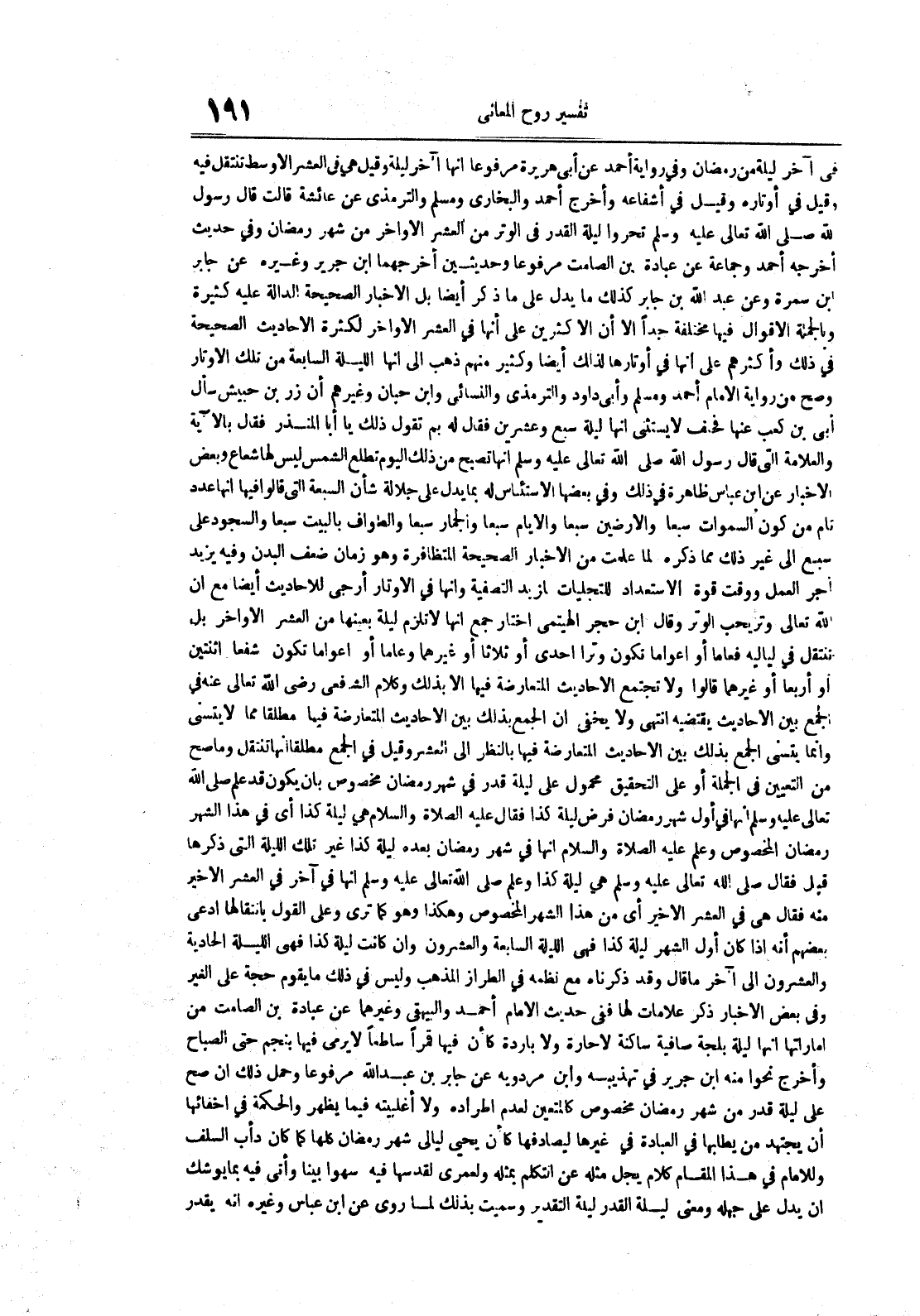 في آخر ليلة من رمضان وفي رواية أحمد عن أبي هريرة مرفوعا أنها آخر ليلة وقيل هي في العشر الأوسط تنتقل فيه قيل في أوتاره وقيل في أشفاعه وأخرج أحمد والبخاري ومسلم والترمذي عن عائشة قالت قال رسول الله صلى الله تعالى عليه وسلم تحروا ليلة القدر في الوتر من العشر الأواخر من شهر رمضان وفي حديث أخرجه أحمد وجماعة عن عبادة بن الصامت مرفوعا وحديثين أخرجهما ابن جرير وغيره عن جابر ابن سمرة وعن عبد الله بن جابر كذلك ما يدل على ما ذكر أيضا بل الأخبار الصحيحة الدالة عليه كثيرة وبالجملة الأقوال فيها مختلفة جدا إلا أن الأكثرين على أنها في العشر الأواخر لكثرة الأحاديث الصحيحة في ذلك وأكثرهم على أنها أوتارها لذلك وكثير منهم ذهب إلى أنها الليلة السابعة من تلك الأوتار وصح من رواية الإمام أحمد ومسلم وأبي داود الترمذي والنسائي وابن حبان وغيرهم أن زر بن حبيش سأل أبي كعب عنها فخلق لا يستثني أنها ليلة سبع وعشرين فقال له بم تقول ذلك يا أبا المنذر فقال بالآية والعلامة التي قال رسول الله صلى الله تعالى عليه وسلم أنها تصبح من ذلك اليوم تطلع الشمس ليس لها شعاع وبعض الأخبار عن ابن عباس ظاهرة في ذلك وفي بعضها الأستئناس له بما يدل على جلالة شأن السبعة التي قالوا فيها أنها عدد تام من كون السماوات سبعا والأرضين سبعا والأيام سبعا والجمار سبعا والطواف بالبيت سبعا السجود على سبع إلى غير ذلك مما ذكره لما علمت من الأخبار الصحيحة المتظافرة وهو زمان البدن وفيه يزيد أجر العمل ووقت قوة الأستعداد للتجليات لمزيد التصفية وأنها في الأوتار أرجى للأحاديث أيضا مع أن الله تعالى وتر يحب الوتر وقال ابن حجر الهيتي أختار جمع أنها لا تلزم ليلة بعينها من العشر الأواخر بل تنتقل في لياليه فعاما أو أعواما تكون وترا إحدى أو ثلاثا أو غيرهما وعاما أو أعواما شفعا اثنتين أو أربعا أو غيرهما قالوا ولا تجتمع الأحاديث المتعارضة فيها إلا بذلك وكلام الشافعي رضي الله تعالى عنه في الجمع بين الأحاديث يقتضيه انتهى ولا يخفى أن الجمع بذلك بين الأحاديث المتعارضة فيها مطلقا مما لا يتسنى وإنما يتسنى الجمع بذلك بين الأحاديث المتعارضة فيها بالنظر إلى العشر وقيل في الجمع مطلقا أنها تنتقل وما صح من التعيين في الجملة أو على التحقيق محمول على ليلة قدر في شهر رمضان مخصوص بأن يكون قد علم صلى الله تعالى عليه وسلم أنها في أول شهر رمضان فرض ليلة كذا فقال عليه الصلاة و السلام هي ليلة كذا أي في هذا الشهر رمضان المخصوص وعلم عليه الصلاة و السلام أنها في شهر رمضان بعده ليلة كذا غير تلك الليلة التي ذكرها قبل فقال صلى الله تعالى عليه وسلم هي ليلة كذا وعلم صلى الله تعالى عليه وسلم أنها في أخر في العشر الأخير منه فقال هي في العشر الأخير أي من هذا الشهر المخصوص وهكذا وهو كما ترى وعلى القول بانتقالها ادعى بعضهم أنه إذا كان أول الشهر ليلة كذا فهي الليلة السابعة والعشرون وأن كانت ليلة كذا فهي الليلة الحادية والعشرون إلى آخر ما قال وقد ذكرناه مع نظمه في الطراز المذهب وليس في ذلك ما يقوم حجة على الغير وفي بعض الأخبار ذكر علامات لها ففي حديث الإمام أحمد والبيهقي وغيرهما عن عبادة بن الصامت من إماراتها أنها ليلة بلجة صافية ساكنة لا حارة ولا باردة كأن فيها قمرا ساطعا لا يرمى فيها بنجم حتى الصباح وأخرج نحوا منه ابن جرير في تهذيبه وابن مردويه عن جابر بن عبد الله مرفوعا وحمل ذلك أن صح على ليلة قدر من شهر رمضان مخصوص كالمتعين لعدم إطراده ولا أغلبيته فيما يظهر والحكمة في إخفائها أن يجتهد من يطلبها في العبادة في غيرها ليصادفها كأن يحيى ليالي شهر رمضان كلها كما كان دأب السلف وللإمام في هذا المقام كلام يجل مثله عن التكلم ولعمري لقدسها فيه سهوا بينا وأتى فيه يوشك أن يدل على جهله ومعنى ليلة القدر ليلة التقدير وسميت بذلك لما روي عن ابن عباس وغيره أنه يقدر