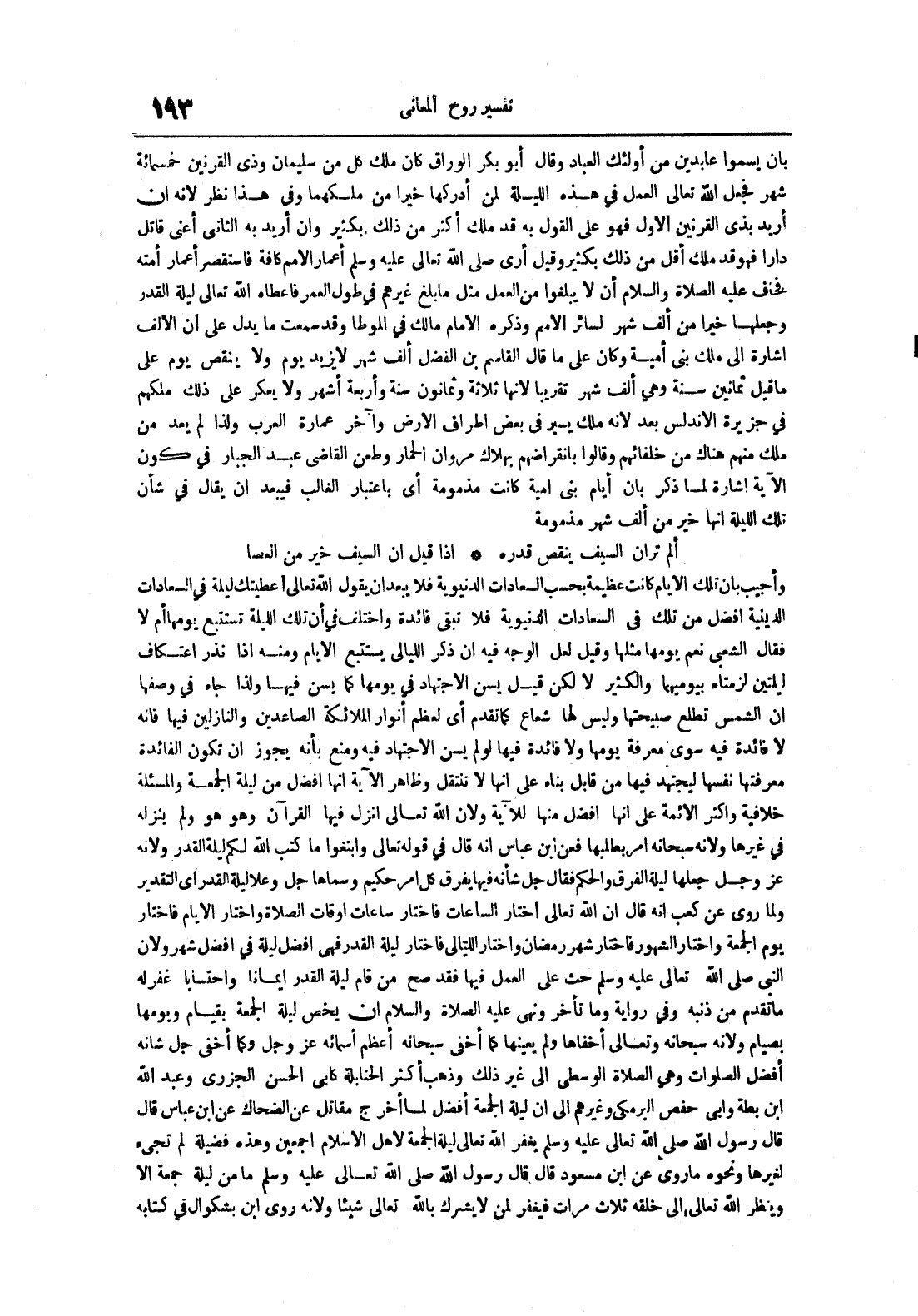 بأن يسموا عابدين من أولئك العباد وقال أبو بكر الوراق كان ملك كل من سليمان وذي القرنين خمسمائة شهر فجعل الله تعالى العمل في هذه الليلة لمن أدركها خيرا من ملكهما وفي هذا نظر لأنه إن أريد بذي القرنين الأول فهو على القول به قد ملك أكثر من ذلك بكثير وإن أريد به الثاني أعني قاتل دارا فهو قد ملك أقل من ذلك بكثير وقيل أرى صلى الله تعالى عليه وسلم أعمار الأمم كافة فاستقصر أعمار أمته فخاف عليه الصلاة و السلام أن لا يبلغوا من العمل مثل ما بلغ غيرهم في طول العمر فأعطاه الله تعالى ليلة القدر وجعلها خيرا من ألف شهر لسائر الأمم وذكره الإمام مالك في الموطأ وقد سمعت ما يدل على أن الألف إشارة إلى ملك بني أمية وكان على ما قال القاسم بن الفضل ألف شهر لا يزيد يوم ولا ينقص يوم على ما قيل ثمانين سنة وهي ألف شهر تقريبا لأنها ثلاثة وثمانون سنة وأربعة أشهر ولا يعكر على ذلك ملكهم في جزيرة الأندلس بعد لأنه ملك يسير في بعض أطراف الأرض وآخر عمارة العرب ولذا لم يعد من ملك منهم هناك من خلفائهم وقالوا بانقراضهم بهلاك مروان الحمار وطعن القاضي عبد الجبار في كون الآية إشارة لما ذكر بأن أيام بني أمية كانت مذمومة أي باعتبار الغالب فيبعد أن يقال في شأن تلك الليلة أنها خير من ألف شهر مذمومة ألم تران السيف ينقص قدره