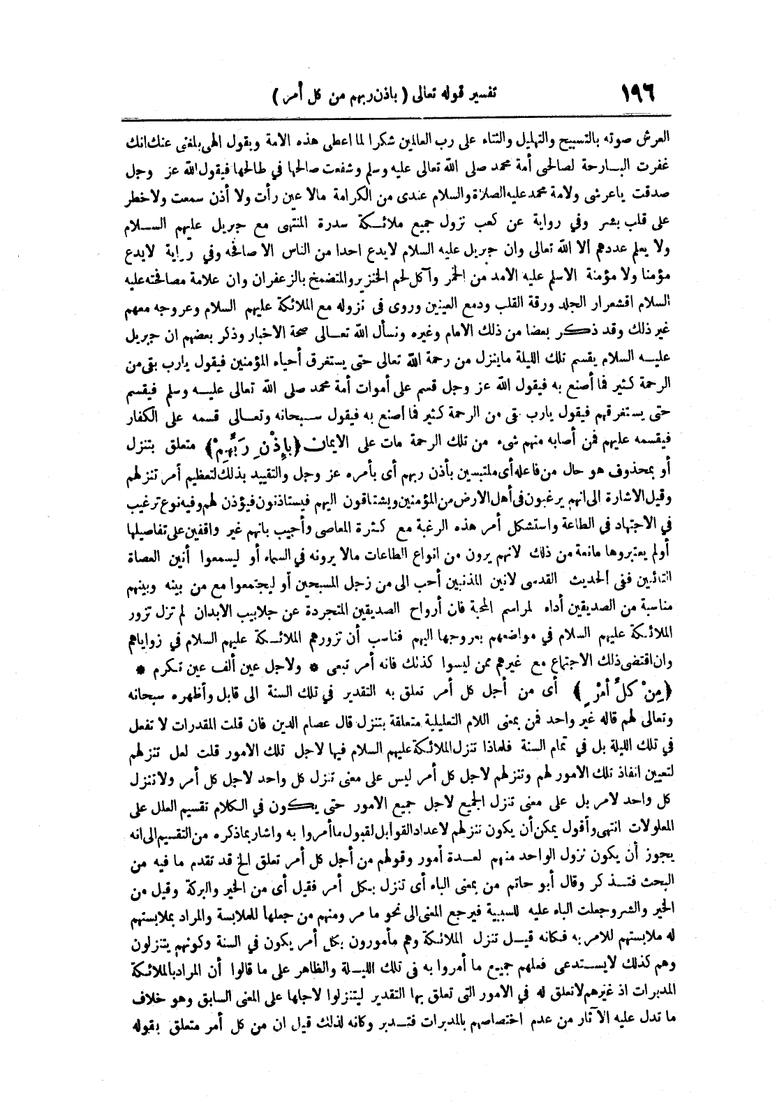 العرش صوته بالتسبيح والتهليل والثناء على رب العالمين شكرا لما أعطى هذه الأمة ويقول إلهي بلغني أنك غفرت البارحة لصالحي أمة محمد صلى الله تعالى عليه وسلم وشفعت صالحها فيقول الله عز و جل صدقت يا عرشي ولأمة محمد عليه الصلاة و السلام عندي من الكلامة ما لا عين رأت ولا أذن سمعت ولا خطر على قلب بشر وفي رواية عن كعب نزول جميع ملائكة سدرة المنتهى مع جبريل عليهم السلام ولا يعلم عددهم إلا الله تعالى وإن جبريل عليه السلام لا يدع أحدا من الناس إلا صافحه وفي رواية لا يدع مؤمنا ولا مؤمنة إلا سلم الأمد من الخمر وآكل لحم الخنزير والمتضمخ بالزعفران وإن علامة مصافحته عليه السلام اقشعرار الجلد ورقة القلب ودمع العينين وروي في نزوله مع الملائكة عليهم السلام وعروجه معهم غير ذلك وقد ذكر بعضا من ذلك الإمام وغيره ونسأل الله تعالى صحة الأخبار وذكر بعضهم أن جبريل عليه السلام يقسم تلك الليلة ما ينزل من رحمة الله تعالى حتى يستغرق أحياء المؤمنين فيقول يا رب بقي من الرحمة كثير فما أصنع به فيقول الله عز و جل قسم على أموات أمة محمد صلى الله تعالى عليه وسلم فيقسم حتى يستغرقهم فيقول يا رب بقي من الرحمة كثير فما أصنع به فيقول سبحانه وتعالى قسمه على الكفار فيقسمه عليهم فمن أصابه منهم شيء من تلك الرحمة مات على الإيمان بإذن ربهم متعلق بتنزل أو بمحذوف وهو حال من فاعله أي ملتبسين بإذن ربهم بأمره عز و جل والتقييد بذلك لتعظيم أمر تنزلهم وقيل الإشارة إلى أنهم يرغبون في أهل الأرض من المؤمنين ويشتاقون إليهم فيستأذنون فيؤذن لهم وفيه نوع ترغيب في الأجتهاد في الطاعة واستشكل أمر هذه الرغبة مع كثرة المعاصي وأجيب بأنهم غير واقفين على تفاصيلها أو لم يعتبروها مانعة من ذلك لأنهم يرون من أنواع الطاعات ما لا يرونه في السماء أو ليسمعوا أنين العصاة التائبين ففي الحديث القدسي لأنين المذنبين أحب إلي من زجل المسبحين أو ليجتمعوا مع من بينه وبينهم مناسبة من الصديقين أداء لمراسم المحبة فإن أرواح الصديقين المتجردة عن جلابيب الأبدان لم تزل تزور الملائكة عليهم السلام في مواضعهم بعروجها إليهم فناسب أن تزورهم ولملائمة عليهم السلام في زواياهم وإن اقتضى ذلك الأجتماع مع غيرهم ممن ليسوا كذلك فإنه أمر تبعي