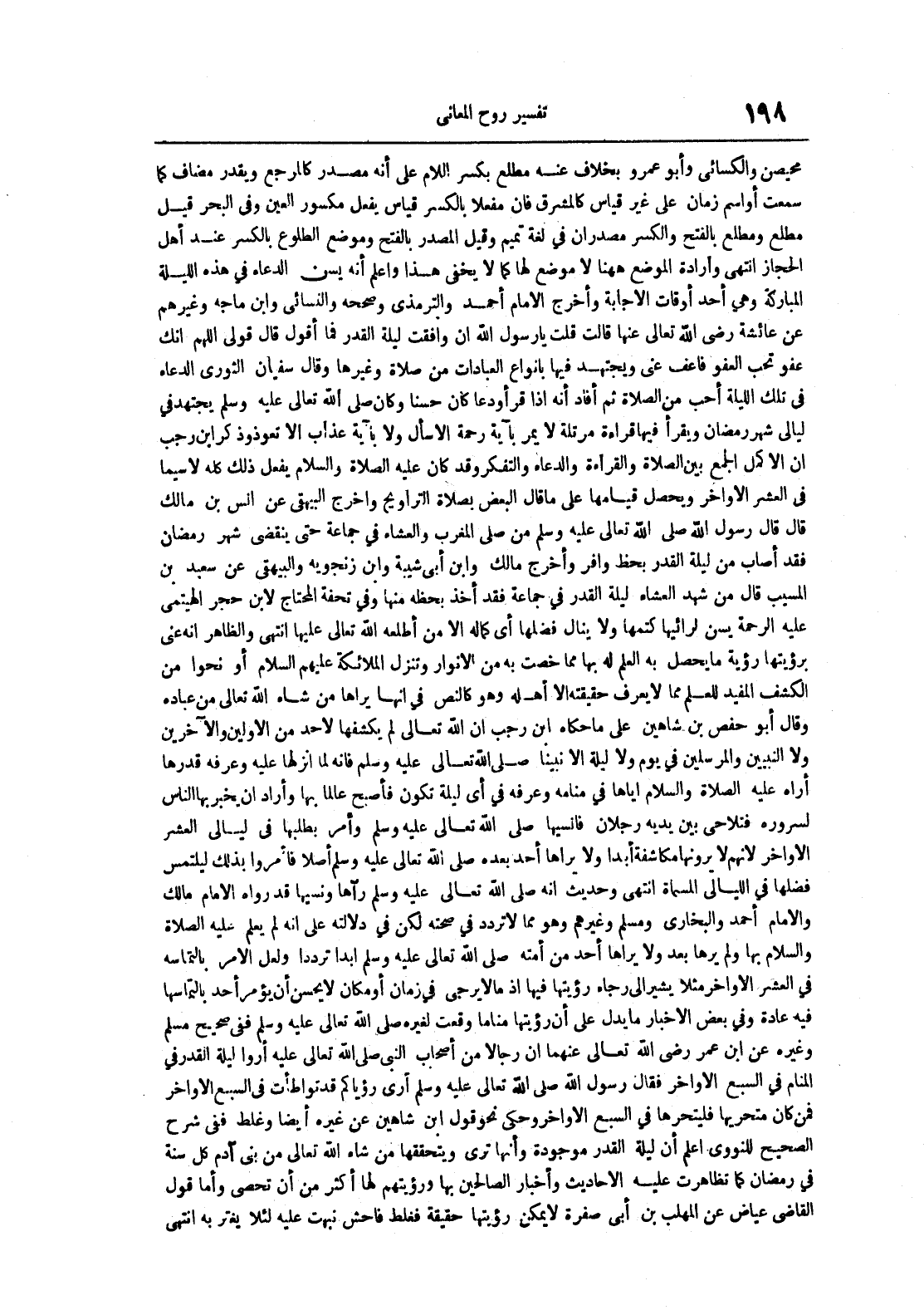 محيصن والكسائي وأبو عمرو بخلاف عنه مطلع بكسر اللام على أنه مصدر كالمرجع ويقدر مضاف كما سمعت أو اسم زمان على غير قياس كالمشرق فإن مفعلا بالكسر قياس يفعل مكسور العين وفي البحر قيل مطلع بالفتح والكسر مصدران في لغة تميم وقيل المصدر بالفتح وموضع الطلوع بالكسر عند أهل الحجاز انتهى وإرادة الموضع ههنا لا موضع لها كما لا يخفى هذا واعلم أنه يسن الدعاء في هذه الليلة المباركة وهي أحد أوقات الإجابة وأخرج الإمام أحمد والترمذي وصححه والنسائي وابن ماجه وغيرهم عن عائشة رضي الله تعالى عنها قالت قلت يا رسول الله إن وافقت ليلة القدر فما أقول قال قولي اللهم إنك عفو تحب العفو فاعف عني ويجتهد فيها بأنواع العبادات من صلاة وغيرها وقال سفيان الثوري في تلك الليلة أحب من الصلاة ثم أفاد أنه إذا قرأ ودعا كان حسنا وكان صلى الله تعالى عليه وسلم يجتهد في ليالي شهر رمضان ويقرأ قراءة مرتلة لا يمر بآية رحمة إلا سأل ولا بآية عذاب إلا تعوذ وذكر ابن رجب أن الأكمل الجمع بين الصلاة والقراءة والدعاء والتفكر وقد كان عليه الصلاة و السلام يفعل ذلك كله لا سيما في العشر الأواخر ويحصل قيامها على ما قال البعض بصلاة التراويح وأخرج البيهقي عن أنس بن مالك قال قال رسول الله صلى الله تعالى عليه وسلم من صلى المغرب والعشاء في جماعة حتى ينقضي شهر رمضان فقد أصاب ليلة القدر بحظ وافر وأخرج مالك وابن شيبة وابن زنجوية والبيهقي عن سعيد بن المسيب قال من شهد العشاء ليلة القدر في جماعة فقد أخذ بحظه منها وفي تحفة المحتاج لابن حجر الهيتي عليه الرحمة يسن لرائيها كتمها ولا ينال فضلها أي كماله إلا من أطلعه الله تعالى عليها انتهى والظاهر أنه عني برؤيتها رؤية ما يحصل به العلم له بها مما خصت به الأنوار وتنزل الملائكة عليهم السلام أو نحوا من الكشف المفيد للعلم مما لا يعرف حقيقته إلا أهله وهو كالنص في أنها يراها من شاء الله تعالى من عباده وقال أبو حفص بن شاهين على ما حكاه ابن رجب أن الله تعالى لم يكشفها لأحد من الأولين والآخرين ولا النبيين والمرسلين في يوم ولا ليلة إلا نبينا صلى الله تعالى عليه وسلم فإنه لما أنزلها عليه وعرفه قدرها أراه عليه الصلاة و السلام إياها في منامه وعرفه في أي ليلة تكون فأصبح عالما بها وأراد أن يخبر بها الناس لسروره فتلاحى بين يديه رجلان فأنسيها صلى الله تعالى عليه وسلم وأمر بطلبها في ليالي العشر الأواخر لأنهم لا يرونها مكاشفة أبدا ولا يراها أحد بعده صلى الله تعالى عليه وسلم أصلا فأمروا بذلك ليلتمس فضلها في الليالي المسماة انتهى وحديث أنه صلى الله تعالى عليه وسلم رآها ونسيها وقد رواه الإمام مالك والإمام أحمد والبخاري ومسلم وغيرهم وهو مما لا تردد في صحته لكن في دلالته على أنه لم يعلم عليه الصلاة و السلام بها ولم يرها بعد ولا يراها أحد من أمته صلى الله تعالى عليه وسلم أبدا ترددا ولعل الأمر بالتماسه في العشر الأواخر مثلا يشير إلى رجاء رؤيتها فيها إذ ما لا يرجى في زمان أو مكان لا يحسن أن يؤمر أحد بالتماسها فيه عادة وفي بعض الأخبار ما يدل على أن رؤيتها مناما وقعت لغيره صلى الله تعالى عليه وسلم ففي صحيح مسلم وغيره عن ابن عمر رضي الله تعالى عنهما أن رجلان من أصحاب النبي صلى الله تعالى عليه وسلم أروا ليلة القدر في المنام في السبع الأواخر فقال رسول الله صلى الله تعالى عليه وسلم أرى رؤياكم قد تواطأت في السبع الأواخر فمن كان متحريها فليتحرها في السبع الأواخر وحكى نحو قول ابن شاهين عن غيره أيضا وغلط ففي شرح الصحيح للنووي اعلم أن ليلة القدر موجودة وأنها ترى ويتحققها من شاء الله تعالى من بني آدم كل سنة في رمضان كما تظاهرت عليه الأحاديث وأخبار الصالحين بها ورؤيتهم لها أكثر من أن تحصى وأما قول القاضي عياض عن المهلب بن أبي صفرة لا يمكن رؤيتها حقيقة فغلظ فاحش نبهت عليه لئلا يغتر به انتهى