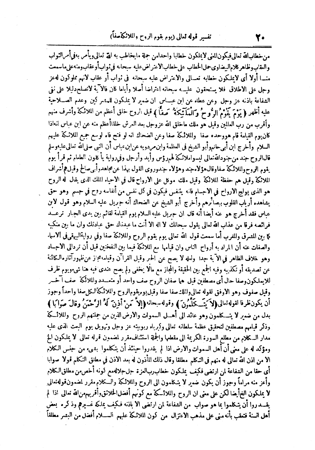 من خطاب الله تعالى فيكون المعنى لا يملكون خطابا واحدا من جملة ما يخاطب به الله تعالى ويأمر به في أمر الثواب والعقاب وظاهر كلام البيضاوي حمل الخطاب على خطاب الأعتراض عليه سبحانه في ثواب أو عقاب ومنه على ما سمعت منا أولا أي لا يملكون خطابه تعالى والأعتراض عليه سبحانه في ثواب أو عقاب لأنهم مملوكون له عز و جل على الإطلاق فلا يستحقون عليه سبحانه اعتراضا أصلا وأيا ما كان فالآية لا تصلح دليلا على نفي الشفاعة بإذنه عز و جل وعن عطاء عن ابن عباس أن ضمير لا يملكون للمشركين وعدم الصلاحية عليه أظهر يوم يقوم الروح والملائكة صفا قيل الروح خلق أعظم من الملائكة وأشرف منهم وأقرب من رب العالمين وقيل هو ملك ما خلق الله عز و جل بعد العرش خلقا أعظم منه عن ابن عباس أنه إذا كان يوم القيامة قام هو وحده صفا والملائكة صفا وعن الضحاك أنه لو فتح فاه لوسع جميع الملائكة عليهم السلام وأخرج ابن أبي حاتم وأبو الشيخ في العظمة وابن مردويه عن ابن عباس أن النبي صلى الله تعالى عليه وسلم قال الروح جند من جنود الله تعالى ليسوا ملائكة لهم رؤس وأيد وأرجل وفي رواية يأكلون الطعام ثم قرأ يوم يقوم الروح والملائكة صفا وقال هؤلاء جند وهؤلاء جند وروي القول بهذا عن مجاهد وأبي صالح وقيل هم أشراف الملائكة وقيل هم حفظة الملائكة وقيل ملك موكل على الأرواح قال في الأحياء الملك الذي يقال له الروح هو الذي يولج الأرواح في الأجسام فإنه يتنفس فيكون في كل نفس من أنفاسه روح في جسم وهو حق يشاهده أرباب القلوب ببصائرهم وأخرج أبو الشيخ عن الضحاك أنه جبريل عليه السلام وهو قول لابن عباس فقد أخرج هو عنه أيضا أنه قال إن جبريل عليه السلام يقوم القيامة لقائم بين يدي الجبار ترعد فرائصه فرقا من عذاب الله تعالى يقول سبحانك لا إله إلا أنت ما عبدناك حق عبادتك وإن ما بين منكبيه كما بين المشرق والمغرب أما سمعت قول الله تعالى يوم يقوم الروح والملائكة صفا وفي رواية البيهقي في الأسماء والصفات عنه أن المراد به أرواح الناس وإن قيامها مع الملائكة فيما بين النفختين قبل أن ترد إلى الأجساد وهو خلاف الظاهر في الآية جدا ولعله لا يصح عن الحبر وقيل القرآن وقيامه مجاز عن ظهور آثاره الكائنة عن تصديقه أو تكذيبه وفيه الجمع بين الحقيقة والمجاز مع ما لا يخفى ولم يصح عندي فيه هنا شيء ويوم للا يملكون وصفا حال أي مصطفين قيل هما صفان الروخ صف واحد أو متعدد والملائكة صف آخر وقيل صفوف وهو الأوفق لقوله تعالى والملك صفا صفا وقيل يوم يقوم الروح والملائكة الكل صفا واحدا وجوز أن يكون ظرفا لقوله تعالى لا يتكلمون وقوله سبحانه إلا من أذن له الرحمن وقال صوابا بدل من ضمير لا يتكلمون وهو عائد إلى أهل السماوات والأرض الذين من جملتهم الروح والملائكة وذكر قيامهم مصطفين لتحقيق عظمة سلطانه تعالى وكبرياء ربوبيته عز و جل وتهويل البعث الذي عليه مدار الكلام من مطلع السورة الكريمة إلى مطلقها والجملة استئناف مقرر لمضمون قوله تعالى لا يملكون الخ ومؤكد له على معنى أن أهل السماوات والأرض إذا لم يقدروا حينئذ أن يتكلموا بشيء من جنس الكلام إلا من أذن الله تعالى له منهم في التكلم مطلقا وقال ذلك المأذون له بعد الأذن في مطلق التكلم قولا صوابا أي حقا من الشفاعة لمن ارتضى فكيف يملكون خطاب رب العزة جل جلاله مع كونه أخص من مطلق الكلام وأعز منه مراما وجوز أن يكون ضمير لا يتكلمون إلى الروح والملائكة والكلام مقرر لمضمون قوله تعالى لا يملكون الخ أيضا لكن على معنى أن الروح والملائكة مع كونهم أفضل الخلائق وأقربهم من الله تعالى إذا لم يقدروا أن يتكلموا بما هو صواب من الشفاعة لمن ارتضى إلا بإذنه فكيف يملكه غيرهم وذكره بعض أهل السنة فتعقب بأنه مبني على مذهب الأعتزال من كون الملائكة عليهم السلام أفضل من البشر مطلقا