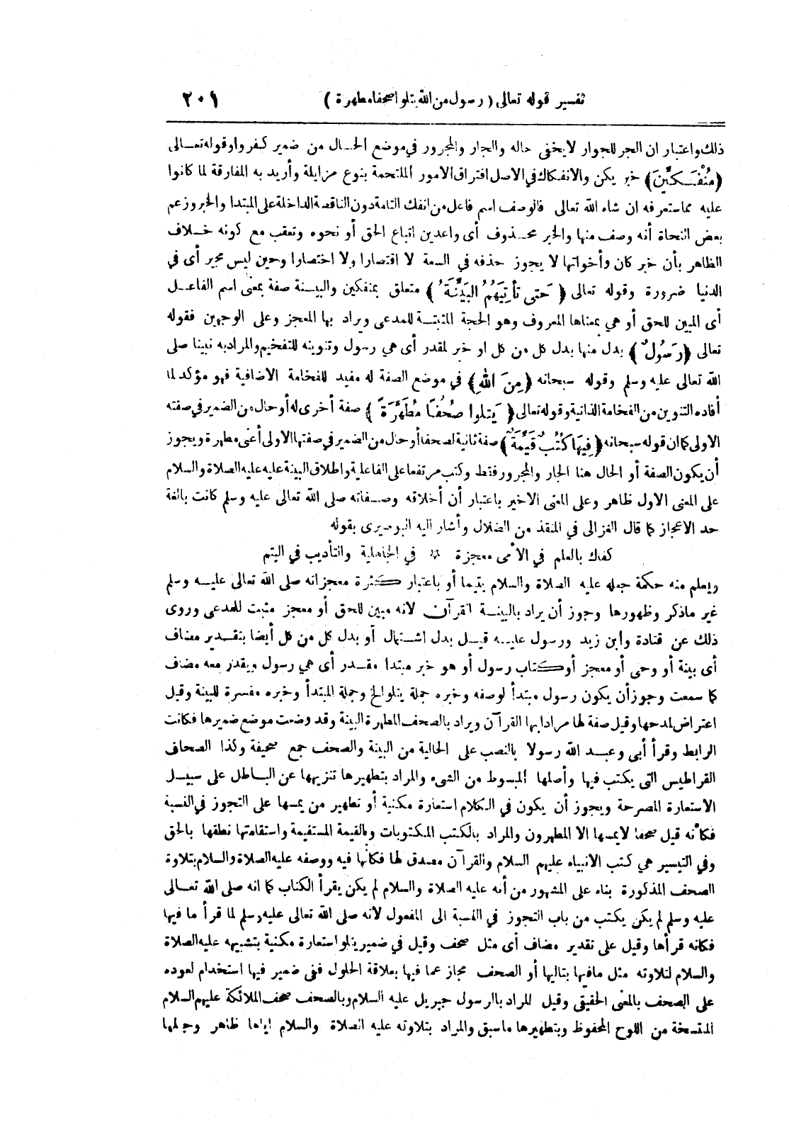 ذلك واعتبار أن الجر للجوار لا يخفى حاله والجار والمجرور في موضع الحال من ضمير كفروا وقوله تعالى منفكيم خبر يكن والأنفكاك في الأصل افتراق الأمور الملتحمة بنوع مزايلة وأريد به المفارقة لما كانوا عليه مما ستعرفه إن شاء الله تعالى فالوصف اسم فاعل من انفك التامة دون الناقصة الداخلة على المبتدأ والخبر وزعم بعض النحاة أنه وصف منها والخبر محذوف أي واعدين اتباع الحق أو نحوه وتعقب مع كونه خلاف الظاهر بأن خبر كان وأخوتها لا يجوز حذفه في السعة لا اقتصارا ولا اختصارا وحين ليس مجير أي في الدنيا ضرورة وقوله تعالى حتى تأتيهم البينة متعلق بمنفكين والبينة صفة اسم الفاعل أي المبين للحق أو هي بمعناها المعروف وهو الحجة المثبتة للمدعي ويراد بها المعجز وعلى الوجهين فقوله تعالى رسول بدل منها بدل كل من كل أو خبر لمقدر أي هي رسول وتنوينه للتفخيم والمراد به نبينا صلى الله تعالى عليه وسلم وقوله سبحانه من الله في موضع الصفة له مفيد للفخامة الإضافية فهو مؤكد لما أفاده التنوين من الفخامة الذاتية وقوله تعالى يتلوا صحفا مطهرة صفة له أو حال من الضمير في صفته الأولى كما أن قوله سبحانه فيها كتب قيمة صفة ثانية لصحفا أو حال من الضمير في صفتها الأولى أعني مطهرة ويجوز أن يكون الصفة أو الحال هنا الجار والمجرور فقط وكتب مرتفعا على الفاعلية وإطلاق البينة عليه عليه الصلاة و السلام على المعنى الأول ظاهر وعلى المعنى الأخير باعتبار أن أخلاقه وصفاته صلى الله تعالى عليه وسلم كانت بالغة حد الإعجاز كما قال الغزالي في المنقذ من الضلال وأشار إليه البوصيري بقوله كفاك بالعلم في الأمي معجزة