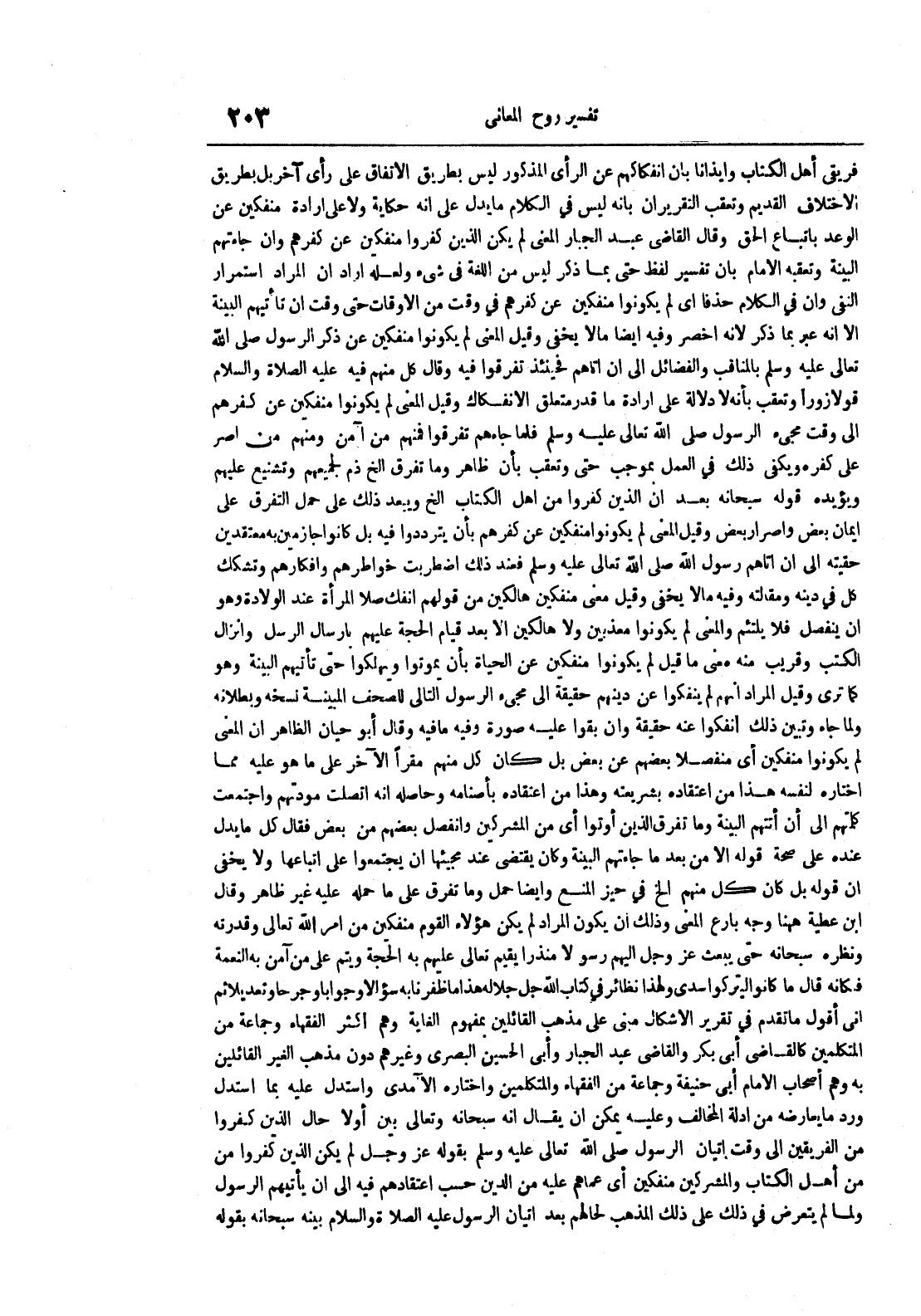 فريقي أهل الكتاب وإيذانا بأن انفكاكهم عن الرأي المذكور ليس بطريق الأتفاق على رأي آخر بل بطريق الأختلاف القديم وتعقب التقريران بأنه ليس في الكلام ما يدل على أنه حكاية إلا على إرادة منفكين عن الوعد باتباع الحق وقال القاضي عبد الجبار المعنى لم يكن الذين كفروا منفكين عن كفرهم وإن جاءتهم البينة وتعقبه الإمام بأن تفسير لفظ حتى بما ذكر ليس من اللغة في شيء ولعله أراد أن المراد استمرار النفي وإن في الكلام حذفا أي لم يكونوا منفكين عن كفرهم في وقت من الأوقات حتى وقت أن تأتيهم البينة إلا أنه عبر بما ذكر لأنه اخصر وفيه أيضا ما لا يخفى وقيل المعنى لم يكونوا منفكين عن ذكر الرسول صلى الله تعالى عليه وسلم بالمناقب والفضائل إلى أن أتاهم فحينئذ تفرقوا فيه وقال كل منهم فيه عليه الصلاة و السلام قولا زورا وتعقب بأنه دلالة على إرادة ما قدر متعلق الأنفكاك وقيل المعنى لم يكونوا منفكين عن كفرهم إلى مجيء الرسول صلى الله تعالى عليه وسلم فلما جاءهم تفرقوا فمنهم من آمن ومنهم من أصر على كفره ويكفي ذلك في العمل بموجب حتى وتعقب بأن ظاهر وما تفرق الخ ذم لجميعهم وتشنيع عليهم ويؤيده قوله سبحانه بعد أن الذين كفروا من أهل الكتاب الخ ويبعد ذلك على حمل التفرق على إيمان بعض وإصرار بعض وقيل المعنى لم يكونوا منفكين عن كفرهم بأن يترددوا فيه بل كانوا جازمين به معتقدين حقيته إلى أن أتاهم رسول الله صلى الله تعالى عليه وسلم فعند ذلك اضطربت خواطرهم وأفكارهم وتشكك كل في دينه ومقالته وفيه ما لا يخفى وقيل معنى منفكين هالكين من قولهم انفك صلا المرأة عند الولادة وهو أن ينفصل فلا يلتئم والمعنى لم يكونوا معذبين ولا هالكين إلا بعد قيام الحجة عليهم بإرسال الرسل وإنزال الكتب وقريب منه معنى ما قيل لم يكونوا منفكين عن الحياة بأن يموتوا ويهلكوا حتى تأتيهم البينة وهو كما ترى وقيل المراد أنهم لم ينفكوا عن دينهم حقيقة إلى مجيء الرسول التالي للصحف المبينة نسخه وبطلانه ولما جاء وتبين ذلك انفكوا عنه حقيقة وإن بقوا عليه صورة وفيه ما فيه وقال أبو حيان الظاهر أن المعنى لم يكونوا منفكين أي منفصلا بعضهم عن بعض بل كان كل منهم مقرا على ما هو مما اختاره لنفسه هذا من اعتقاده بشريعته وهذا من اعتقاده بأصنامه وحاصله أنه اتصلت أنه مودتهم كلمتهم إلى أن أتتهم البينة وما تفرق الذين أوتوا أي من المشركين وانفصل بعضهم من بعض فقال كل ما يدل عنده على صحة قوله إلا من بعد ما جاءتهم البينة وكان يقتضي عند مجيئها أن يجتمعوا على اتباعها ولا يخفى أن قوله بل كان كل منهم الخ في حيز المنع وأيضا حمل وما تفرق على ما حمله عليه غير ظاهر وقال ابن عطية ههنا وجه بارع المعنى وذلك أن يكون المراد لم يكن هؤلاء القوم منفكين من أمر الله تعالى وقدرته ونظره سبحانه حتى يبعث عز و جل إليهم رسولا منذرا يقيم تعالى عليهم به الحجة ويتم على من آمن به النعمة فكأنه قال ما كانوا ليتركوا سدى ولهذا نظائر في كتاب الله جل جلاله هذا ما ظفرنا به سؤالا وجوابا وجرحا وتعديلا ثم أني أقول ما تقدم في تقرير الأشكال مبني على مذهب القائلين بمفهوم الغاية وهم أكثر الفقهاء وجماعة من المتكلمين كالقاضي أبي بكر والقاضي عبد الجبار وأبي الحسين البصري وغيرهم دون مذهب القائلين به وهم أصحاب الإمام أبي حنيفة وجماعة من الفقهاء والمتكلمين واختاره الآمدي واستدل عليه بما استدل ورد ما يعارضه من أدلة المخالف وعليه يمكن أن يقال أنه سبحانه وتعالى بين أولا حال الذين كفروا من الفريقين إلى وقت إتيان الرسول صلى الله تعالى عليه وسلم بقوله عز و جل لم يكن الذين كفروا من أهل الكتوب والمشركين منفكين أي أعماهم عليه من الدين حسب اعتقادهم فيه إلى أن يأتيهم الرسول ولما لم يتعرض في ذلك على ذلك المذهب لحالهم بعد إتيان الرسول عليه الصلاة و السلام بينه سبحانه بقوله