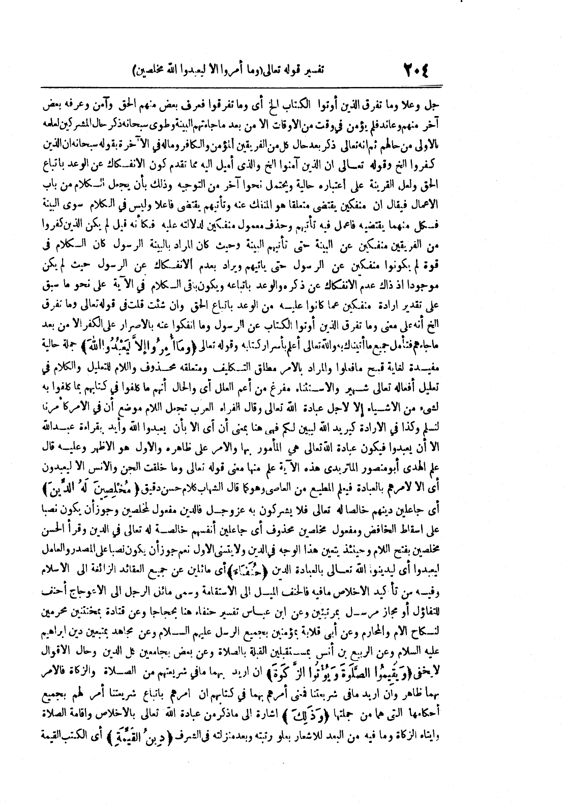 جل وعلا وما تفرق الذين أوتوا الكتاب الخ أي وما تفرقوا فعرف بعض منهم الحق وآمن وعرفه بعض آخر منهم وعاند فلم يؤمن في وقت من الأوقات إلا بعد ما جاءتهم البينة وطوى سبحانه ذكر حال المشركين لعلمه بالأولى من حالهم ثم أنه تعالى ذكر بعد حال من الفريقين المؤمن والكافر وما له في الآخرة بقوله سبحانه إن الذين كفروا الخ وقوله تعالى الذين آمنوا الخ والذين أميل إليه مما تقدم كون الإنفكاك عن الوعد باتباع الحق ولعل القرينة على اعتباره حالية ويحتمل نحوا آخر من التوجيه وذلك بأن الكلام من باب الأعمال فيقال أن منفكين يقتضي متعلقا هو المنفك عنه وتأتيهم يقتضي فاعلا وليس في الكلام سوى البينة فكل منهما يقتضيه فاعمل فيه تأتيهم وحذف معمول منفكين لدلالته عليه فكأنه قيل لم يكن الذين كفروا من الفريقين منفكين عن البينة حتى تأتيهم البينة وحيث كان المراد بالبينة الرسول كان الكلام في قوة لم يكونوا منفكين عن الرسول حتى يأتيهم ويراد بعدم الأنفكاك عن الرسول حيث لم يكن موجودا إذ ذاك عدم الأنفكاك عن ذكره والوعد باتباعه ويكون باقي الكلام في الآية على نحو ما سبق على تقدير إرادة منفكين عما كانوا عليه من الوعد باتباع الحق وإن شئت قلت في قوله تعالى وما تفرق الخ أنه على معنى وما تفرق الذين أوتوا الكتاب عن الرسول وما انفكوا عنه بالأصرار على الكفر إلا من بعد ما جاءهم فتأمل جميع ما أتيناك به والله تعالى أعلم بأسرار كتابه وقوله تعالى وما أمروا إلا ليعبدوا الله جملة حالية مفيدة لغاية قبح ما فعلوا والمراد بالأمر مطلق التكليف ومتعلقه محذوف واللام للتعليل والكلام في تعليل أفعاله تعالى شهير والأستثناء مفرغ من أعم العلل أي والحال أنهم ما كلفوا في كتابهم بما كلفوا به لشيء من الأشياء إلا لأجل عبادة الله تعالى وقال الفراء العرب تجعل اللام موضع أن في الأمر كأمرنا لنسلم وكذا في الإرادة كيريد الله ليبين لكم فهي هنا بمعنى أن أي إلا بأن يعبدوا الله وأيد بقراءة عبد الله إلا أن يعبدوا فيكون عبادة الله تعالى هي المأمور بها والأمر على ظاهره والأول هو الأظهر وعليه قال علم الهدى أبو منصور الماتريدي هذه الآية علم منها معنى قوله تعالى وما خلقت الجن والإنس إلا ليعبدون أي إلا لأمرهم بالعبادة فيعلم المطيع من العاصي وهو كما قال الشهاب كلام حسن دقيق مخلصين له الدين أي جاعلين دينهم خالصا له تعالى فلا يشركون به عز و جل فالدين مفعول لمخلصين وجوز أن يكون نصبا على إسقاط الخافض ومفعول مخلصين محذوف أي جاعلين أنفسهم خالصة له تعالى في الدين وقراءة الحسن مخلصين بفتح اللام وحينئذ يتعين هذا الوجه في الدين ولا يتسنى الأول نعم جوز أن يكون نصبا على المصدر والعامل ليعبدوا أي ليدينوا الله تعالى بالعبادة الدين حنفاء أي مائلين عن جميع العقائد الزائغة إلى الإسلام وفيه من تأكيد الإخلاص ما فيه فالحنف الميل إلى الأستقامة وسمي مائل الرجل إلى الأعوجاج أحنف للتفاؤل أو مجاز مرسل بمرتبتين وعن ابن عباس تفسير حنفاء هنا بحجاجا وعن قتادة بمختتنين محرمين لنكاح الأم والمحارم وعن أبي قلابة بمؤمنين بجميع الرسل عليهم السلام وعن مجاهد بمتبعين دين إبراهيم عليه السلام وعن الربيع بن أنس بمستقبلين القبلة بالصلاة وعن بعض بجامعين كل الدين وحال الأقوال لا يخفى ويقيموا الصلاة ويؤتوا الزكاة إن أريد بهما ما في شريعتهم من الصلاة والزكاة فالأمر بهما ظاهر وإن أريد ما في شريعتنا فمعنى أمرهم في كتابهم أن أمرهم باتباع شريعتنا أمر لهم بجميع أحكامها التي هما من جملتها وذلك إشارة إلى كا ذكر من عبادة الله تعالى بالأخلاص وإقامة الصلاة وإيتاء الزكاة وما فيه من البعد للإشعار بعلو رتبته وبعد منزلته في الشرف دين القيمة أي الكتب القيمة