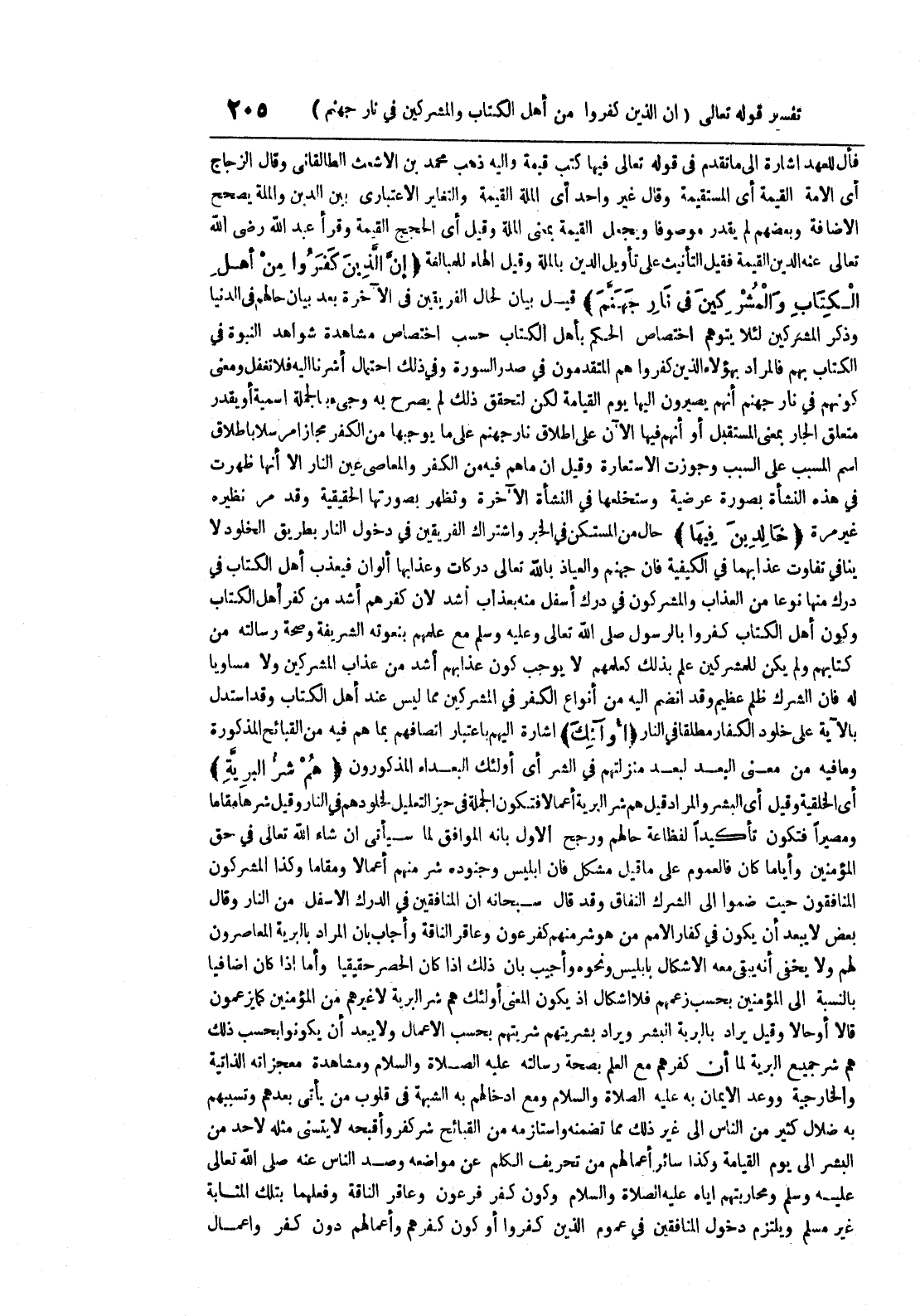 فأل للعهد إشارة إلى ما تقدم في قوله تعالى فيها كتب قيمة وإليه ذهب محمد بن الأشعث الطالقاني وقال الزجاج أي الأمة القيمة أي المستقيمة وقال غير واحد أي الملة القيمة والتغاير الأعتباري بين الدين والملة يصحح الإضافة وبعضهم لم يقدر موصوفا ويجعل القيمة بمعنى الملة وقيل أي الحجج القيمة وقرأ عبد الله رضي الله تعالى عنه الدين القيمة فقيل التأنيث على تأويل الدين بالملة وقيل الهاء للمبالغة إن الذين كفروا من أهل الكتاب والمشركين في نار جهنم قيل بيان لحال الفريقين في الآخرة بعد بيان حالهم في الدنيا وذكر المشركين لئلا يتوهم اختصاص الحكم بأهل الكتاب حسب اختصاص مشاهدة شواهد النبوة في الكتاب بهم فالمراد بهؤلاء الذين كفروا هم المتقدمون في صدر السورة وفي ذلك احتمال أشرنا إليه فلا تغفل ومعنى كونهم في نار جهنم أنهم يصيرون إليها يوم القيامة لكن لتحقق ذلك لم يصرح به وجيء بالجملة إسمية أو يقدر متعلق الجار بمعنى المستقبل أو أنهم فيها الآن على إطلاق نار جهنم على ما يوجبها من الكفر مجازا مرسلا بإطلاق اسم المسبب على السبب وجوزت الأستعارة وقيل أن ما هم فيه من الكفر والمعاصي عين النار إلا أنها ظهرت في هذه النشأة بصورة عرضية وستخلعها في النشأة الآخرة وتظهر بصورتها الحقيقية وقد مر نظيره غير مرة خالدين فيها حال من المستكن في الخبر واشتراك الفريقين في دخول النار بطريق الخلود لا ينافي تفاوت عذابهما في الكيفية فإن جهنم والعياذ بالله تعالى دركات وعذابها ألوان فيعذب أهل الكتاب في درك منها نوعا من العذاب والمشركون في درك أسفل منه بعذاب أشد لأن كفرهم أشد من كفر أهل الكتاب وكون أهل الكتاب كفروا بالرسول صلى الله تعالى عليه وسلم مع علمهم بنعوته الشريفة وصحة رسالته من كتابهم ولم يكن للمشركين علم بذلك كعلمهم لا يوجب كون عذابهم أشد من عذاب المشركين ولا مساويا له فإن الشرك ظلم عظيم وقد انضم إليه من أنواع الكفر في المشركين مما ليس عند أهل الكتاب وقد استدل بالآية على خلود الكفار مطلقا في النار أولئك إشارة إليهم باعتبار اتصافهم بما هم فيه من القبائح المذكورة وما فيه من معنى البعد لبعد منزلتهم في الشر أي أولئك البعداء المذكورون هم شر البرية أي الخلقية وقيل أي البشر والمراد قيل هم شر البرية أعمالا فتكون الجملة في حيز التعليل لخلودهم في النار وقيل شرها مقاما ومصيرا فتكون تأكيدا لفظاعة حالهم ورجح الأول بأنه الموافق لما سيأتي إن شاء الله تعالى في حق المؤمنين وأيا ما كان فالعموم على ما قيل مشكل فإن إبليس وجنوده شر منهم أعمالا ومقاما وكذا والمنافقون حيث ضموا إلى الشرك النفاق وقد قال سبحانه أن المنافقين في الدرك الأسفل من النار وقال بعض لا يبعد أن يكون من كفار الأمم من هو شر منهم كفرعون وعاقر الناقة بأن المراد بالبرية المعاصرون لهم ولا يخفى أنه يبقى معه الأشكال بإبليس ونحوه وأجيب بأن ذلك إذا كان الحصر حقيقيا وأما إذا كان إضافيا بالنسبة إلى المؤمنين بحسب زعمهم فلا إشكال إذ يكون المعنى أولئك هم شر البرية لا غيرهم من المؤمنين كما يزعمون قالا أو حالا وقيل يراد بالبرية البشر ويراد بشريتهم بحسب الأعمال ولا يبعد أن يكونوا بحسب ذلك هم شر جميع البرية لما أن كفرهم مع العلم بصحة رسالته عليه الصلاة و السلام ومشاهدة معجزاته الذاتية والخارجية ووعد الإيمان به عليه الصلاة و السلام ومع إدخالهم به الشبهة في قلوب من يأتي بعدهم وتسببهم به ضلال كثير من الناس إلى غير ذلك مما تضمنه واستلزمه من القبائح شر كفر وأقبحه لا يتسنى مثله لأحد من البشر إلى يوم القيامة وكذا سائر أعمالهم من تحريف الكلم عن مواضعه وصد الناس عنه صلى الله تعالى عليه وسلم ومحاربتهم إياه عليه الصلاة و السلام وكون كفر فرعون وعاقر الناقة وفعلهما بتلك المثابة غير مسلم ويلتزم دخول المنافقين في عموم الذين كفروا أو كون كفرهم وأعمالهم دون كفر وأعمال