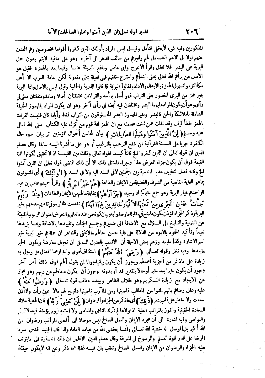 المذكورين وفيه شيء لا يخفى فتأمل وقيل ليس المراد بأولئك الذين كفروا أقواما مخصوصين وهم المحدث عنهم أولا بل الأعم الشامل لهم ولغيرهم من سالف الدهر إلى آخره وهو على ما فيه لا يتم بدون حمل البرية على البشر فلا تغفل وقرأ الأعرج وابن عامر ونافع البريئة هنا وفيما بعد بالهمزة فقيل هو الأصل من برأهم الله تعالى بمعنى ابتدأهم واخترع خلقهم فهي فعيلة بمعنى مفعولة لكن عامة العرب إلا أهل مكة التزموا تسهيل الهمزة بالإبداء والإدغام فقالوا البرية كما قالوا الذرية والخابية وقيل ليس بالأصل وإنما البرية بغير همز من البري المقصور يعني التراب فهو أصل برأسه والقراءتان مختلفتان أصلا ومادة ومتفقتان معنى في رأي وهو أن يكون المراد عليهما البشر ومختلفتان فيه أيضا في رأي آخر وهو أن يكون المراد بالمهموز الخليقة الشاملة للملائكة والجن كالبشر وبغير المهموز البشر المخلوقان من التراب فقط وأيا ما كان فليست القراءة خطأ كيف وقد نقلت عمن ثبتت عصمته مع أن الهمز لغة قوم من أنزل عليه الكتاب صلى الله تعالى عليه وسلم إن الذين آمنوا وعملوا الصالحات بيان لمحاسن أحوال المؤمنين أثر بيان سوء حال الكفرة جريا على السنة القرآنية من شفع الترهيب بالترغيب أو هو على ما أشرنا إليه سابقا وقال عصام الدين إن قوله تعالى إن الذين كفروا الخ كالتأكيد لقوله تعالى وذلك دين القيمة إذ لا تحقيق لكونها الملة القيمة فوق أن يكون جزاء المعرض هذا وجزاء الممتثل ذلك إلا أن ذلك اقتضى قوله تعالى إن الذين آمنوا الخ وكأنه فصل لتخييل عدم المناسبة بين الجملتين لا في المسند إليه ولا في المسند أولئك أي المنعوتون بما هو الغاية القاضية من الشرف والفضيلة من الإيمان والطاعة هم خير البرية وقرأ حميد وعامر بن عبد الواحد هم خيار البرية وهو جمع خير كجياد وجيد جزاؤهم بمقابلة ما لهم من الإيمان والطاعات عند ربهم جنات عدن تجري من تحتها الأنهار خالدين فيها أبدا تقدمت نظائره وفي تقديم مدحهم بخير البرية وذكر الجزاء المؤذن يكون ما منح في مقابلة ما وصفوا به وبيان كونه من عنده تعالى والتعرض لعنوان الربوبية المنبئة عن التربية والتبليغ إلى الكمال مع الإضافة إلى ضميرهم وجمع الجنات وتقييدها بالإضافة وبما يزيدها نعيما وتأكيد الخلود بالأبود من الدلالة على غاية حسن حالهم ما لا يخفى والظاهر أن جملة هم خير البرية اسم الإشارة وكذا ما بعد وزعم بعض الأجلة أن الأنسب بالعديل السابق أن تجعل معترضة ويكون الخبر ما بعدها وفيه نظر وقوله تعالى رضي الله عنهم استئناف نحوي وإخبار عما تفضل عز و جل به زيادة على ما ذكر من أجزية أعمالهم ويجوز أن يكون بيانيا جوابا لمن يقول ألهم فوق ذلك أمر آخر وجوز أن يكون خبرا بعد خبر أو حالا بتقدير قد أو بدونه وجوز أن يكون دعاء لهم من ربهم وهو مجاز عن الإيجاد مع زيادة التكريم وهو خلاف الظاهر ويبعده عطف قوله تعالى ورضوا عنه عليه وعلل رضاهم بأنهم بلغوا من المطالب قاصيتها ومن المآرب ناصيتها وأتيح لهم ما لا عين رأت ولا أذن سمعت ولا خطر على قلب بشر ذلك أي ما ذكره من الجزاء والرضوان لمن خشي ربه فإن الخشية ملاك السعادة الحقيقية والفوز بالمراتب العلية إذ لو لاها لم تترك المناهي والمعاصي ولا استعد ليوم يؤخذ فيه بالأقدام والنواصي وفيه إشارة إلى أن مجرد الإيمان والعمل الصالح ليس موصلا إلى أقصى المراتب ورضوان من الله أكبر بل الموصل له خشية الله تعالى وإنما يخشى الله من عباده العلماء ولذا قال الجنيد قدس سره الرضا على قدر قوة العلم والرسوخ في المعرفة وقال عصام الدين الأظهر أن ذلك إشارة إلى ما يترتب عليه الجزاء والرضوان من الإيمان والعمل الصالح وتعقب بأن فيه غفلة عما ذكر وعن أنه لا يكون حينئذ
