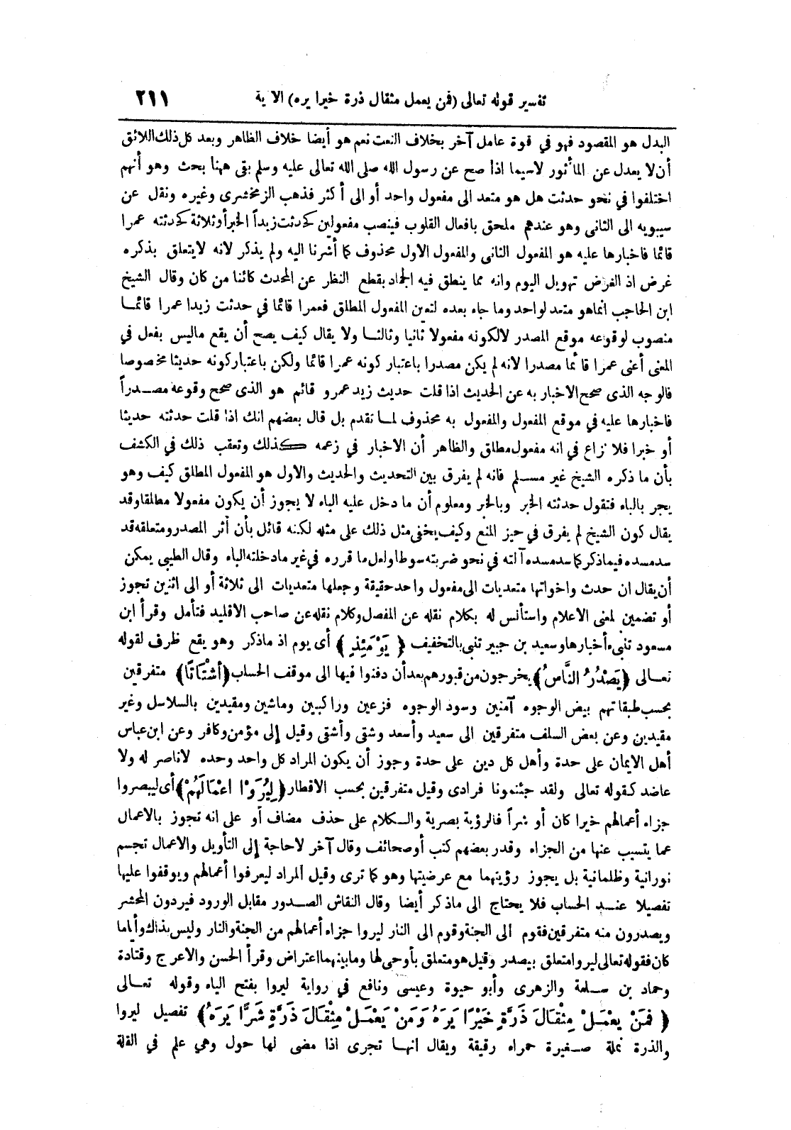 البدل هو المقصود فهو في قوة عامل آخر بخلاف النعت نعم هو أيضا خلاف الظاهر وبعد كل ذلك اللائق أن يعدل عن المأثور لا سيما إذا صح عن رسول الله ص - بقي ههنا بحث وهو أنهم اختلفوا في نحو حدثت هل هو متعد إلى مفعول واحد أو إلى أكثر فذهب الزمخشري وغيره ونقل عن سيبويه إلى الثاني وهو عندهم ملحق بأفعال القلوب فينصب مفعولين كحدثت زيدا الخبر أو ثلاثة كحدثته عمرا قائما فأخبارها عليه هو المفعول الثاني والمفعول الأول محذوف كما أشرنا إليه ولم يذكر لأنه لا يتعلق بذكره غرض إذ الغرض تهويل اليوم مما ينطق فيه الجماد بقطع النظر عن الحديث كائنا من كان وقال الشيخ ابن الحاجب إنما هو متعد لواحد وما جاء بعده لتعين المفعول المطلق فعمرا قائما في حديث زيدا عمرا قائما منصوب لوقوعه موقع المصدر لا لكونه مفعولا ثانيا وثالثا ولا يقال كيف يصح أن يقع ما ليس بفعل في المعنى أعني عمرا قائما مصدرا لأنه لم يكن مصدرا باعتبار كونه قائما ولكن باعتبار كونه حديثا مخصوصا فالوجه الذي صحح الأخبار به عن الحديث إذا قلت حديث زيد عمرو قائم هو الذي صحح وقوعه مصدرا فأخبارها عليه في موقع المفعول والمفعول به محذوف لما تقدم بل قال بعضهم إنك إذا قلت حدثته حديثا أو خبرا فلا نزاع في أنه مفعول مطلق والظاهر أن الأخبار في زعمه كذلك وتعقب ذلك في الكشف بأن ما ذكره الشيخ غير مسلم فإنه لم يفرق بين التحديث والحديث والأول هو المفعول المطلق كيف وهو يجر بالباء فتقول حدثته الخبر وبالخبر ومعلوم أن ما دخل عليه الباء لا يجوز أن يكون مفعولا مطلقا وقد يقال كون الشيخ لم يفرق في حيز المنع وكيف يخفى مثل ذلك على مثله لكنه قائل بأن أثر المصدر ومتعلقه قد سد مسده فيما ذكر كما سد مسده آلته في نحو ضربته سوطا ولعل ما قرره في غير ما دخلته الباء وقال الطيبي يمكن أن يقال أن حدث وأخواتها متعديات إلى مفعول واحد حقيقة وجعلها متعديات إلى ثلاثة أو إلى اثنين تجوز أو تضمين لمعنى الإعلام واستأنس له بكلام نقله عن المفصل وكلام نقله عن صاحب الأقليد فتأمل وقرأ ابن مسعود تنبيء أخبارها وسعيد بن جبير تنبيء بالتخفيف يومئذ أي يوم إذ ما ذكر وهو يقع ظرف لقوله تعالى يصدر الناس يخرجون من قبورهم بعد أن دفنوا فيها إلى موقف الحساب أشتاتا متفرقين بحسب طبقاتهم بيض الوجوه آمنين وسود الوجوه فوعين وراكبين وما شين ومقيدين بالسلاسل وغير مقيدين وعن بعض السلف متفرقين إلى سعيد وأسعد وشقي وأشقى وقيل إلى مؤمن وكافر وعن ابن عباس أهل الإيمان على حدة وأهل كل على حدة وجوز أن يكون المراد كل وحد وحده لا ناصر له ولا عاضد كقوله تعالى ولقد جئتمونا فرادى وقيل متفرقين بحسب الأقطار ليروا أعمالهم أي ليبصروا جزاء أعمالهم خيرا أو شرا فالرؤية بصرية والكلام على حذف مضاف أو على أنه تجوز بالأعمال عما يتسبب عنها من الجزاء وقدر بعضهم كتب أو صحائف وقال آخر لا حاجة إلى التأويل والأعمال تجسم نورانية وظلمانية بل يجوز رؤيتها مع عرضيتها وهو كما ترى وقيل المراد ليعرفوا أعمالهم ويوقفوا عليها تفصيلا عند الحساب فلا يحتاج إلى ما ذكر أيضا وقال النقاش الصدور مقابل الورود فيردون المحشر ويصدون منه متفرقين فقوم إلى الجنة وقوم إلى النار ليروا جزاء أعمالهم من الجنة والنار وليس بذاك وأيا ما كان فقوله تعالى ليروا متعلق بيصدوا وقيل هو متعلق بأوحي لها وما بينهما اعتراض وقرأ الحسن والأعرج وقتادة وحماد بن سلمة والزهري وأبو حيوة وعيسى ونافع في رواية ليروا بفتح الياء وقوله تعالى فمن يعمل مثقال ذرة خيرا يره ومن يعمل مثقال ذرة شرا يره تفصيل ليروا والذرة نملة صغيرة حمراء رقيقة ويقال أنها تجري إذا مضى لها حول وهي علم في القلة