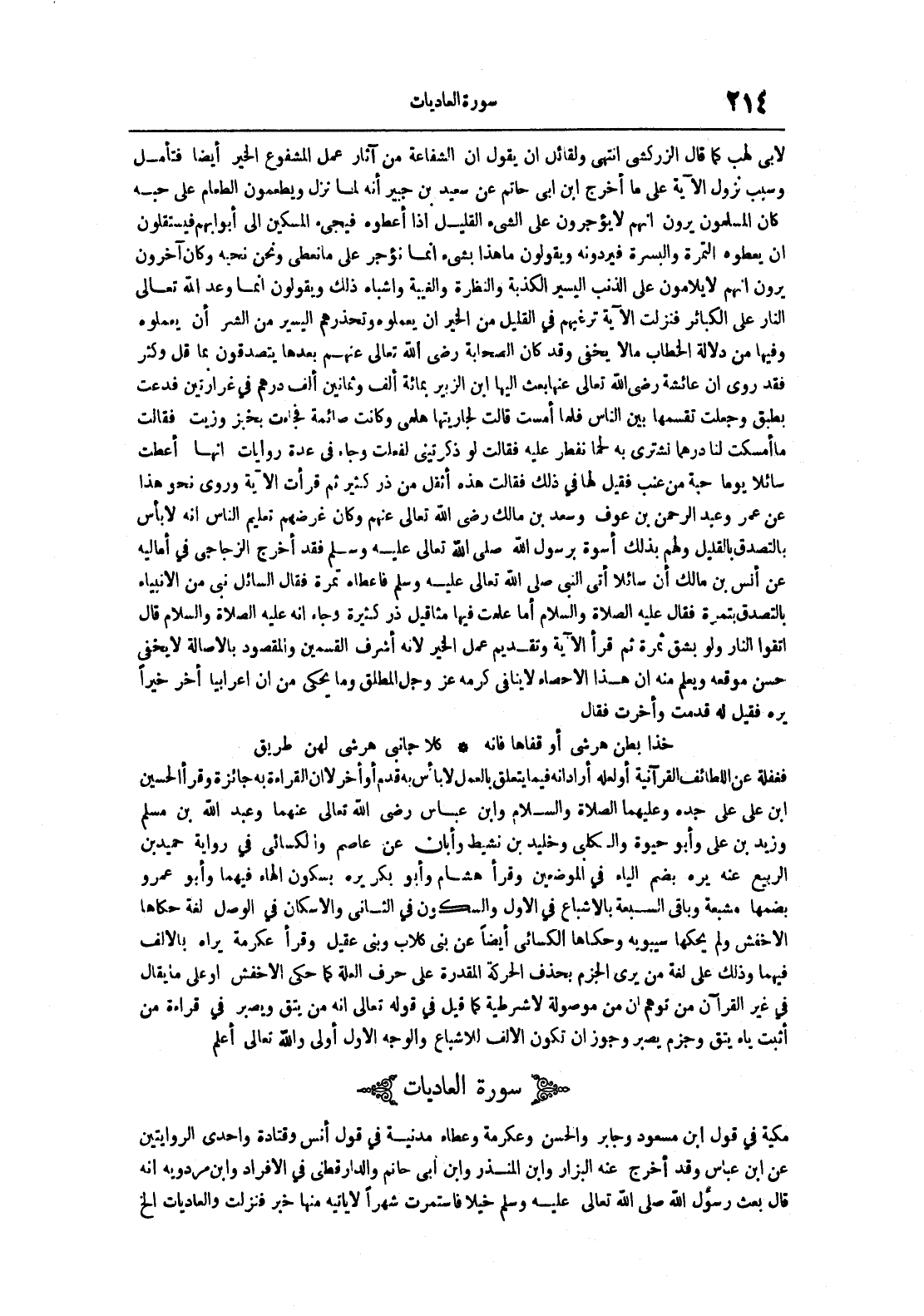مكية في قول ابن مسعود وجابر والحسن وعكرمة وعطاء مدنية في قول أنس وقتادة وإحدى الروايتين عن ابن عباس وقد أخرج عنه البزاز وابن المنذر وابن حاتم والدارقطني في الإفراد وابن مردويه أنه قال بعث ص - خيلا فاستمرت شهرا لا يأتيه منها خبر فنزلت والعاديات الخ