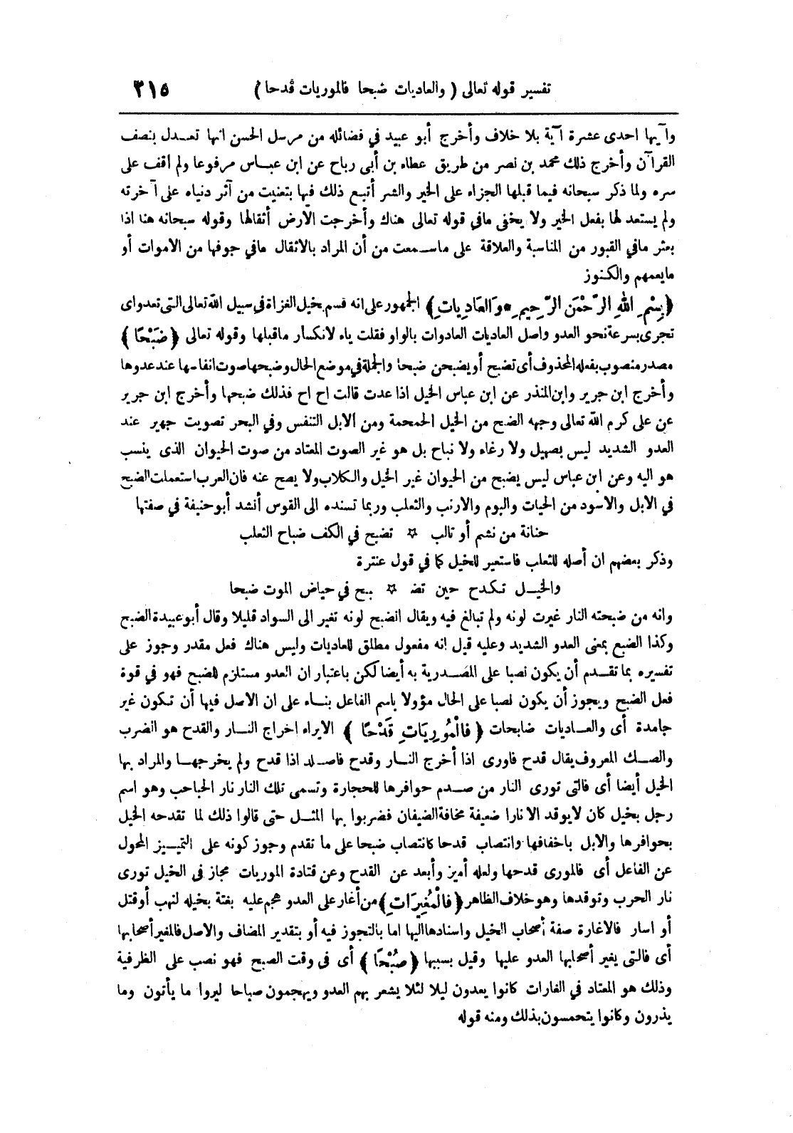 في حياض الموت ضبحا وإنه من ضبحته النار غيرت لونه ولم تبالغ فيه ويقال انضبح لونه تغير إلى السواد قليلا وقال أبو عبيدة الضبح وكذا الضبع بمعنى العدو الشديد وعليه قيل أنه مفعول مطلق للعاديات وليس هناك فعل مقدر وجوز على تفسيره بما تقدم أن يكون نصبا على المصدرية به أيضا لكن باعتبار أن العدو مستلزم للضبح فهو في قوة فعل الضبح ويجوز أن يكون نصبا على الحال مؤولا باسم الفاعل بناء على أن الأصل فيها أن تكون غير جامدة أي والعاديات ضابحات فالموريات قدحا الإيراء إخراج النار والقدح هو الضرب والصك المعروف يقال قدح فاوري إذا أخرج النار وقدح فأصلد إذا قدح ولم يخرجها والمراد بها الخيل أيضا أي فالتي نوري النار من صدم حوافرها للحجارة وتسمى تلك النار نار الحباحب وهو اسم رجل بخيل كان لا يوقد إلا نارا ضعيفة مخافة الضيفان فضربوا بها المثل حتى قالوا ذلك لما تقدحه الخيل بحوافرها والأبل بأخفافها وانتصاب قدحا كانتصاب ضبحا على ما تقدم كونه على التمييز المحول عن الفاعل أي فالمروي قدحها ولعلها أمير وأبعد عن القدح وعن قتادة الموريات مجاز في الخيل توري نار الحرب وتوقدها وهو خلاف الظاهر فالمغيرات من أغار على العدو هجم عليه بغتة بخيله لنهب أو قتل أو أسار فالإغارة صفة أصحاب الخيل وإسنادها إليها إما بالتجوز فيه أو بتقدير المضاف والأصل فالمغير أصحابها أي فالتي يغير أصحابها العدو عليها وقيل بسببها صبحا أي في وقت الصبح فهو نصب على الظرفية وذلك هو المعتاد في الغارات كانوا يعدون ليلا لئلا يشعر بهم العدو ويهجمون صباحا ليروا ما يأتون وما يذرون وكانوا يتحمسون بذلك ومنه قوله