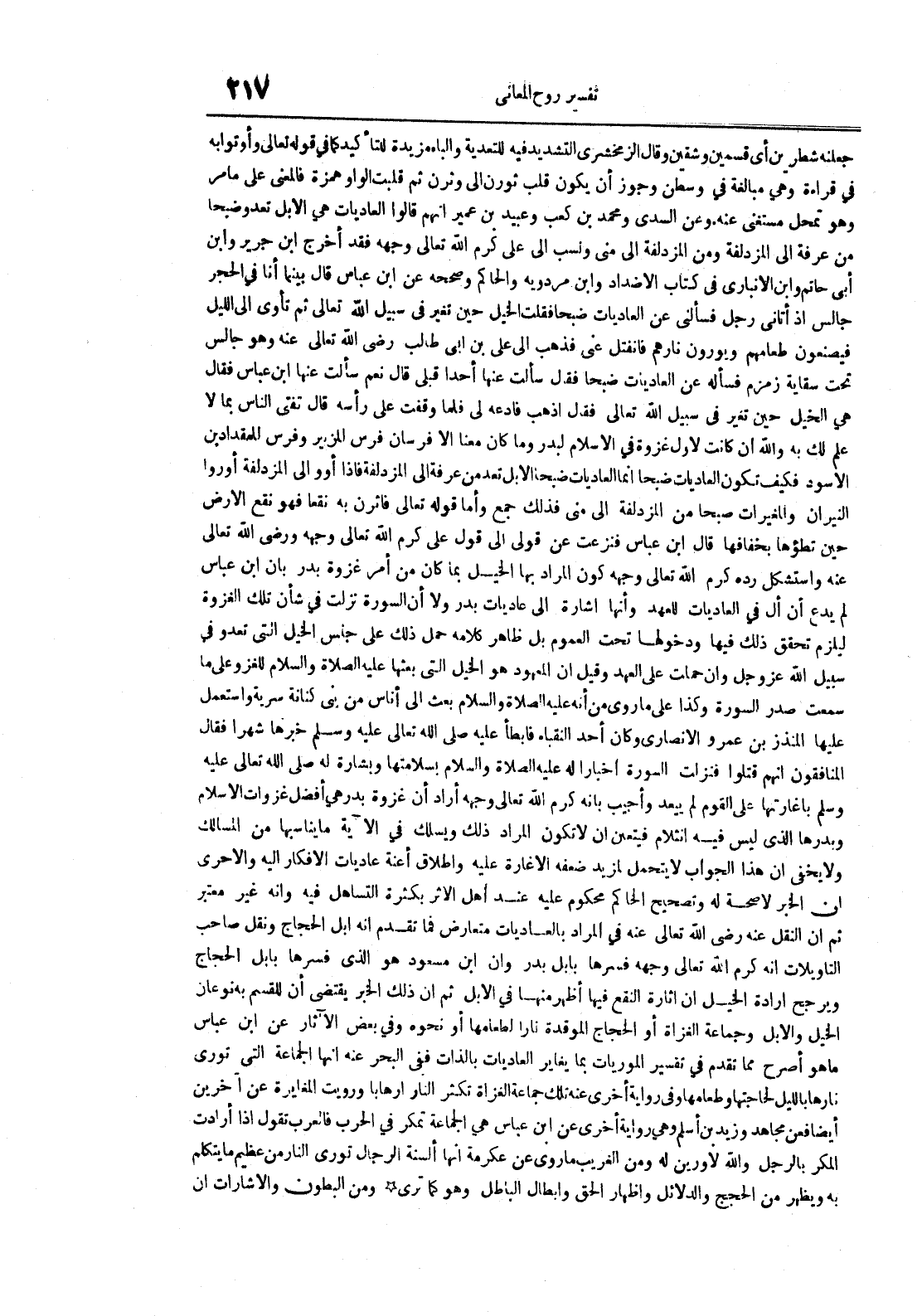 جعلنه شطرين أي قسمين وشقين وقال الزمخشري التشديد فيه للتعدية والباء مزيدة للتأكيد كما في قوله تعالى وأوتوا به في قراءة وهي مبالغة في وسطن وجوز أن يكون قلب ثورن إلى وثرن ثم قلبت الواو همزة فالمعنى على ما مر وهو تمحل مستغنى عنه وعن السدي ومحمد بن كعب وعبيد بن عمير أنهم قالوا العاديات هي الإبل تعدو ضبحا من عرفة إلى المزدلفة ومن المزدلفة إلى منى ونسب إلى علي كرم الله تعالى وجهه فقد أخرج ابن جرير وابن أبي حاتم وابن الأنباري في كتاب الأضداد وابن مردويه والحاكم وصححه عن ابن عباس قال بينما أنا في الحجر جالس إذ أتاني رجل فسألني عن العاديات ضبحا فقلت الخيل حين تغير في سبيل الله تعالى ثم تأوى إلى الليل فيصنعون طعامهم ويورون نارهم فانفتل عني فذهب إلي علي بن أبي طالب رض عنه وهو جالس تحت سقاية زمزم فسأله عن العاديات ضبحا فقال سألت عنها أحدا قبلي قال نعم سألت عنها ابن عباس فقال هي الخيل تغير في سبيل الله تعالى فقال اذهب فادعه لي فلما وقفت على رأسه قال تفتي الناس بما لا علم لك به والله إن كانت لأول غزوة في الإسلام لبدر ومان معنا إلا فرسان فرس للزبير وفرس للمقدادين الأسود فكيف تكون العاديات ضبحا إنما العاديات ضبحا الإبل تعد من عرفة إلى المزدلفة فإذا أوو إلى المزدلفة أوروا النيران والمغيرات صبحا من المزدلفة إلى منى فذلك جمع وأما قوله تعالى فأثرن به نقعا فهو نقع الأرض حين تطؤها بخفافها قال ابن عباس فنزعت عن قولي إلى قول علي كرم الله تعالى وجهه ورضي الله تعالى عنه واستشكل رده كرم الله تعالى وجهه كون المراد بها الخيل بما كان من أمر غزوة بدر بأن ابن عباس لم يدع أن أل في العاديات للعهد وأنها إشارة إلى عاديات بدر ولا أن السورة نزلت في شأن تلك الغزوة ليلزم في تحقق ذلك فيها ودخولها تحت العموم بل ظاهر كلامه حمل ذلك على جنس الخيل التي تعدو في سبيل الله عز و جل وإن حملت على العهد وقيل أن المعهود هو الخيل التي بعثها عليه الصلاة و السلام للغزو على ما سمعت صدر السورة وكذا على ما روي من أنه عليه الصلاة و السلام بعث إلى أناس من بني كنانة سرية واستعمل عليها المنذر بن عمرو الأصاري وكان أحد النقباء فأبطأ عليه ص - خبرها شهرا فقال المنافقون أنهم قتلوا فنزلت السورة إخبارا له عليه الصلاة و السلام بسلامتها وبشارة له ص - بإغارتها على القوم لم يبعد وأجيب بأنه كرم الله تعالى وجهه أراد أن غزوة بدر هي أفضل غزوات الإسلام وبدرها الذي ليس فيه إنثلام فيتعين أن لا تكون المراد ذلك ويسلك في الآية ما يناسبها من المسالك ولا يخفى أن هذا الجواب لا يتحمل لمزيد ضعفه الإغارة عليه وإطلاق أعنة عاديات الأفكار إليه والأحرى أن الخبر لا صحة له وتصحيح الحاكم محكوم عليه عند أهل الأثر بكثرة التساهل فيه وأنه غير معتبر ثم أن النقل عنه رض عنه في المراد بالعاديات متعارض فما تقدم أنه إبل الحجاج ونقل صاحب التأويلات أنه كرم الله تعالى وجهه فسرها بابل بدر وإن ابن مسعود هو الذي فسرها بإبل الحجاج ويرجح إرادة الخيل أن إثارة النقع فيها أظهر منها في الإبل ثم أن ذلك الخبر يقتضي أن للقسم به نوعان الخيل والإبل وجماعة الغزاة أو الحجاج الموقدة نارا لطعامها أو نحوه وفي بعض الآثار عن ابن عباس ما هو أصرح مما تقدم في تفسير الموريات بما يغاير العاديات بالذات ففي البحر عنه أنها الجماعة التي توري نارها بالليل لحاجتها وطعامها وفي رواية أخرى عنه تلك جماعة الغزاة تكثر النار أرهابا ورويت المغايرة عن آخرين أيضا فعن مجاهد وزيد بن أسلم وهي رواية أخرى عن ابن عباس هي الجماعة تمكر في الحرب فالعرب تقول إذا أرادت المكر بالرجل والله لأورين له ومن الغريب ما روي عن عكرمة أنها ألسنة الرجال توري النار من عظيم ما يتكلم به ويظهر من الحجج والدلائل وإظهار الحق وإبطال الباطل وهو كما ترى