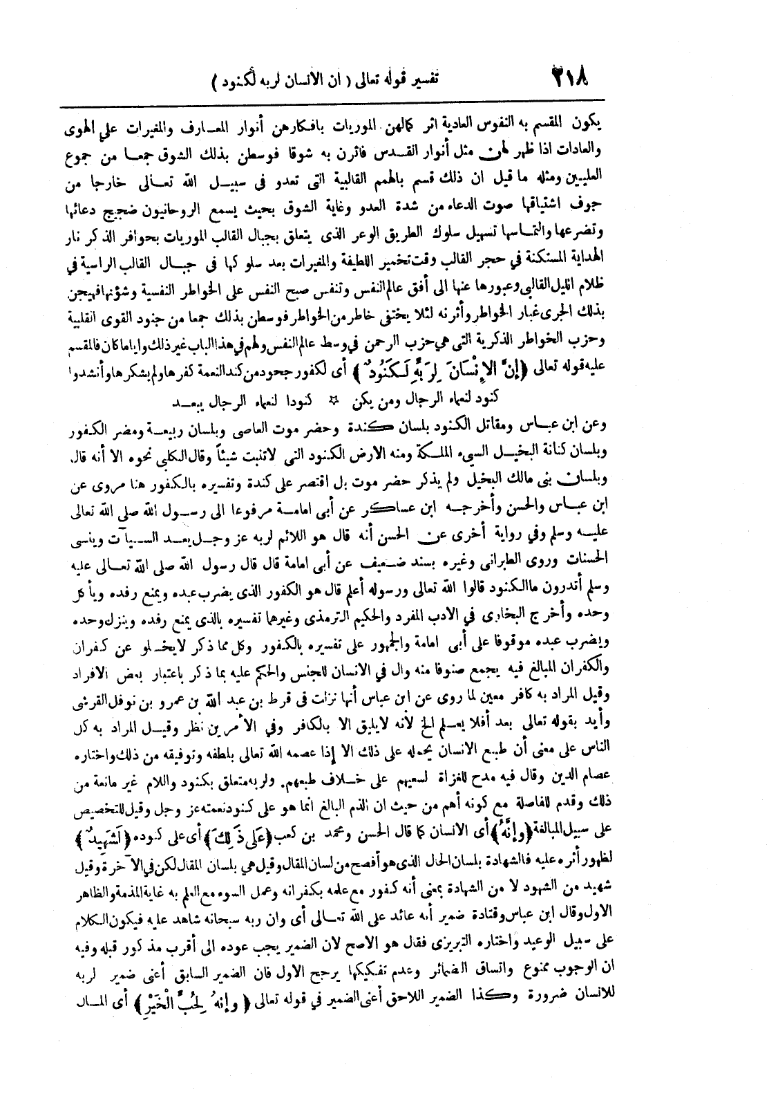 يكون المقسم به النفوس العادية أثر كما لهن الموريات بأفكارهن أنوار المعارف والمغيرات على الهوى والعادات إذا ظهر لهن مثل أنوار القدس فأثرن به شوقا فوسطن بذلك الشوق جمعا من جموع العليين ومثله ما قيل أن ذلك قسم بالهمم القالبية التي تعدو في سبيل الله تعالى خارجا من جوف اشتياقها صوت الدعاء من شدة العدو وغاية الشوق بحيث يسمع الروحانيون ضجيج دعائها وتضرعها والتماسها سلوك الطريق الوعر الذى يتعلق بجبال القالب الموريات بحوافر الذكر نار الهداية المستكنة فى حجر القالب وقت تخمير اللطيفة والمغيرات بعد سلوكها فى جبال القالب الراسية فى ظلام الليل القالبى وعبورها عنها الى أفق عالم النفس وتنفس صبح النفس على الخواطر النفسية وشؤنها فهيجن بذلك الجرى غبار الخواطر وأثرنه لئلا يختفى خاطر من الخواطر فوسطن بذلك جمعا من جنود القوى القلبية وحزب الخواطر الذكرية التى هى حزب الرحمن فى وسط عالم النفس ولهم فى هذا الباب غير ذلك وأياما كان فالمقسم عليه قوله تعالى ان الانسان لربه لكنود أى لكفور جحود من كند النعمة كفرها ولم يشكرها وأنشدوا كنود لنعماء الرجال ومن يكن