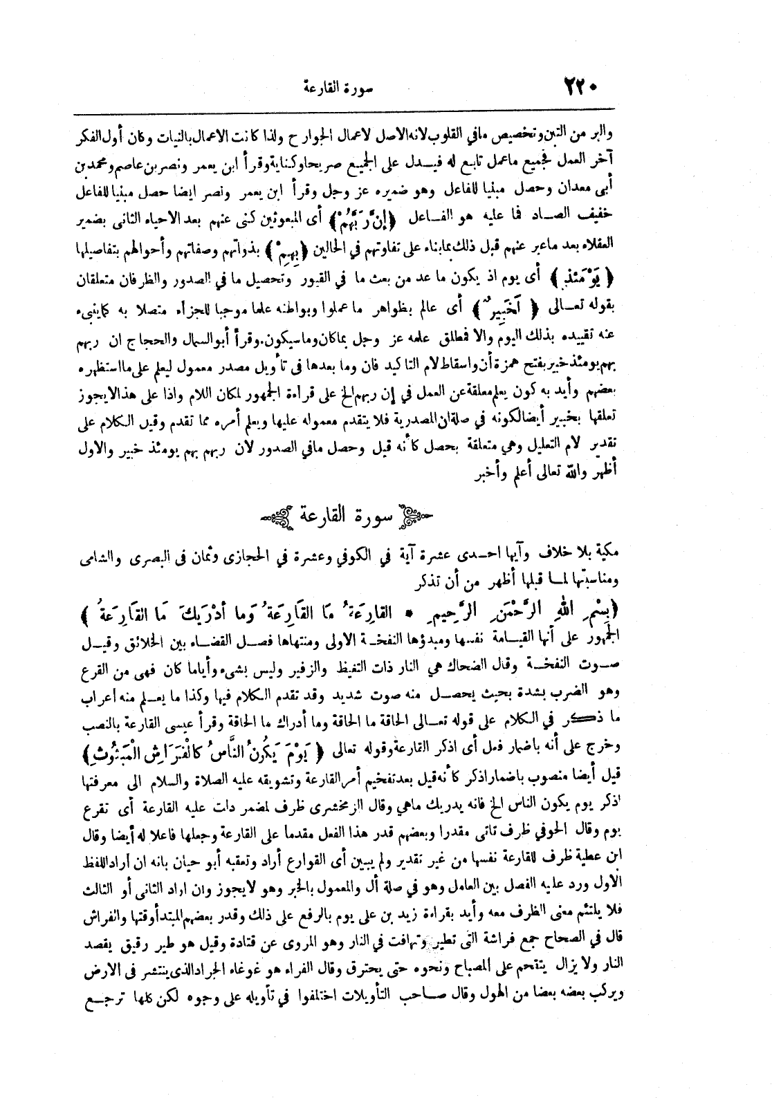 القارعة ماالقارعة وما أدريك ماالقارعة الجمهور على انها القيامة نفسها ومبدوها النفخة الاولى ومنتهاها فصل القضاء بين الخلائق وقيل صوت النفخة وقال الضحاك هي النار ذات التغيظ والزفير وليس بشيء وأياما كان فهي من القرع وهو الضرب بشدة بحيث يحصل منه صوت شديد وقد تقدم الكلام فيها وكذا مايعلم منه اعراب ماذكر في الكلام على قوله تعالى الحاقة ماالحاقة وماأدراك ماالحاقة وقرأ عيسى القارعة بالنصب وخرج على أنه باضمار فعل أى اذكر القارعة وقوله تعالى يوم يكون الناس كالفراش المبثوث قيل أيضا منصوب باضمار اذكر كأنه قيل بعد تفخيم أمر القارعة وتشويقه عليه الصلاة و السلام الى معرفتها اذكر يوم يكون الناس الخ فانه يدريك ما هي وقال الزمخشري ظرف لمضمر دلت عليه القارعة أي تقرع يوم وقال الحوفي ظرف تاتي مقدرا وبعضهم قدر هذا الفعل مقدما على القارعة وجعلها فاعلا له أيضا وقال ابن عطية ظرف للقارعة نفسها من غير تقدير ولم يبين أي القوارع أراد وتعقبه أبو حيان بانه ان اراد اللفظ الاول ورد عليه الفصل بين العامل وهو في صلة أل والمعمول بالخبر وهو لايجوز وان اراد الثاني أو الثالث فلا يلتئم معنى الظرف معه وأيد بقراءة زيد بن على يوم بالرفع على ذلك وقدر بعضهم المبتدأ وقتها والفراش قال في الصحاح جمع فراشة التي تطير وتهافت في النار وهو المروىى عن قتادة وقيل هو طير رقيق يقصد النار ولايزال يتقحم على المصباح ونحوه حتى يحترق وقال الفراء هو غوغاء الجراد الذي ينتشر في الارض ويركب بعضه بعضا من الهول وقال صاحب التأويلات اختلفوا في تأويله على وجوه لكن كلها ترجع