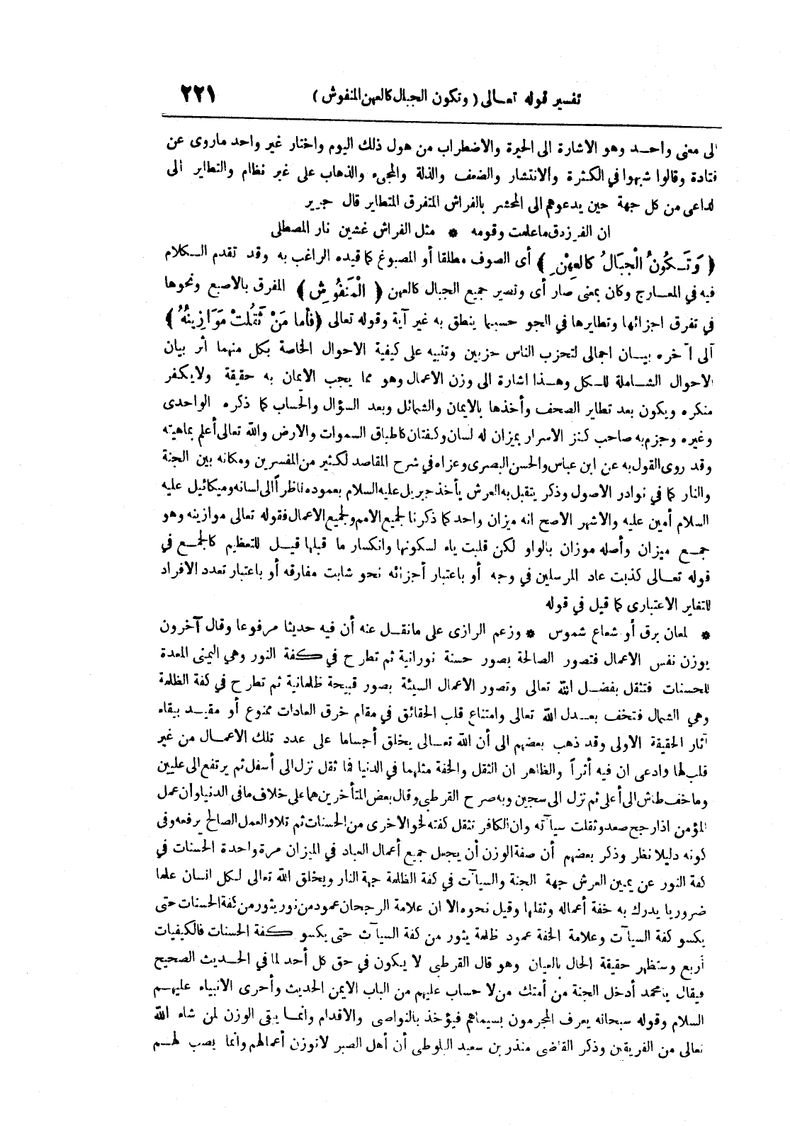 وزعم الرازي على مانقل عنه أن فيه حديثا مرفوعا وقال آخرون يوزن نفس الاعمال فتصور الصالحة بصور حسنة نورانية ثم تطرح في كفة النور وهي اليمنى المعدة للحسنات فتثقل بفضل الله تعالى وتصور الاعمال السيئة بصور قبيحة ظلمانية ثم تطرح في كفة الظلمة وهي الشمال فتخف بعدل الله تعالى وامتناع قلب الحقائق في مقام خرق العادات ممنوع أو مقيد ببقاء آثار الحقيقة الاولى وقد ذهب بعضهم الى أن الله تعالى يخلق أجساما على عدد تلك الاعمال من غير قلب لها وادعى ان فيه أثرا والظاهر ان الثقل والخفة مثلها في الدنيا فما ثقل نزل الى أسفل ثم يرتفع الى عليين وما خف طاش الى أعلى ثم نزل الى سجين وبه صرح القرطبي وقال بعض المتأخرين هما على خلاف مافي الدنيا وأن عمل المؤمن اذا رجح صعد وثقلت سيآته وان الكافر تثقل كفته لخو الاخرى من الحسنات ثم تلا والعمل الصالح يرفعه وفي كونه دليلا نظر وذكر بعضهم أن صفة الوزن أن يجعل جميع أعمال العباد في الميزان مرة واحدة الحسنات في كفة النور عن يمين العرش جهة الجنة والسيآت في كفة الظلمة جهة النار ويخلق الله تعلى لكل انسان علما ضروريا يدرك به خفة أعماله وثقلها وقيل نحوه الا ان علامة الرجحان عمود من نور يثور من كفة الحسنات حتى يكسو كفة السيآت وعلامة الخفة عمود ظامة يثور من كفة السيآت حتى يكسو كفة الحسنات فالكيفيات أربع وستظهر حقيقة الحال بالعيان وهو قال القرطبي لايكون في حق كل أحد لما في الحديث الصحيح فيقال يامحمد أدخل الجنة من أمتك من لاحساب عليهم من الباب الايمن الحديث وأخرى الانبياء عليهم السلام وقوله سبحانه يعرف المجرمون بسيماهم فيؤخذ بالنواصي والاقدام وانما يبقى الوزن لمن شاء الله تعالى من الفريقين وذكر القاضي منذر بن سعيد البلوطي أن أهل الصبر لاتوزن أعمالهم وانما يصب لهم