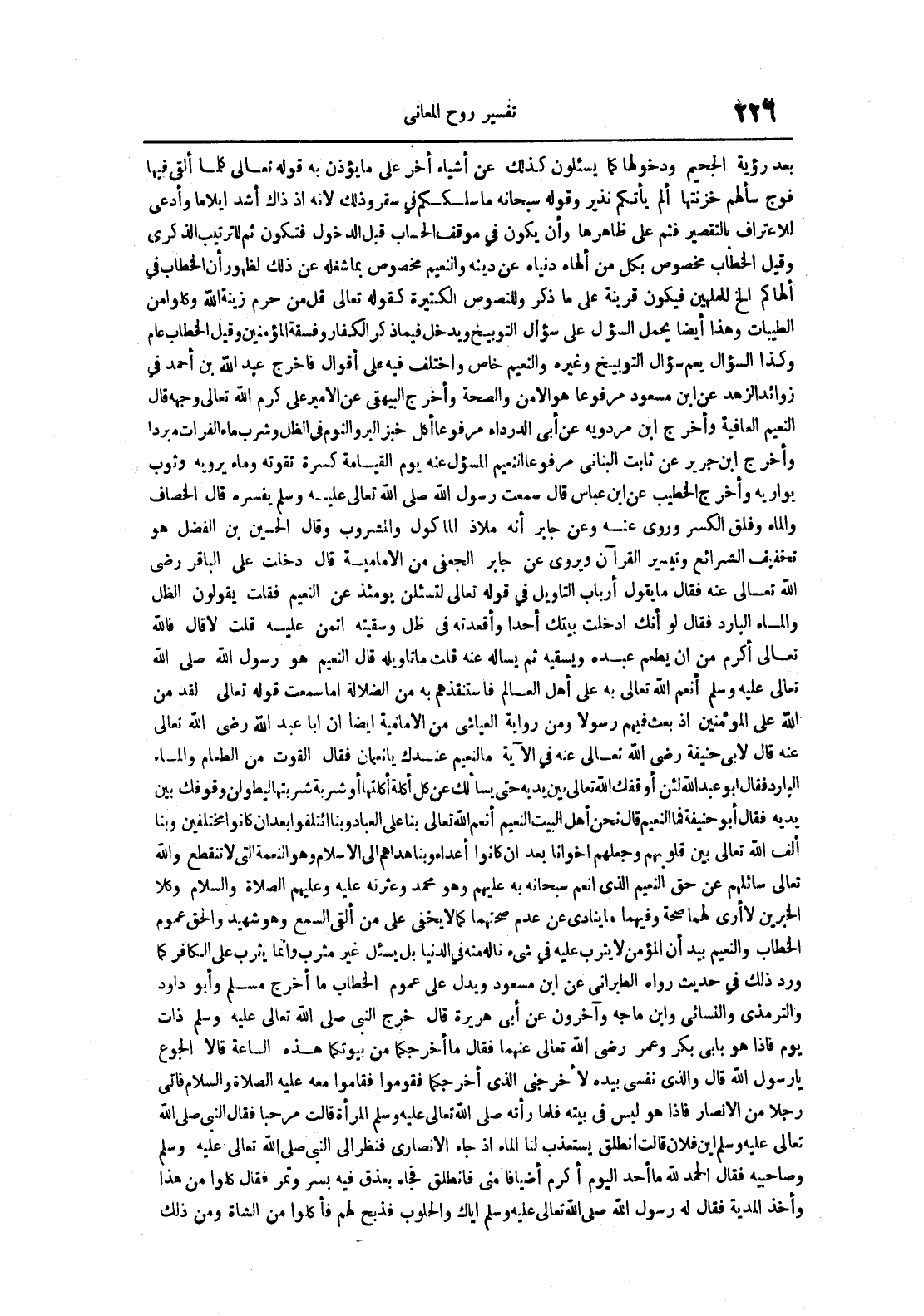 بعد رؤية الجحيم ودخولها كما يسئلون كذلك عن اشياء أخر على مايؤذن به قوله تعالى كلما ألقى فيها فوج سألهم خزنتها ألم يأتكم نذير وقوله سبحانه ماسلككم في سقر وذلك لانه اذ ذاك أشد ايلاما وأدعى للاعتراف بالتقصير فثم على ظاهرها وأن يكون في موقف الحساب قبل الدخول فتكون ثم للترتيب الذكرى وقيل الخطاب مخصوص بكل من ألهاه دنياه عن دينه والنعيم مخصوص بما شغله عن ذلك لظهور أن الخطاب في ألهاكم الخ للملهين فيكون قرينة على ماذكر وللنصوص الكثيرة كقوله تعالى قل من حرم زينة الله وكلوا من الطيبات وهذا أيضا يحمل السؤال على سؤال التوبيخ ويدخل فيما ذكر الكفار وفسقة المؤمنين وقيل الخطاب عام وكذا السؤال يعم سؤال التوبيخ وغيره والنعيم خاص واختلف فيه على أقوال فاخرج عبد الله بن أحمد في زوائد الزهد عن ابن مسعود مرفوعا هو الامن والصحة وأخرج البيهقي عن الامير علي كرم الله تعالى وجهه قال النعيم العافية وأخرج ابن مردويه عن أبي الدرداء مرفوعا أكل خبز البر والنوم في الظل وشرب ماء الفرات مبردا وأخرج ابن جرير عن ثابت البناني مرفوعا النعيم المسئول عنه يوم القيامة كسرة تقوته وماء يرويه وثوب يواريه وأخرج الخطيب عن ابن عباس قال سمعت رسول الله صلى الله عليه و سلم يفسره قال الخصاف والماء وفلق الكسر وروى عنه وعن جابر أنه ملاذ المأكول والمشروب وقال الحسين بن فضل هو تخفيف الشرائع وتيسير القرآن ويروى عن جابر الجعفي من الامامية قال دخلت على الباقر رضى الله تعالى عنه فقال ما يقول أرباب التأويل في قوله تعالى لتسئلن يومئذ عن النعيم فقلت يقولون الظل والماء البارد فقال لو أنك ادخلت بيتك أحدا وأقعدته في ظل وسقيته اتمن عليه قلت لا فقال فالله تعالى أكرم من ان يطعم عبده ويسقيه ثم يسأله عنه قلت ما تأويله قال النعيم هو رسول الله صلى الله تعالى عليه وسلم أنعم الله تعالى به على أهل العالم فاستنقذهم به من الضلالة اما سمعت قوله تعالى لقد من الله على المؤمنين اذ بعث فيهم رسولا ومن رواية العياشي من الامامية ايضا ان ابا عبد الله رضى الله تعالى عنه قال لابي حنيفة رضى الله تعالى عنه في الآية ماالنعيم عندك يانعمان فقال القوت من الطعام والماء البارد فقال ابو عبدالله لئن أوقفك الله تعالى بين يديه حتى يسألك عن كل أكلة أكلتها أو شربة شربتها ليطولن وقوفك بين يديه فقال أبو حنيفة فما النعيم قال نحن أهل البيت النعيم أنعم الله تعالى بنا على العباد وبنا ائتلفوا بعد ان كانوا مختلفين وبنا ألف الله تعالى بين قلوبهم وجعلهم اخوانا بعد ان كانوا أعداء وبنا هداهم الى الاسلام وهو النعمة التي لاتنقطع والله تعالى سائلهم عن حق النعيم الذي انعم سبحانه به عليهم وهو محمد وعترته عليه وعليهم الصلاة والسلام وكلا الخبرين لاأرى لهما صحة وفيهما ما ينادي عن عدم صحتهما كما لايخفى على من ألقى السمع وهو شهيد والحق عموم الخطاب والنعيم بيد أن المؤمن لايثرب عليه في شيء ناله منه في الدنيا بل يسئل غير مثرب وانما يثرب على الكافر كما ورد ذلك في حديث رواه الطبراني عن ابن مسعود ويدل على عموم الخطاب مأخرج مسلم وأبو داود والترمذي والنسائي وابن ماجه وآخرون عن أبي هريرة قال خرج النبي صلى الله تعالى عليه وسلم ذات يوم فاذا هو بأبي بكر وعمر رضى الله تعالى عنهما فقال ما أخرجكما من بيوتكما هذه الساعة قالا الجوع يا رسول الله قال والذي نفسي بيده لأخرجني الذي أخرجكما فقوموا فقاموا معه عليه الصلاة و السلام فاتى رجلا من الانصار فاذا هو ليس في بيته فلما رأته صلى الله تعالى عليه وسلم المرأة قالت مرحبا فقال النبي صلى الله تعالى عليه وسلم اين فلان قالت انطلق يستعذب لنا الماء اذ جاء الانصاري فنظر الى النبي صلى الله تعالى عليه وسلم وصاحبيه فقال الحمد لله ما أحد اليوم أكرم أضيافا مني فانطلق فجاء بعذق فيه بسر وتمر فقال كلوا من هذا وأخذ المدية فقال له رسول الله تعالى عليه وسلم اياك والحلوب فذبح لهم فأكلوا من الشاة ومن ذلك