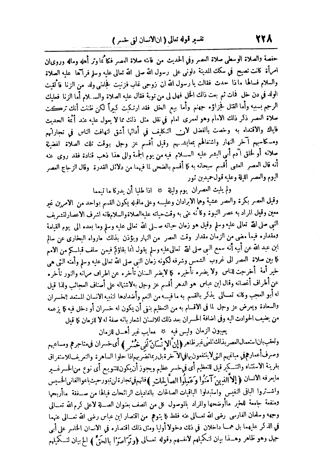 حفصة والصلاة الوسطى صلاة العصر وفي الحديث من فاتته صلاة العصر فكأنما وتر أهله وماله وروى ان امرأة كانت تصيح في سكك المدينة دلوني على رسول الله صلى الله تعالى عليه وسلم فرآها عليه الصلاة و السلام فسألها ماذا حدث فقالت يا رسول الله ان زوجي غاب فزنيت فجاءني ولد من الزنا فألقيت الولد في دن خل فمات ثم بعت ذلك الخل فهل لي من توبة فقال عليه الصلاة و السلام أما الزنا فعليك الرجم بسببه وأما القتل فجزاؤه جهنم وأما بيع الخل فقد اتكبت كبيرا لكن ظننت أنك تركت صلاة العصر ذكر ذلك الامام وهو لعمري امام في نقل مثل ذلك مما لايعول عليه عند أئمة الحديث فاياك والاقتداء به وخصت بالفضل لان التكليف في أدائها أشق لتهافت الناس في تجاراتهم ومكاسبهم آخر النهار واشتغالهم بمعايشهم وقيل أقسم عز و جل بوقت تلك الصلاة لفضيلة صلاته أو لخلق آدم أبي البشر عليه السلام فيه من يوم الجمعة والى هذا ذهب قتادة فقد روى عنه أنه قال العصر العشى أقسم سبحانه به كما أقسم بالضحى لما فيها من دلائل القدرة وقال الزجاج العصر اليوم والعصر الليلة وعليه قول حميد بن ثور ولم يلبث العصران يوم وليلة