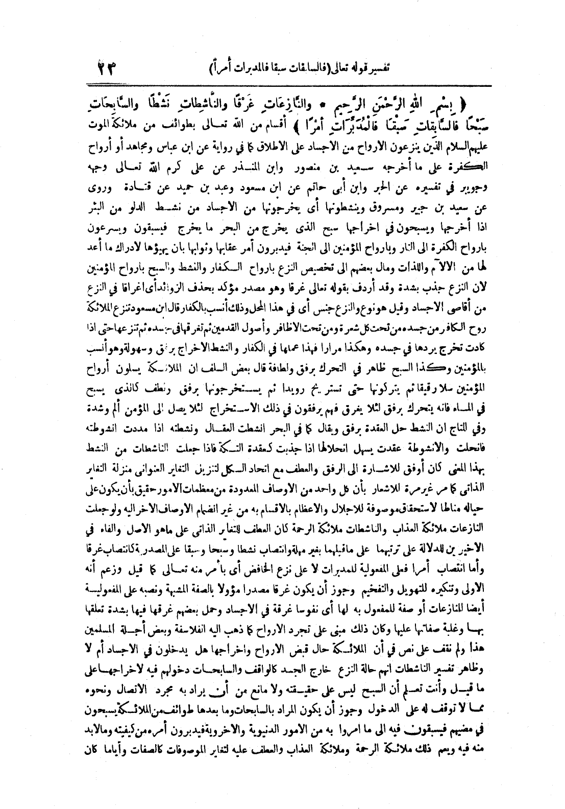 والنازعات غرقا والناشطات نشطا والسابحات سبحا فالسابقات سبقا فالمدبرات أمرا أقسام من الله تعالى بطوائف من ملائكة الموت عليهم السلام الذين ينزعون الأرواح من الأجساد على الأطلاق كما في رواية عن ابن عباس ومجاهد أو أرواح الكفرة على ما أخرجه سعيد بن منصور وابن المنذر عن علي كرم الله تعالى وجهه وجويبر في تفسيره عن الحبر وابن أبي حاتم عن ابن مسعود وعبد بن حميد عن قتادة وروي عن سعيد بن جبير ومسروق وينشطونها أي يخرجونها من الأجساد من نشط الدلو من البئر إذا أخرجها ويسبحون في إخراجها سبح الذي يخرج من البحر ما يخرج فيسبقون ويسرعون بأرواح الكفرة إلى النار وبأرواح المؤمنين إلى الجنة فيدبرون أمر عقابها وثوابها بأن يهيؤها لأدراك ما أعد لها من الآلام واللذات ومال بعضهم إلى تخصيص النزع بأرواح الكفار والنشط والسبح بأرواح المؤمنين لأن النزع جذب بشدة وقد أردف بقوله تعالى غرقا وهو مصدر مؤكد بحذف الزوائد أي إغراقا في النزع من أقاصي الأجساد وقيل هو نوع والنزع جنس أي في هذا المحل وذلك أنسب بالكفار وقال ابن مسعود تنزع الملائكة روح الكافر من جسده من تحت شعرة ومن تحت الأظافر وأصول القدمين ثم تغرقها في جسده ثم تنزعها حتى إذا كادت تخرج يردها في جسده مرارا فهذا عملها في الكفار والنشط الأخراج برفق وسهولة وهو أنسب بالمؤمنين وكذا السبح ظاهر في التحرك برفق ولطافة قال بعض السلف أن الملائكة يسلون أرواح المؤمنين سلا رقيقا ثم يتركونها حتى تستريح رويدا ثم يستخرجونها برفق ولطف كالذي يسبح في الماء فإنه يتحرك برفق لئلا يغرق فهم يرفقون في ذلك الأستخراج لئلا يصل إلى المؤمن ألم وشدة وفي التاج أن النشط حل برفق ويقال كما في البحر انشطت العقال ونشطته إذا مددت أنشوطته فانحلت والأنشوطة عقدت يسهل انحلالها إذا جذبت كعقدة التكة فإذا جعلت الناشطات من النشط بهذا المعنى كان أوفق للأشارة إلى الرفق والعطف مع اتحاد الكل لتنزيل التغايل العنواني منزلة التغاير الذاتي كما مر غير مرة للأشعار بأن كل واحد من الأوصاف المعدودة من معظمات الأمور حقيق بأن يكون على حياله مناطا لاستحقاق موصوفة للأجلال والأعظام بالأقسام به من غير الضمام الأخر إليه ولو جعلت النازعات ملائكة العذاب والناشطات ملائكة الرحمة كان العطف للتغاير الذاتي على ما هو الأصل والفاء في الأخيرين للدلالة على ترتبهما على ما قبلهما بغير مهلة وانتصاب نشطا وسبحا وسبقا على المصدرية كانتصاب غرقا وأما انتصاب أمرا فعلى المفعولية للمدبرات لا على نزع الخافض أي بأمر منه تعالى كما قيل وزعم أنه الأولى وتنكيره للتهويل والتفخيم وجوز أن يكون غرقا مصدرا مؤولا بالصفة المشبهة ونصبه على المفعولية أيضا للنازعات أو صفة للمفعول به لها أي نفوسا غرقة في الأجساد وحمل بعضهم غرقها فيها بشدة تعلقها بها وغلبة صفاتها عليها وكان ذلك مبني على تجرد الأرواح كما ذهب إليه الفلاسفة وبعض أجلة المسلمين هذا ولم نقف على نص في أن الملائكة حال قبض الأرواح وإخراجها هل يدخلون في الأجساد أم لا وظاهر تفسير الناشطات أنهم حالة النزع خارج الجسد كالواقف والسابحات دخولهم فيه لأخراجها علىما قيل وأنت تعلم أن السبح ليس على حقيئته ولا مانع من أن يراد به مجرد الأتصال ونحوه مما لا توقف له على الدخول وجوز أن يكون المراد بالسابحات وما بعدها طوائف من الملائكة يسبحون في مضيهم فيسبقون فيه إلى ما أمروا به من الأمور الدنيوية والأخروية فيدبرون أمره من كيفيته وما لا بد منه فيه ويعم ذلك ملائكة الرحمة وملائكة العذاب والعطف عليه لتغاير الموصوفات وأيا ما كان