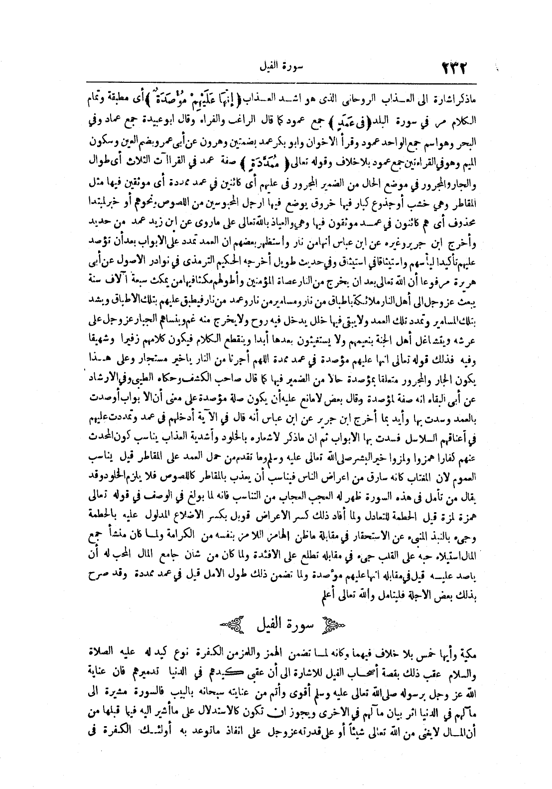ما ذكر اشارة الى العذاب الروحاني الذي هو اشد الذاب انها عليهم مؤصدة أي مطبقة وتمام الكلام مر في سورة البلد في عمد جمع عمود كما قال الراغب والفراء وقال ابو عبيدة جمع عماد وفي وهو اسم جمع الواحد عمود وقرأ الاخوان وابو بكر عمد بضمتين وهرون عن أبي عمر وبضم العين وسكون الميم وهو في القراءتين جمع عمود بلا خلاف وقوال تعالى ممدة صفة عمد في القراآت الثلاث أي طوال والجار والمجرور في موضع الحال من الضمير المجرور في عليهم أي كائنين في عمد ممددة أي موثقين فيها مثل المقاطر وهي خشب أو جذوع كبار فيها خروق يوضع فيها ارجل المحبوسين من اللصوص ونحوهم أو خبر لمبتدأ محذوف أي هم كائنون في عمد موثقون وهي والعياذ بالله تعالى على ماروى عن ابن زيد عمد من حديد وأخرج ابن جرير وغيره عن ابن عباس انها من نار واستظهر بعضهم ان العمد تمدد على الابواب بعد أن تؤصد عليهم ليأسهم واستيثاق وفي حديث طويل أخرجه الحكيم الترمذي في نوادر الاصول عن أبي هريرة مرفوعا أن الله تعالى بعد ان يخرج من النار عصاة المؤمنين وأطولهم مكثا فيها من يمكث سبعة آلاف سنة يبعث عز و جل الى أهل النار ملائكة باطباق من نار ومسامير من نار وعمد من نار فيطبق عليهم بتلك الاطباق ويشد بتلك المسامير وتمدد تلك العمد ولايبقى فيها خلل يدخل فيه روح ولايخرج منه غم وينساهم الجبار عز و جل على عرشه ويتشاغل أهل الجنة بنعيمهم ولايستثيغون بعدها أبدا وينقطع الكلام فيكون كلامهم زفيرا وشهيقا وفيه فذلك قوله تعالى انها عليهم مؤصدة في عمد ممدة اللهم أجرنا من النار ياخير مستجار وعلى هذا يكون الجار والمجرور متعلقا بمؤصدة حالا من الضمير فيها كما قال صاحب الكشف وحكاه الطيبي وفي الارشاد عن أبي البقاء انه صفة لمؤصدة وقال بعض لامانع عليه أن يكون صلة مؤصدة على معنى أن الابواب أوصدت بالعمد وسدت بها وأيد بما أخرج ابن جرير عن ابن عباس أنه قال في الآية أدخلهم في عمد وتمددت عليهم في أعناقهم السلاسل فسدت بها الابواب ثم ان مذكر لاشعاره بالخلود وأشدية العذاب يناسب كون المحدث عنهم كفارا همزوا ولمزوا خير البشر صلى الله تعالى عليه وسلم وما تقدم من حمل العمد على المقاطر قيل يناسب العموم لان المغتاب كانه سارق من اعراض الناس فيناسب أن يعذب بالمقاطر كاللصوص فلا يلزم الخلود وقد يقال من تأمل في هذه السورة ظهر له العجب العجاب من التناسب فانه لما بولغ في الوصف في قوله تعالى همزة لمزة قيل الحطمة للتعادل ولما أفاد ذلك كسر الاعراض قوبل بكسر الاضلاع المدلول عليه بالحطمة وجىء بالنبذ المنبىء عن الاستحقار في مقابلة ماظن الهامز اللامز بنفسه من الكرامة ولما كان منشأ جمع المال استيلاء حبه على القلب جىء في مقابلة تطلع على الافئدة ولما كان من شأن جامع المال المحب له أن ياصد عليه قيل في مقابلة انها عليهم مؤصدة ولما تضمن ذلك طول الامل قيل في عمد ممددة وقد صرح بذلك بعض الاجلة فليتامل والله تعالى أعلم