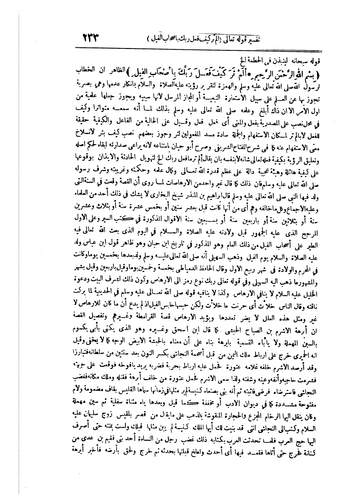 في قوله سبحانه لينبذن في الحطمة الخ بسم الله الرحمن الرحيم ألم تر كيف فعل ربك بأصحاب الفيل الظاهر ان الخطاب لرسول الله صلى الله تعالى عليه وسلم والهمزة لتقرير رؤيته عليه الصلاة و السلام بانكار عدمها وهى بصرية تجوز بها عن العلم على سبيل الاستعارةالتبعية أوالمجاز المرسل لانها سببيه ويجوز جعلها علمية من اول الامرالا ان ذاك أبلغ وعلمه صلى الله تعالى عليه وسلم بذلك لما أنه سعه متواترا وكيف في محل نصب على المصدرية بفعل والمعنى أي فعل فعل وقيل على الحالية من الفاعل واكيفية حقبقة للفعل لابا لم تر لمكان الاستفهام والجملة سادة مسد المفعولين لتر وجوز بعضهم نصب كيف بتر لانسلاخ معنى الاستفهام عنه كما في شرح المفتاح الشريفي وصرح أبو حيان بامتناعه لانه يراعى صدارته ابقاء لحكم اصله وتعليق الرؤية بكيفية فعله تعالى شانه لابنفسه بان يقال الم تر مافعل ربك الخ لتهويل الحادثة والايذان بوقوعها على كيفية هائلة وهيئة عجيبة دالة على عظم قدرة الله تعالى وكمال علمه وحكمته وغريبته وشرف رسوله صلى الله تعالى عليه وسلم فان ذلك كما قال غير واحد من الارهاصات لما روى ان القصة وقعت في السنة اتي ولد فيها النبي صلى الله تعالى عليه وسلم قال ابراهيم بن المنذر شيخ البخاري لايشك في ذلك أحد من العلماء وعليه الاجماع وكل ماخالفه وهم أي من أنها كانت قبل بعشر سنين أو بخمس عشرة سنة أو بثلاث وعشرين سنة أو بثلاثين سنة أو بأربعين سنة أو بسبعين سنة الاقوال المذكورة في كتب السير وعلى الاول المرجح الذي عليه الجمهور قبل ولادته عليه الصلاة و السلام في اليوم الذي بعث الله تعاى فيه الطير على اصحاب الفيل من ذلك العام وهوالمذكور في تاريخ ابن حبان وهو ظاهر قول ابن عباس ولد عليه الصلاة و السلام يوم الفيل وذهب السهيلي أنه صلى الله تعالى عليه وسلم ولد بعدها بخمسين يوما وكانت في المحرم والولادة في شهر ربيع الاول وقال الحافظ الدمياطي بخمسة وخمسن يوما وقيل باربعين وقيل بشهر والمشهور ماذهب اليه السهيلي وفي قوله تعالى ربك نوع رمز الى الارهاص وكون ذلك لشرف البيت ودعوة الخليل عليه السلام لاينافي الارهاص وكذا لاينافيه قوله صلى الله تعالى عليه وسلم في الحديبية لما بركت ناقته وقال الناس خلأت أي حزنت ماخلأت ولكن حبسها حابس الفيل اذ لم يدع أن ما كان للارهاص لاغير ومثل هذه العلل الايض تعددها ويؤيد الارهاص قصة القرامطة وغيرهم وتفصيل القصة أن ابرهة الاشرم بن الصباح الحبشي كما قال ابن اسحق وغيره وهو الذي يكنى بأبي يكسوم بالسين المهملة ولايأباه التسمية بابرهة بناء على أن معناه بالحبشة الابيض الوجه كما لايخفى وقيل أنه الحميري خرج على ارباط ملك اليمن من قبل أصحمة النجاشي بكسر النون بعد سنتين من سلطانه فتبارزا وقد أرصد الاشرم خلفه غلامه عتورة فحما عليه ارباط بحرية فضربه يريد يافوخه فوقعت على جبهته فشرمت حاجبه وأنفه وعينه وشفته ولذا سمي الاشرم فحمل عتورة من خلف أبرهة فقتله ملك مكانه فغضب النجاشي فاسترضاه فرضى فاثبته ثم أنه بنى بصنعاء كنيسة لم يرى مثلها في زمانها القليس سماها بقاف مضمومة ولام مفتوحة مشددة كما في ديوان الادب أو مخففة كما قيل وبعدها ياء مثناة سفلية ثم سين مهملة وكان ينقل اليها الرخام المجزع والحجارة المنقوشة بالذهب على مايقال من قصر بلقيس زوج سليمان عليه السلام وكتب الى النجاشى انني قد بنيت لك أيها الملك كنيسة لم يبنى مثلها قبلك ولست بمنته حتى أصرف اليها حج العرب فلما تحدثت العرب بكتابه ذلك غضب رجل من النساءة أحد بني فقيم ابن عدي من كنانة فخرج حتى أتاها فقعد فيها أي أحدث ولطخ قبلتها بحدثه ثم خرج ولحق بأرضه فأخبر أبرهة