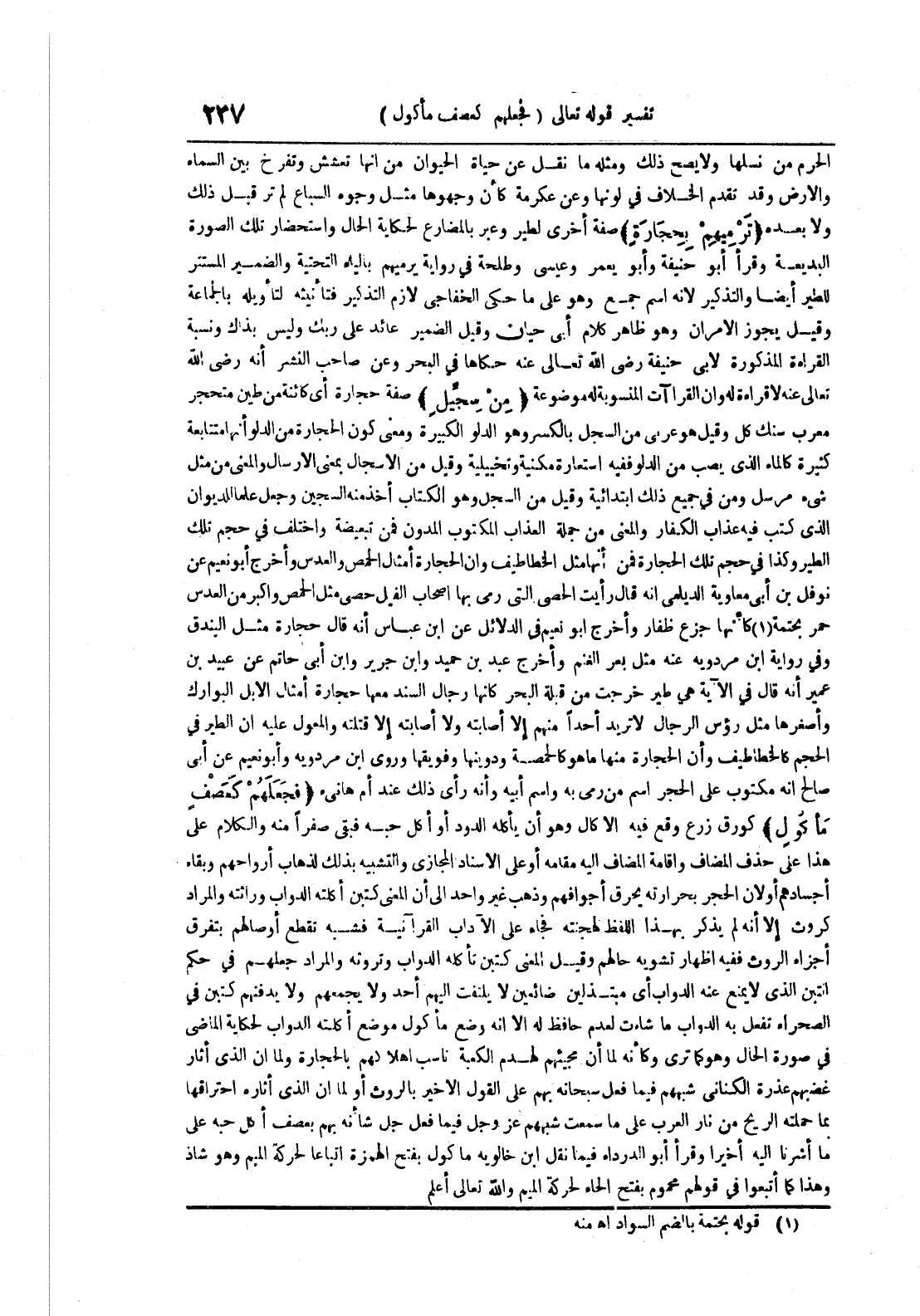 الحرم من نسلها ولايصح ذلك ومثله مانقل عن حياة الحيوان من انها تعشعش وتفررخ بين السماء والارض وقد تقدم الخلاف في لونها وعن عكرمة كأن وجوهوها مثل وجوه اسباع لم تر قبل ذلك ولابعده ترميهم يحجارة صفة أخرى لطير وعبر بالمضارع لحكاية الحال واستحضار تلك الصورة البديعة وقرأ أبو وأبو يعمر وعيسى وطلحة فى رواية يرميهم بالباء التحتية والضمير المستتر للطير أيضا والتذكير لانه اسم جمع وهو على ماحكى الخفاجى لازم التذكير فتأنيثه لتأويله بالجماعة وقيل يجوز الامران وهو ظاهر كلام أبى حيان وقيل الضمير عائد على ربك وليس بذاك ونسبة القراءة امذكورة لابى حنيفة رضى الله تعالى عنه حكاها فى البحر وعن صاحب النشر أنه رضى الله تعالى عنه لاقراءة له وان القراآت المنسوبة له موضوعة من سجيل صفة حجارة أى كائنة من طين متحجر معرب سنك كل وقيل هو عربى من السجل بالكسر وهو الدلو الكبيرة ومعنى كون الحجارة من الدلو أنها متتابعة كثيرة كالماء الذى يصب من الدلو ففيه استعارة مكنية وتخييلية وقيل من الاسجال بمعنى الارسال والمعنى من مثل شىء مرسل ومن فى جميع ذلك ابتدائية وقيل من السجل وهو الكتاب أخذ من السجين وجعل علما للديوان 3 الذى كتب فيه عذاب الكفار والمعنى من جملة العذاب المكتوب المدون فمن تبضيعية واختلف في حجم الطير وكذا فى حجم تلك الحجارة فمر أنها مثل الخطاطيف وان الحجارة أمثال الحمص والعدس وأخرج أبو نعيم عن نوفل بن أبى معاوية الديلمى انه قال رأيت الحصى التى رمى بها اصحاب الفيل حصى مثل الحمص واكبر من العدس حمر بحتمة 1 كأنها جزع ظفار وأخرج أبو نعيم فى الدلائل عن ابن عباس أنه قال حجارة مثل البندق وفى رواية ابن مردويه عنه مثل بعر الغنم وأخرج عبد بن حميد وابن جرير وابن أبى حاتم عن عبيد بن عمير أنه قال فى الآية هى طير خرجت من قبلة البحر كانها رجال السند معها حجارة أمثال الابل البوارك وأصغرها مثل رؤس الرجال أصابته ولاأصابته الا قتلته والمعول عليه ان الطير فى الحجم كالخطاطيف وأن الحجارة منها ماهو كالحمصة ودوينها وفويقها وروى ابن مردويه وأبو نعيم عن أبى صالح انه مكتوب على الحجر اسم من رمى به واسم أبيه رأى ذلك عند أم هانىء فجعلهم كعصف مأكول كورق زرع وقع فيه الاكال وهو أن يأكله الدود أوأكل حبه فبقى صفرا منه والكلام على هذا على حذف المضاف واقامة المضاف اليه مقمه أو على الاسناد المجازي والتشبيه بذلك لذهاب أرواحهم وبقاء أجسادهم أو لان الحجر بحرارته يحرق أجوافهم وذهب غير واحد الى أن المعنى كتبن أكلته الدواب وراثته والمراد كروث الا انه لم يذكر بهذا اللفظ لهجنته فجاء على الاداب القرآنية فشبه تقطع أوصالهم بتفرق أجزاء الروث ففيه اظهار تشويه حالهم وقيل المعنى كتبن تأكله الدواب وتروثه والمراد جعلهم في حكم التبن الذي لايمنع عنه الدواب أي مبتذلين ضائعين لايلتفت اليم أحد ولايجمعهم ولايدفنهم كتبن في الصحراء تفعل به الدواب ماشاءت لعدم حافظ له الا انه وضع مأكول موضع اكلته الدواب لحكاية الماضي في صورة الحال وهو كما ترى وكأنه لما أن مجيئهم لهدم الكعبة ناسب اهلاكهم بالحجارة ولما أن الذي أثار غضبهم عذرة الكناني شبهم فيما فعل سبحانه بهم على القول الاخير بالروث أو لما ان الذي أثاره احتراقها لما حملته الريح من نار العرب على ماسمعت شبهم عز و جل فيما فعل جل شأنه بهم بعصف أكل حبه على ماأشرنا اليه أخيرا وقرأ أبو الدرداء فيما نقل ابن خالويه ماكول بفتح الهمزة اتباعا لحركة الميم وهو شاذ وهذا كما اتبعوا في قولهم محموم بفتح الحاء لحركة الميم والله تعالى أعلم