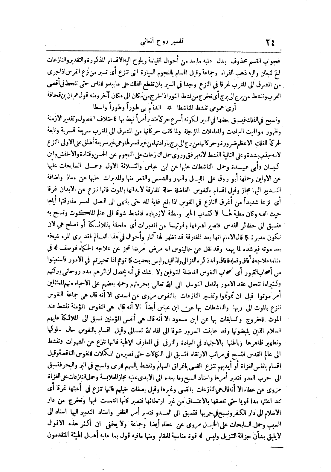 الشأم بي طورا وطورا واسطا وتسبح في الفلك فيسبق بعضها في السير لكونه أسرع حركة فتدبر أمرا نيط بها كاختلاف الفصول وتقدير الأزمنة وظهور مواقيت العبادات والمعاملات المؤجلة ولما كانت حركاتها من المشرق إلى المغرب سريعة قسرية وتابعة لحركة الفلك الأعظم ضرورة وحركاتها من برج بإراداتها من غير قسر لها وهي غير سريعة أطلق على الأولى النزع لأنه جذب بشدة وعلى الثانية النشط لأنه برفق وروي حمل النازعات على النجوم عن الحسن وقتادة والأخفش وابن كسيان وأبي عبيدة وحمل الناشطات عليها عن ابن عباس والثلاثة الأول وحمل السابحات عليها عن الأولين وحملها أبو روق على الليل والنهار والشمس والقمر منها والمدبرات عليها من معاذ وإضافة التدبير إليها مجاز وقيل إقسام بالنفوس الفاضلة حالة المفارقة لا بد أنها بالموت فإنها تنزع عن الأبدان غرقا أي نزعا شديدا من أغرق النازع في النفوس إذا بلغ غاية المد ينتهي إلى النصل لعسر مفارقتها أياها حيث الفنه وكان مطية لها لاكتساب الخير ومظنة لازدياده فتنشط شوقا إلى عالم الملكوت وتسبح به فتسبق به حظائر القدس فتصير لشرفها وقوتها من المدبرات أي ملحقة بالملائكة أو تصلح هي لأن تكون مدبرة كما قال الإمام أنها بعد المفارقة قد تظهر لها آثار وأحوال في هذا العالم فقد يرى المرء شيخه بعد موته فيرشده لما يهمه وقد نقل على جالينوس أنه مرض مرضا عجز عن علاجه الحكماء فوصف له في منامه علاجه فأفاق وفعله فأفاق وقد ذكره الغزالي ولذا قيل وليس بحديث كما توهم تحيرتم في الأمور فاستعينوا من أصحاب القبور أي أصحاب النفوس الفاضلة المتوفين ولا شك في أنه يحصل لزائرهم مدد روحاني ببركتهم وكثيرا ما تنحل عقد الأمور بأنامل التوسل إلى الله تعالى بحرمتهم وحمله بعضهم على الأحياء المتمثلين أمر موتوا وقيل أن تموتوا وتفسير النازعان بالنفوس مروي عن السدي إلا أنه قال هي جماعة النفوس تنزع بالموت إلى ربها والناشطات بها عن ابن عباس أيضا ألا أنه قال هي النفوس المؤمنة تنشط عند الموت للخروج والسابقات بها عن ابن مسعود إلا أنه قال هي أنفس المؤمنين إلى الملائكة عليهم السلام والذين يقبضونها وقد عاينت السرور شوقا إلى لقاء الله تعالى وقيل إقسام بالنفوس حال سلوكها وتطهير ظاهرها وباطنها بالأجتهاد في العبادة والترقي في المعارف الإلهيو فإنها تنزع عن الشهوات وتنشط إلى عالم القدس فتسبح في مراتب الأرتقاء فتسبق إلى الكمالات حتى تصير من المكملات للنفوس الناقصة وقيل إقسام بأنفس الغزاة أو أيديهم تنزع القسى بإغراق السهام وتنشط بالسهم للرمي وتسبح في البر والبحر فتسبق إلى حرب العدو فتدبر أمرها وإسناد السبح ومابعده إلى الأيدي عليه مجاز للملابسة وحمل النازعات على الغزاة مروي عنعطاء إلا أنه قال هي النازعات بالقسى وغيرها وقيل بصفات خيلهم فإنها تنزع في أعنتها غرقا أي أعنتها مدا قويا حتى تلصقها بالأعناق من غير ارتخائها فتصير كأنها انغمست فيها وتخرج من دار الإسلام إلى دار الكفر وتسبح في جريها فتسبق إلى العدو فتدبر أمر الظفر وإسناد التدبير إليها إسناد إلى السبب وحمل السابحات على الخيل مروي عن عطاء أيضا وجماعة ولا يخفى أن أكثر هذه الأقوال لا يليق بشأن جزالة التنزيل وليس له قوة مناسبة للمقام ومنها ما فيه قول بما عليه أهل الهيئة المتقدمون