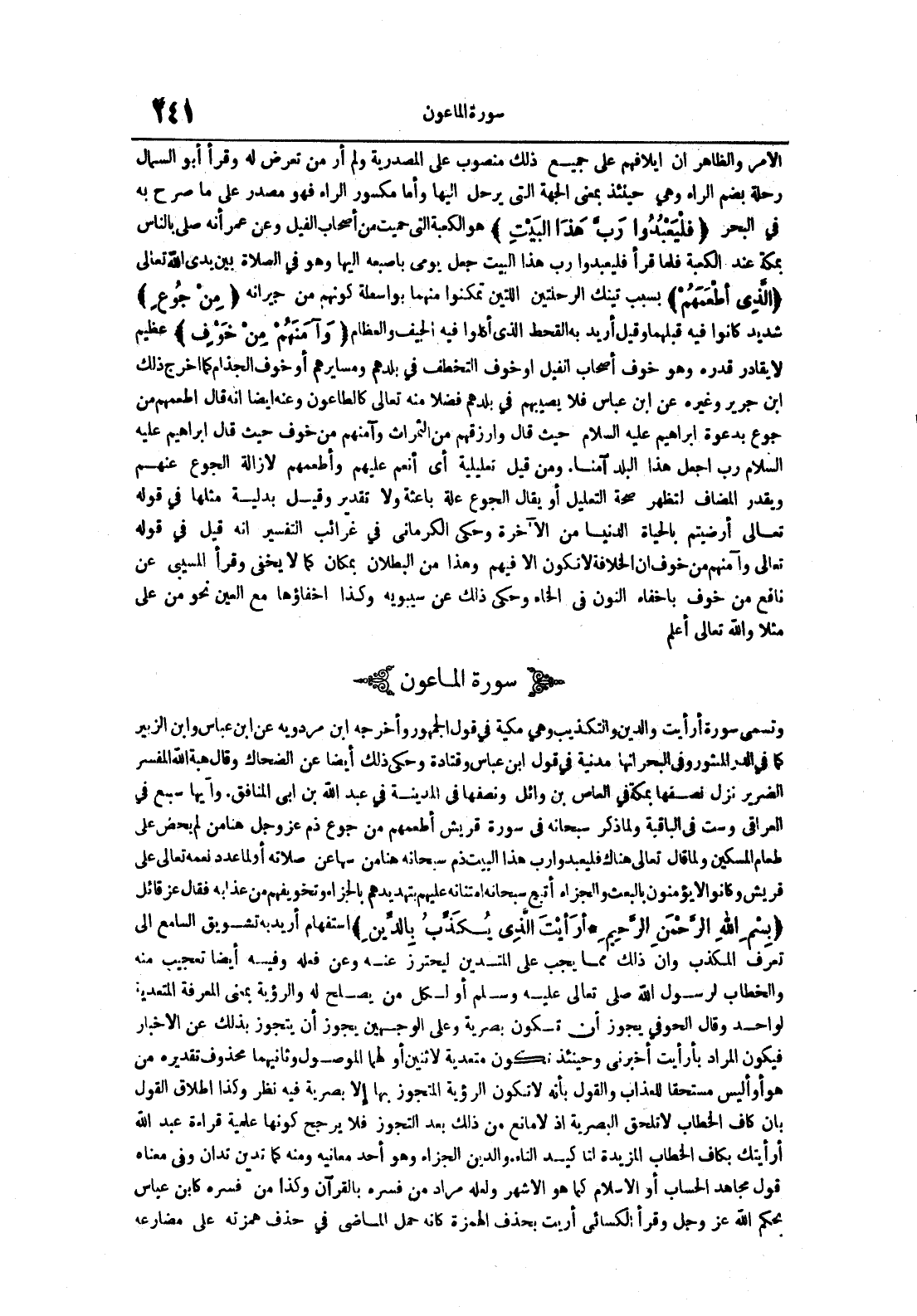 وتسمى سورة أرأيت والدين والتكذيب وهي مكية في قول الجمهور وأخرجه ابن مردويه عن ابي عباس وابن والزبير كما في الدر المنثور وفي البحر انها مدنية في قول ابن عباس وقتادة وحكى ذلك أيضا عن الضحاك وقال هبة الله المفسر الضرير نزل نصفها بمكة في العاص بن وائل ونصفها في المدينة في عبد الله أبن أبي المنافق 0 وآيها سبع في العراقى وست في الباقية ولما ذكر سبحانه في سورة قريش أطعمهم من جوع ذم عز و جل هنا من لم يحض على طعام المسكين ولما قال تعالى هناك فليعبدوا رب هذا البيت ذم سبحانه هنا من سها عن صلاته أو لما عدد نعمة الله على قريش وكانوا لايؤمنون بالبعث والجزاء أتبع سبحانه امتنانه عليهم بتهديدهم بالجزاء وتخويفهم من عذابه فقال عز من قائل بسم الله الرحمن الرحيم